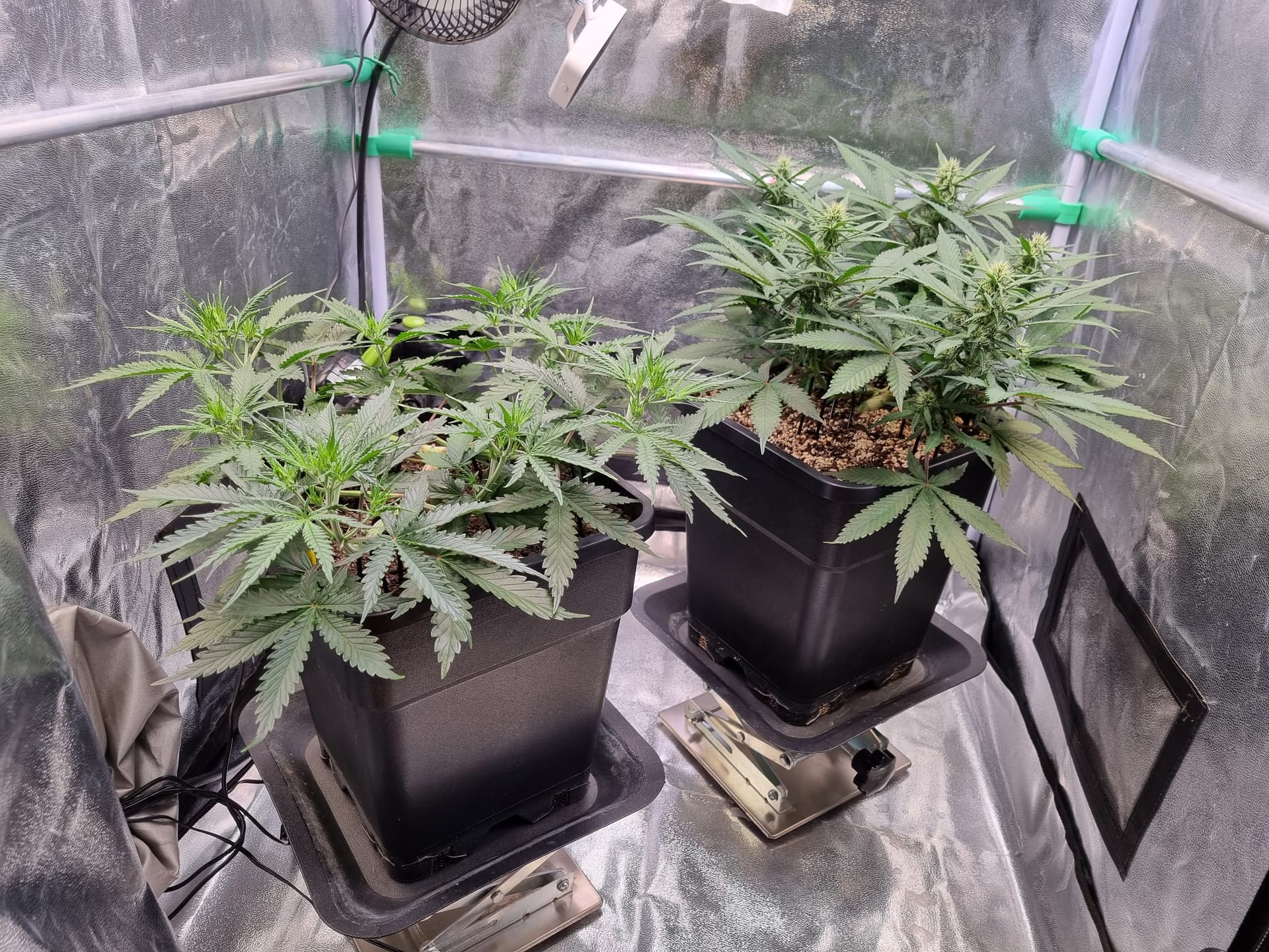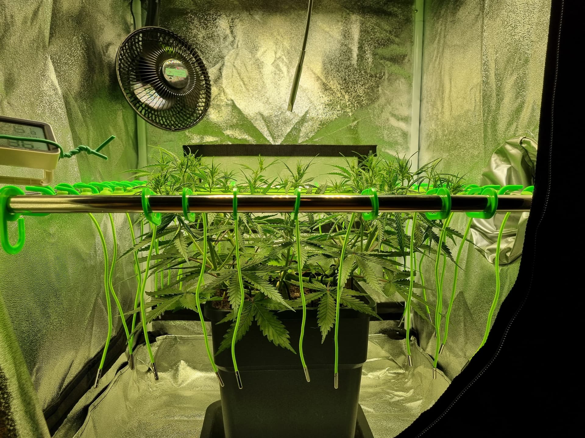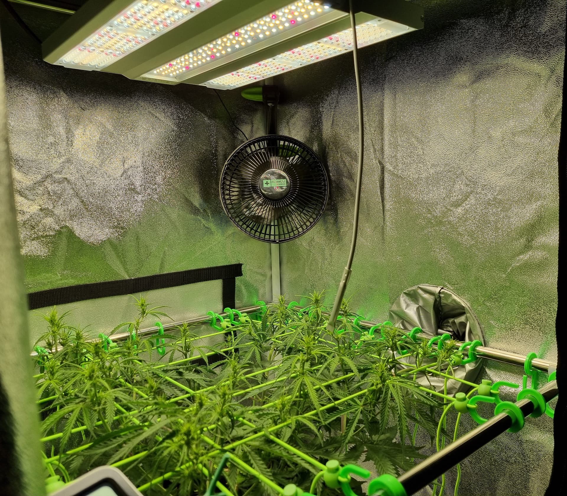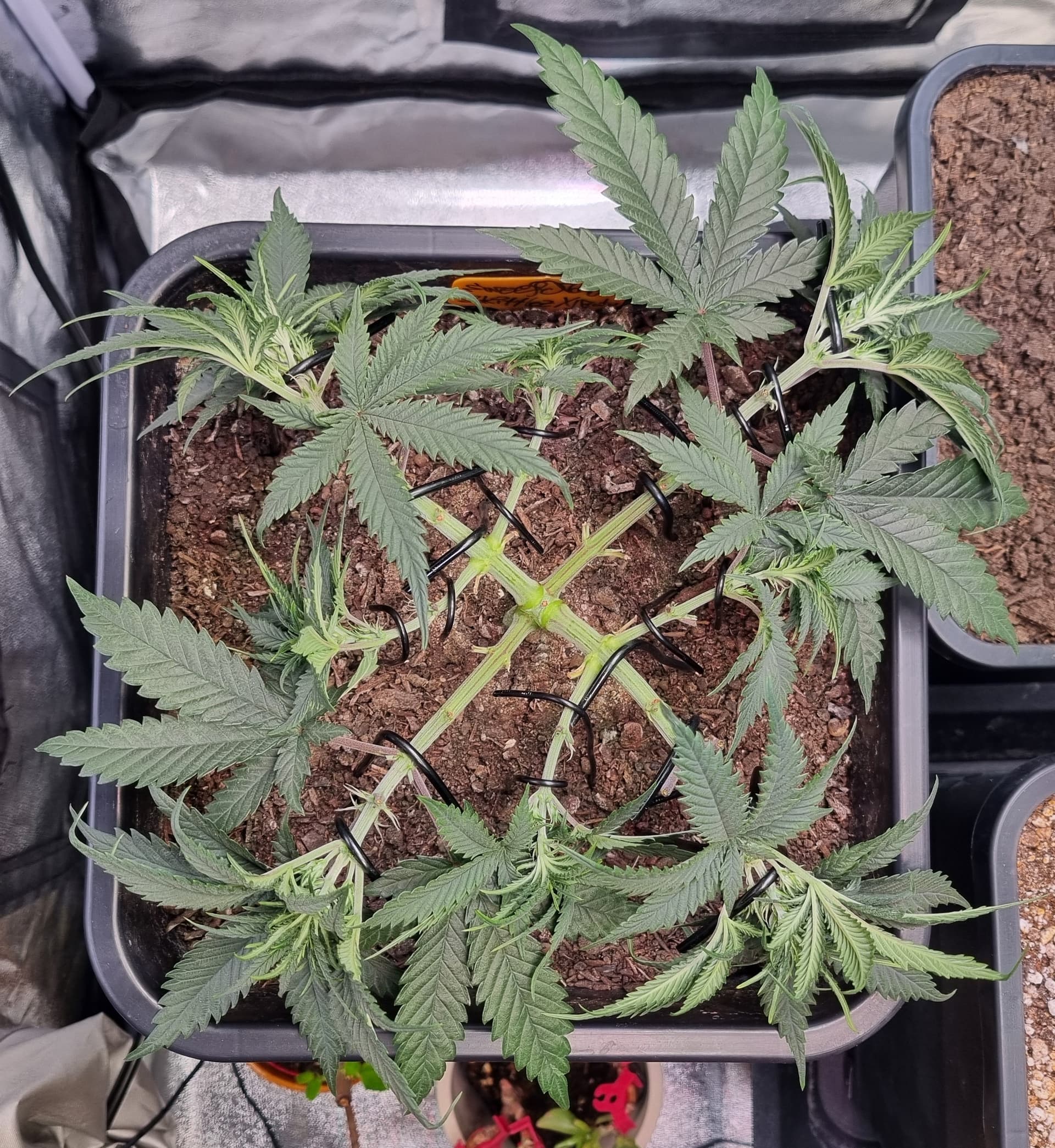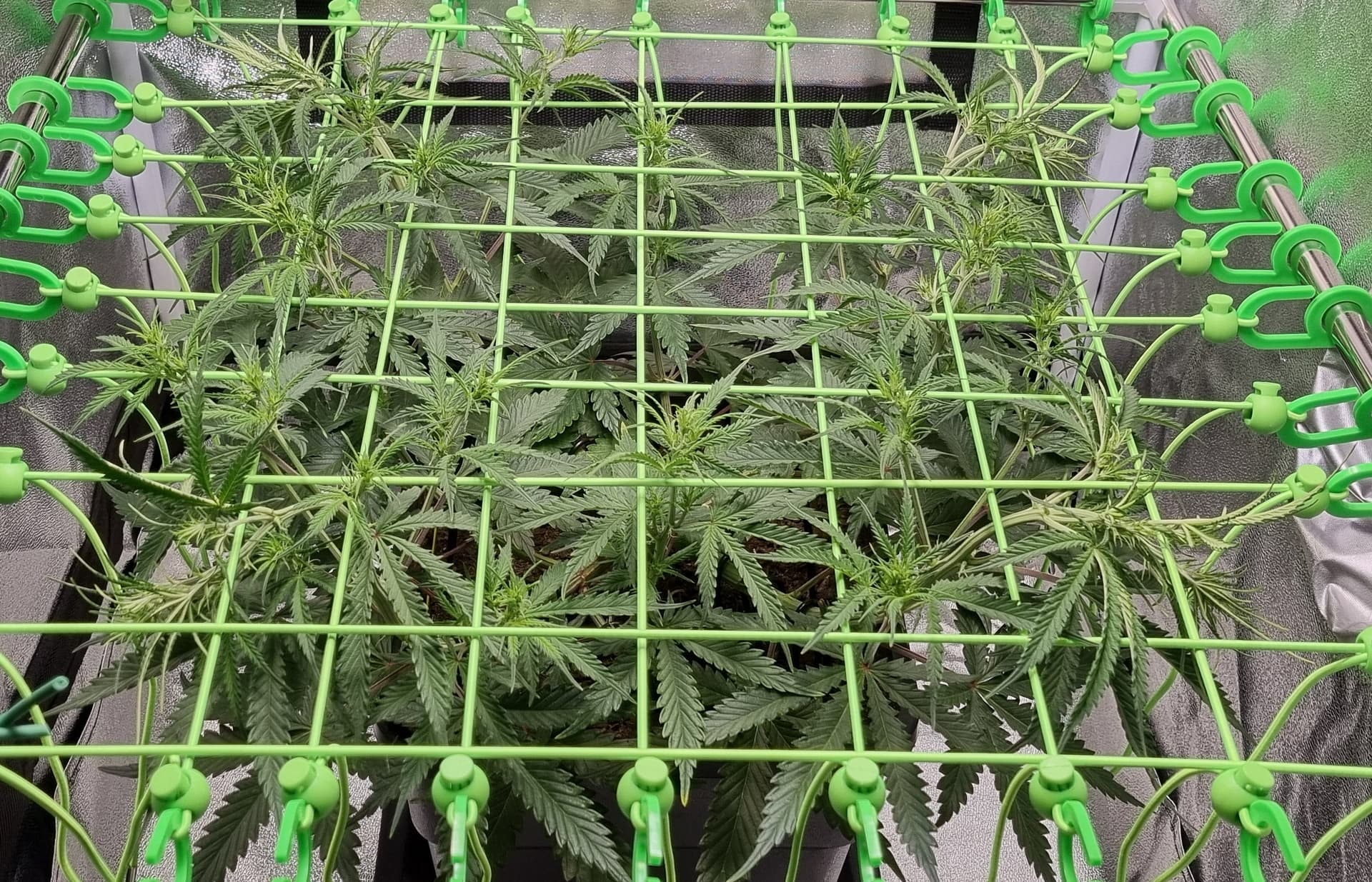 Tag 32, abgesehen vom sehr gemächlichen Wuchs melden sich Adlerkrallen oben rechts in der Ecke, scheinbar überdüngt: