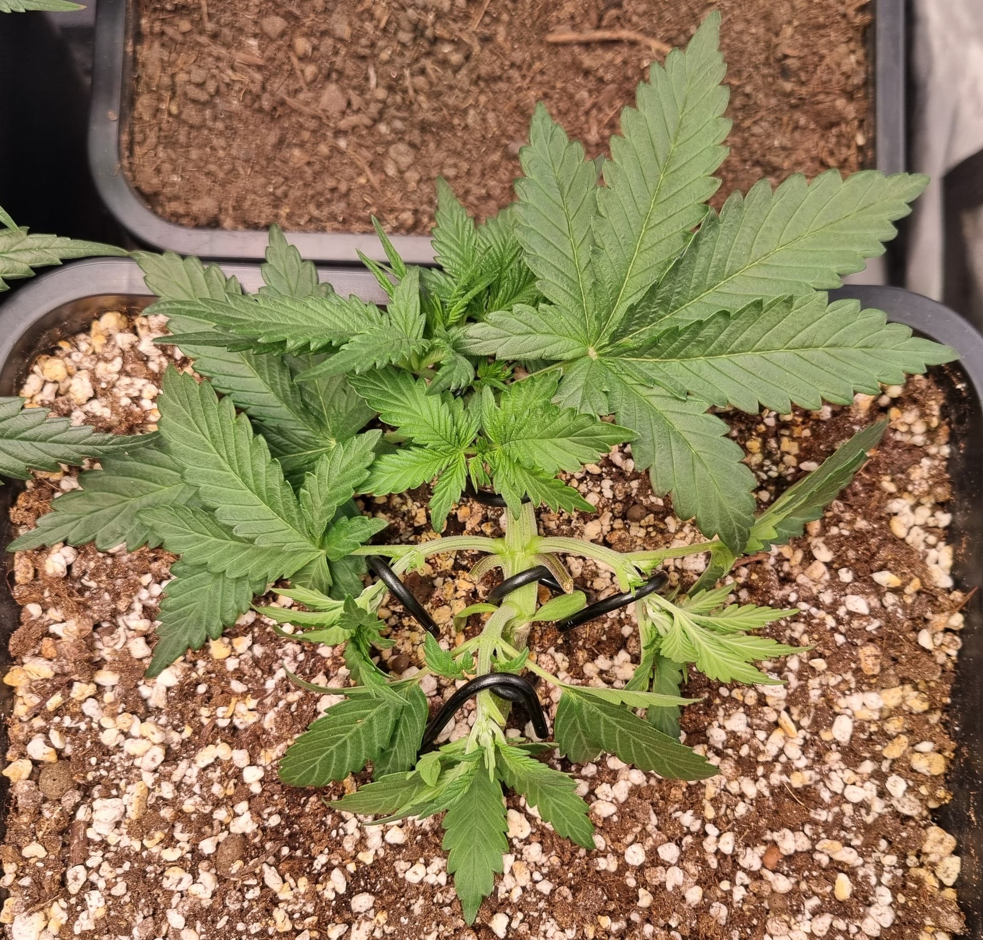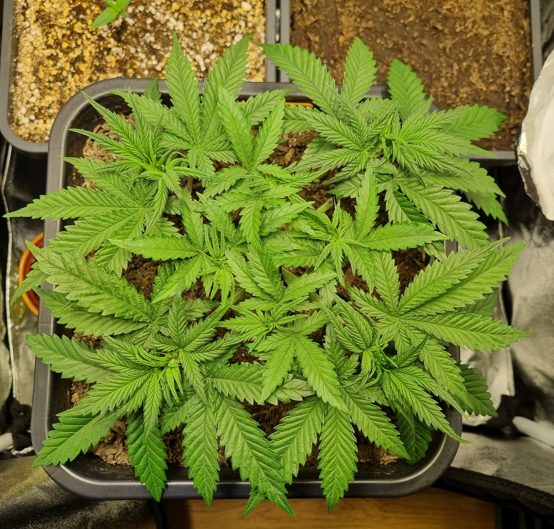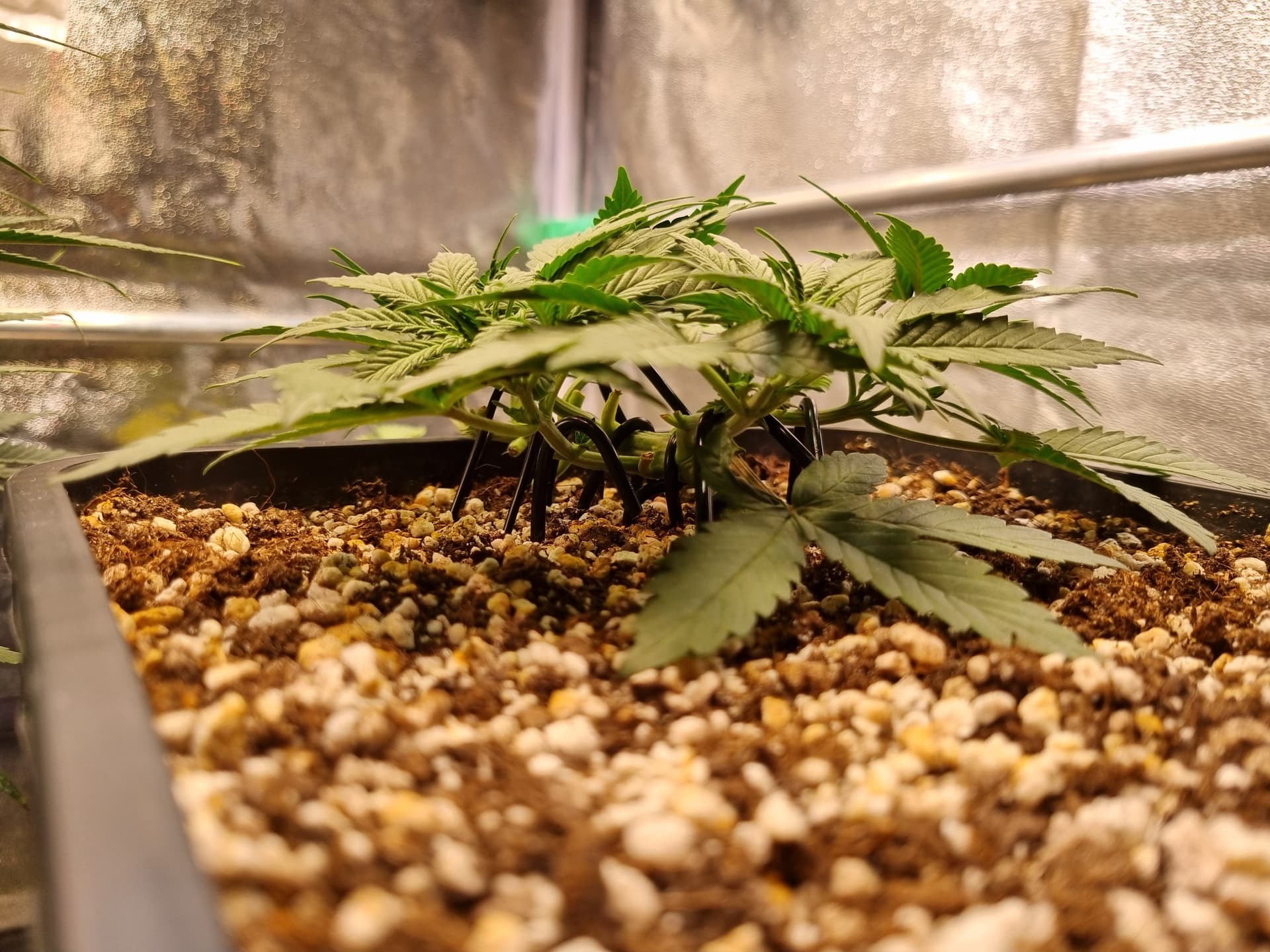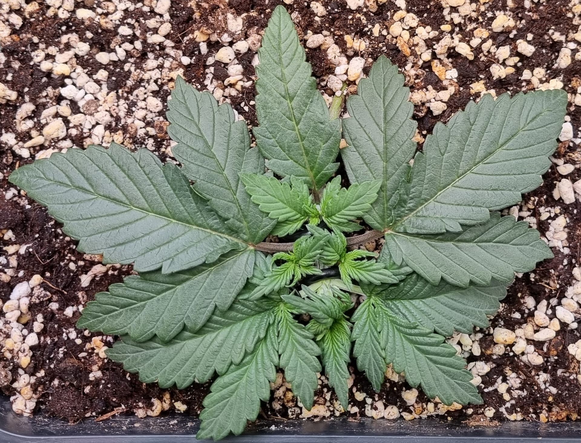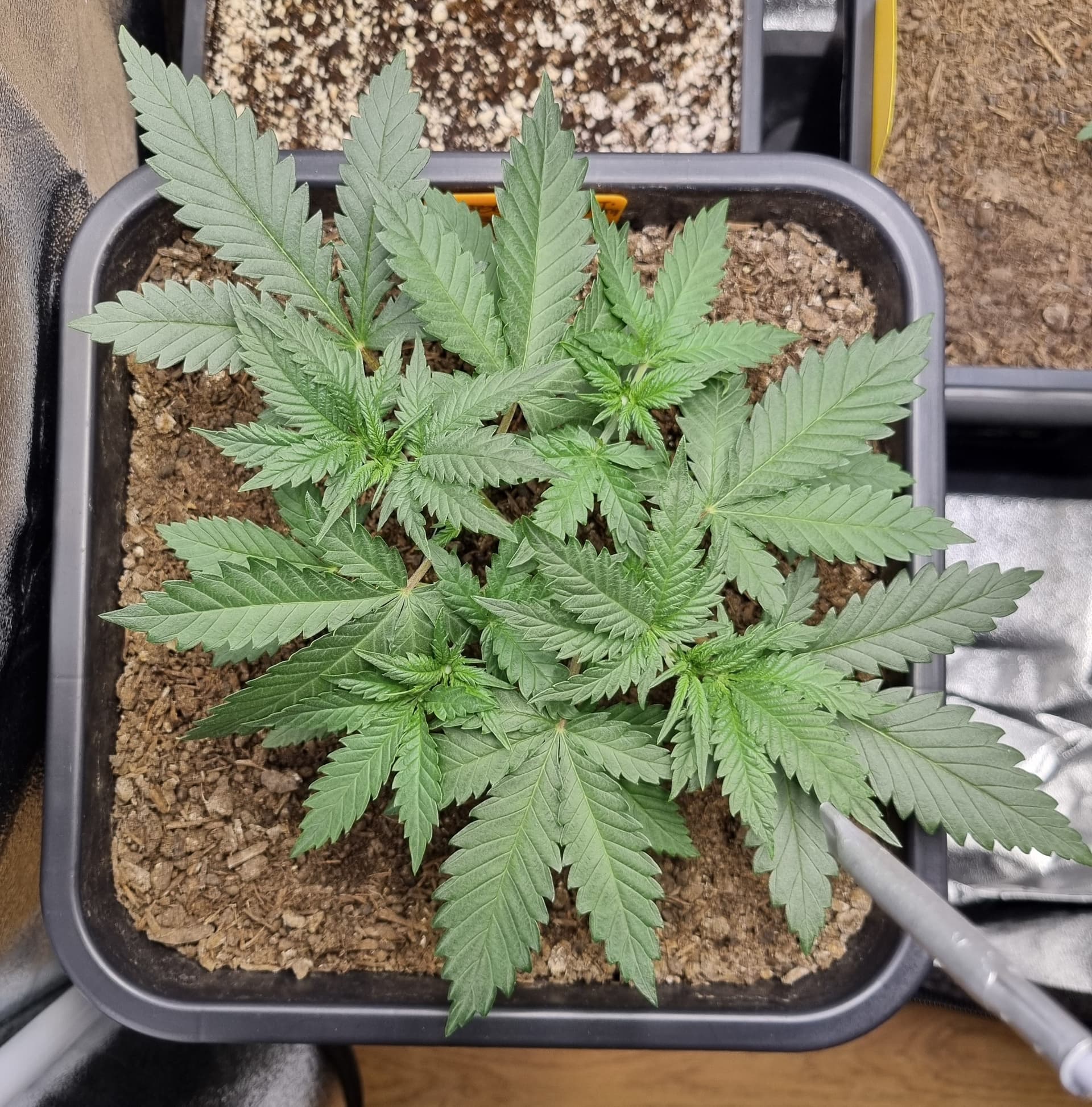 Die Erde besteht zu gleichen Teilen aus Perlite und BB Light Mix, wieder im 11L Pot, Tag 7: