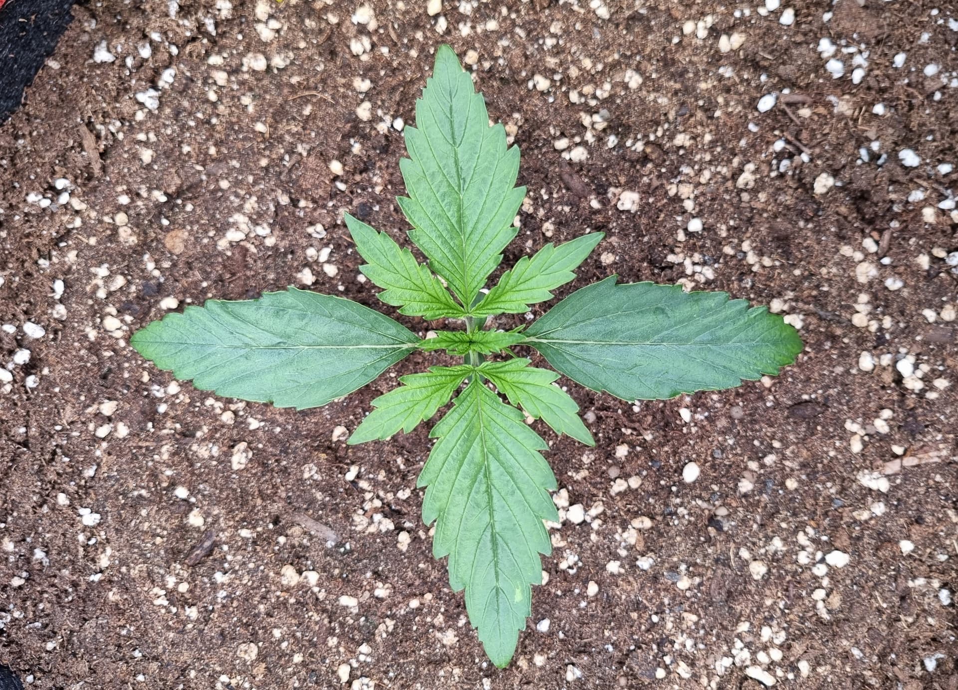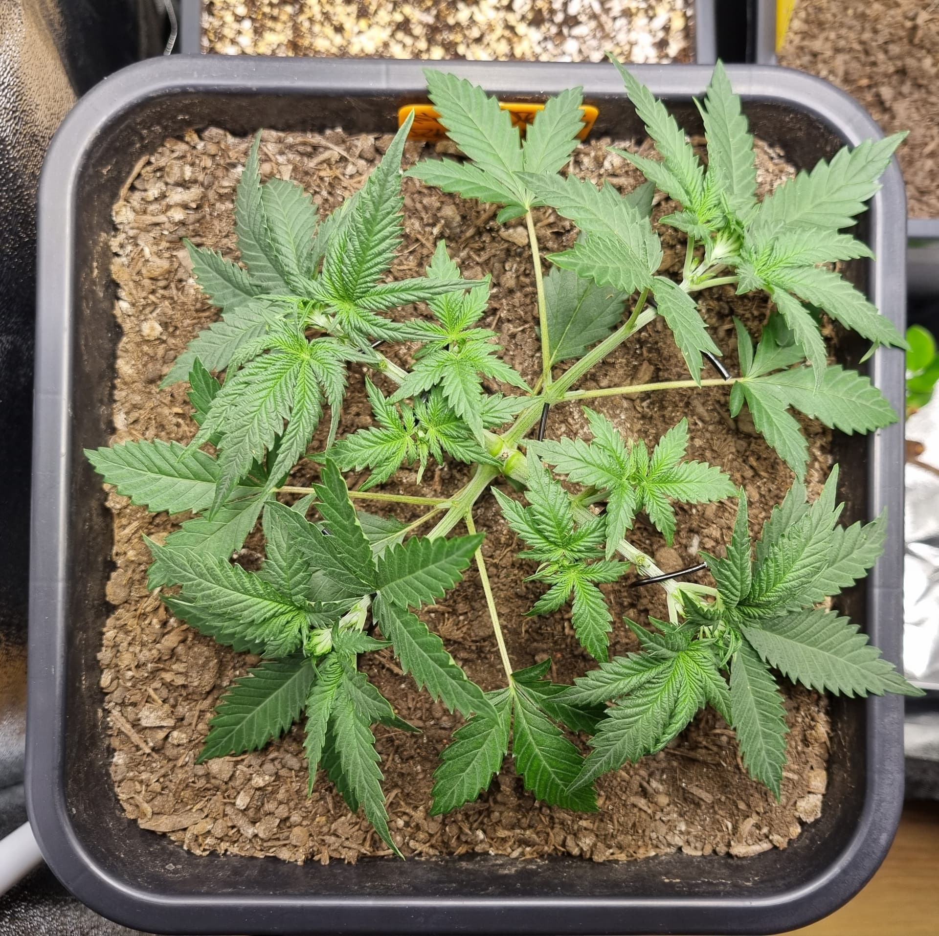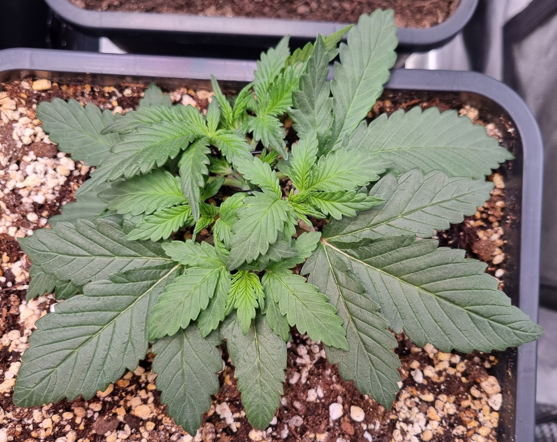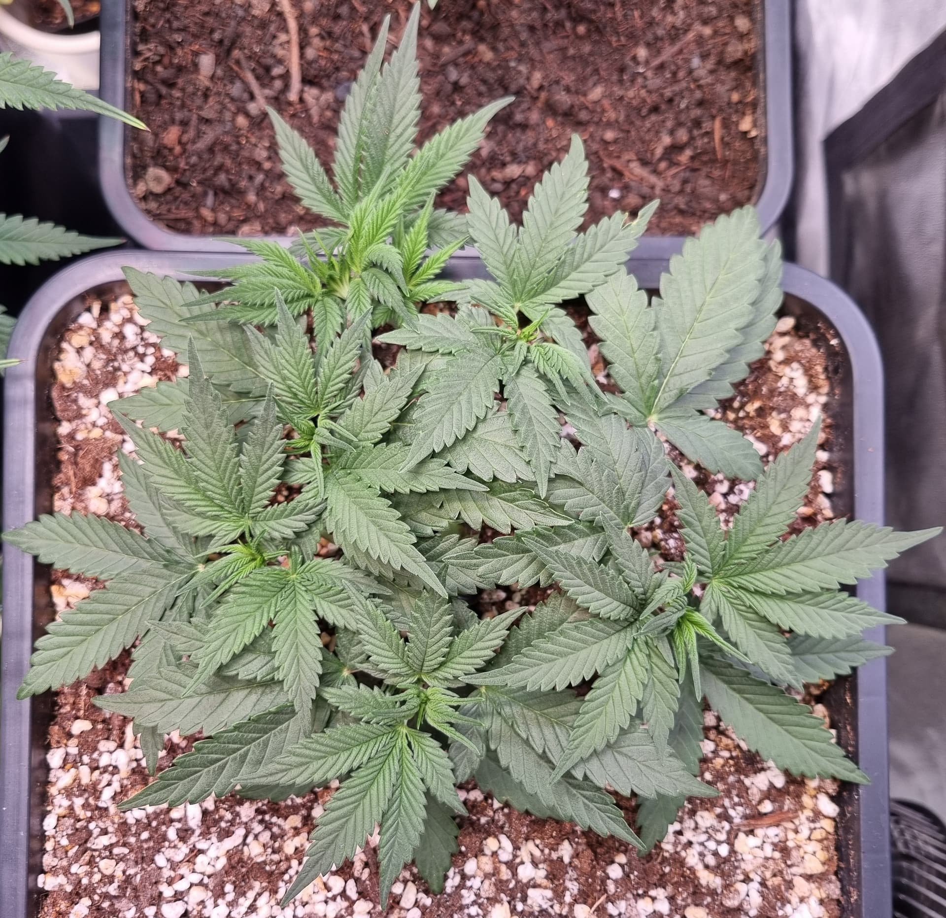 Die Erde besteht zu gleichen Teilen aus Perlite und BB Light Mix, wieder im 11L Pot, Tag 7: