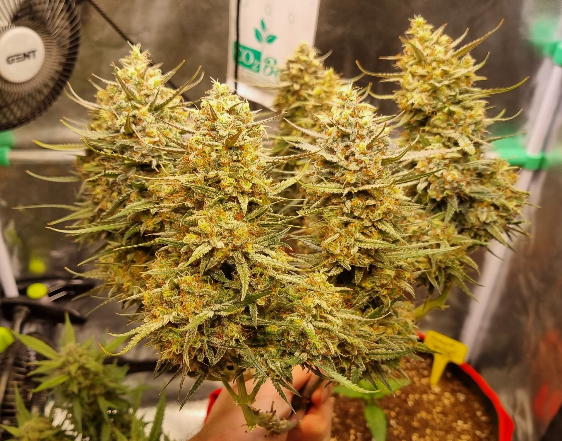 Es gab dann eine Düngergabe BioTabs Orgatrex, 1L, wie auf der Verpackung angegeben einmalig 20ml pro L und holymoly… der leckere Zitrusduft wurde vertrieben von… organischem Dünger-Geruch… 1 Woche lang roch das Zelt nach Tiertoilette, yay!