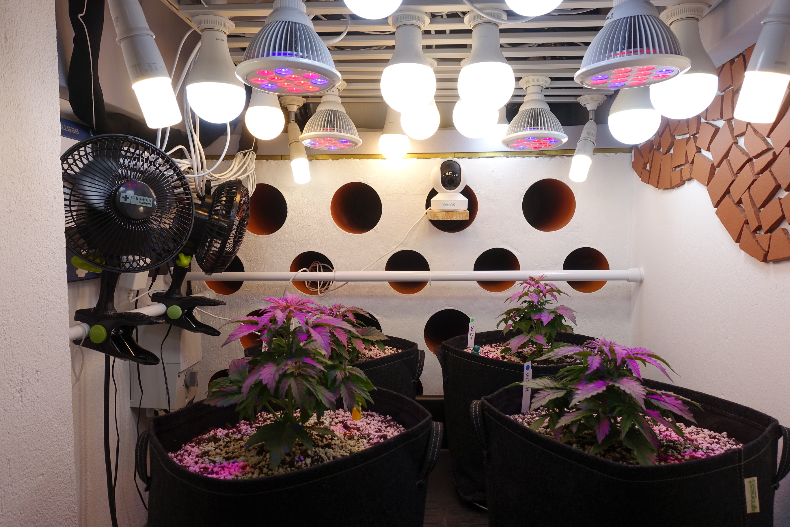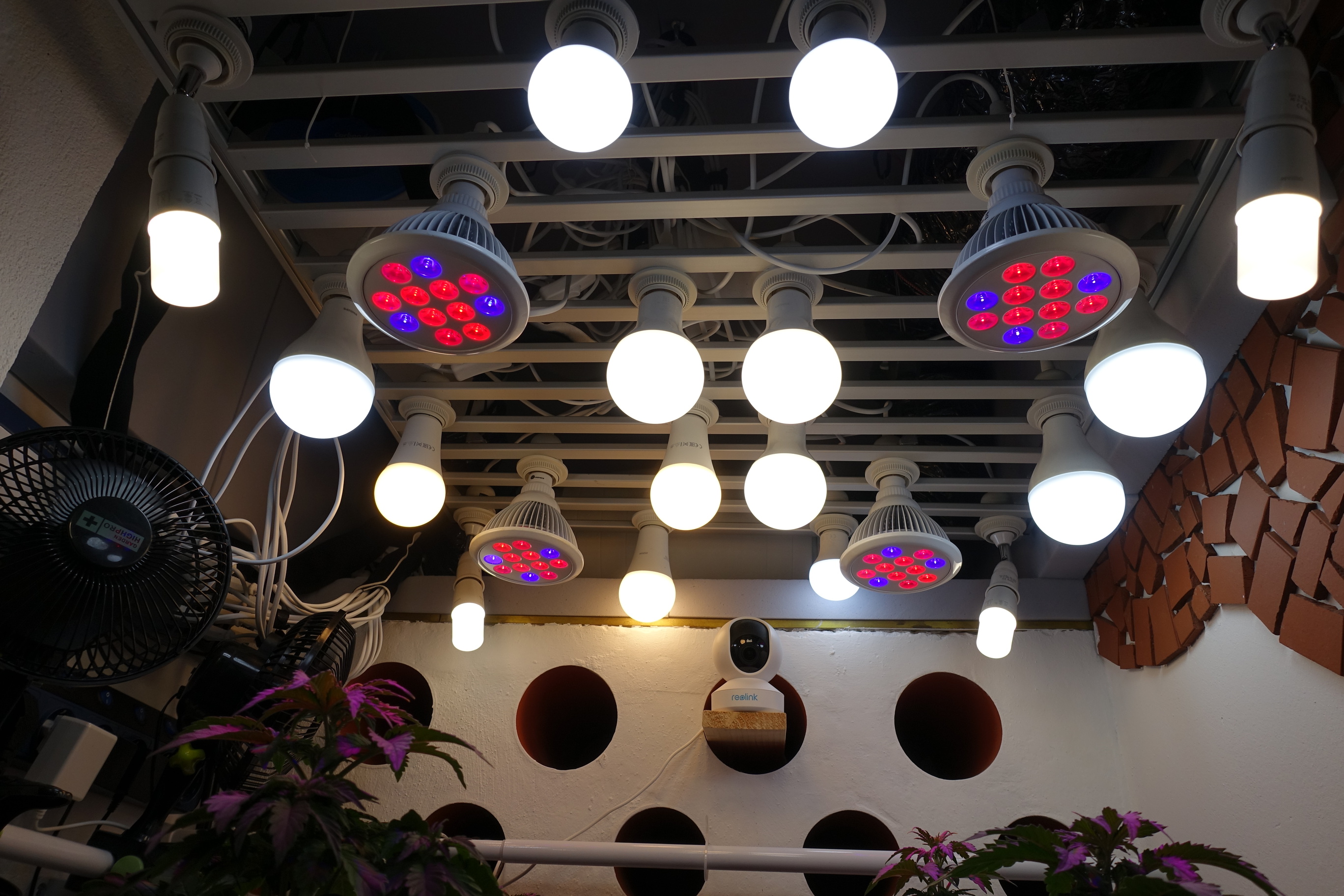 ⊠ob der einsetzenden BlĂŒte(n) wurde z.T. wieder das Licht gepimpt und die âvorne liegendeâ Reihe hat die China-Puff-Vollspektrum Boliden bekommen, wĂ€hrend sich die verbleibenden Plants noch mit der Red/Blue Variante zufrieden geben mĂŒssen.