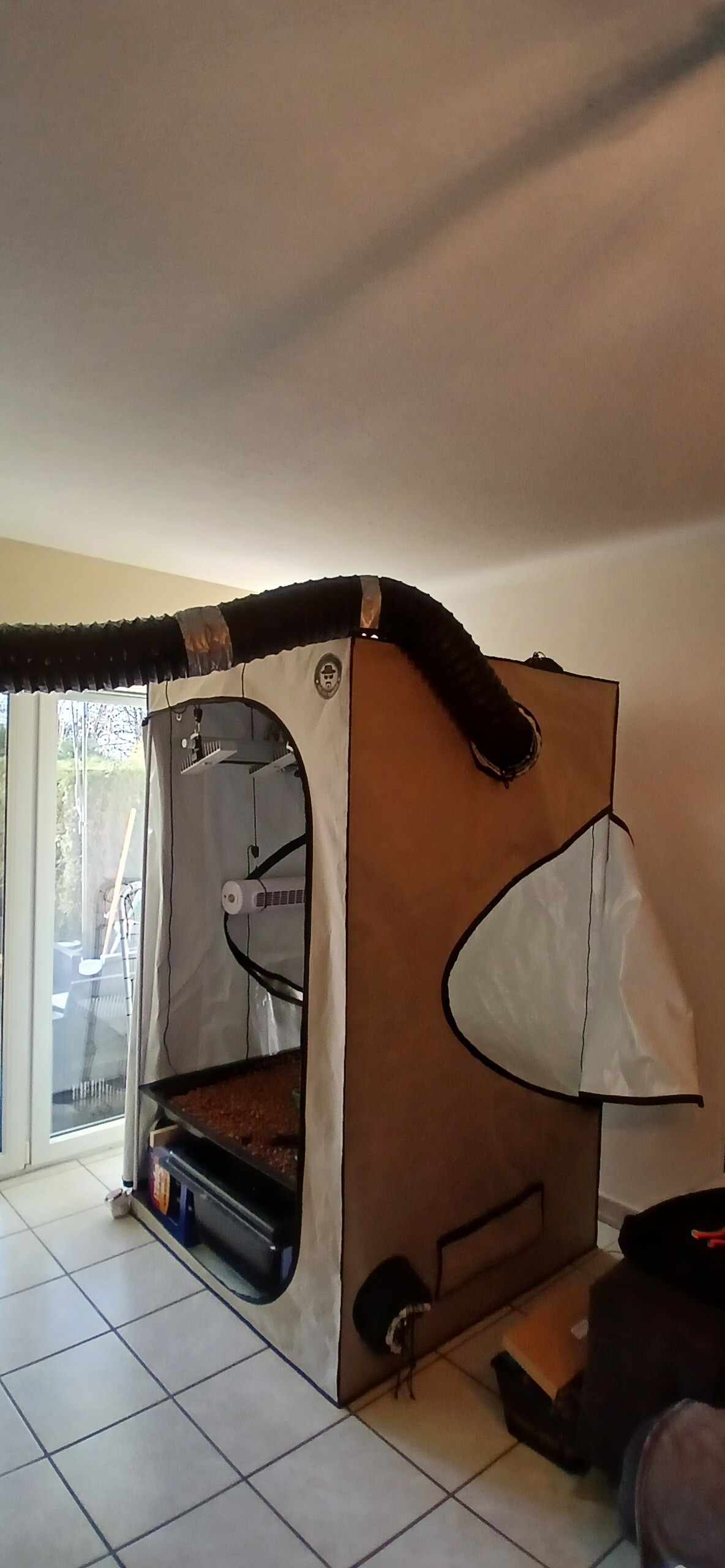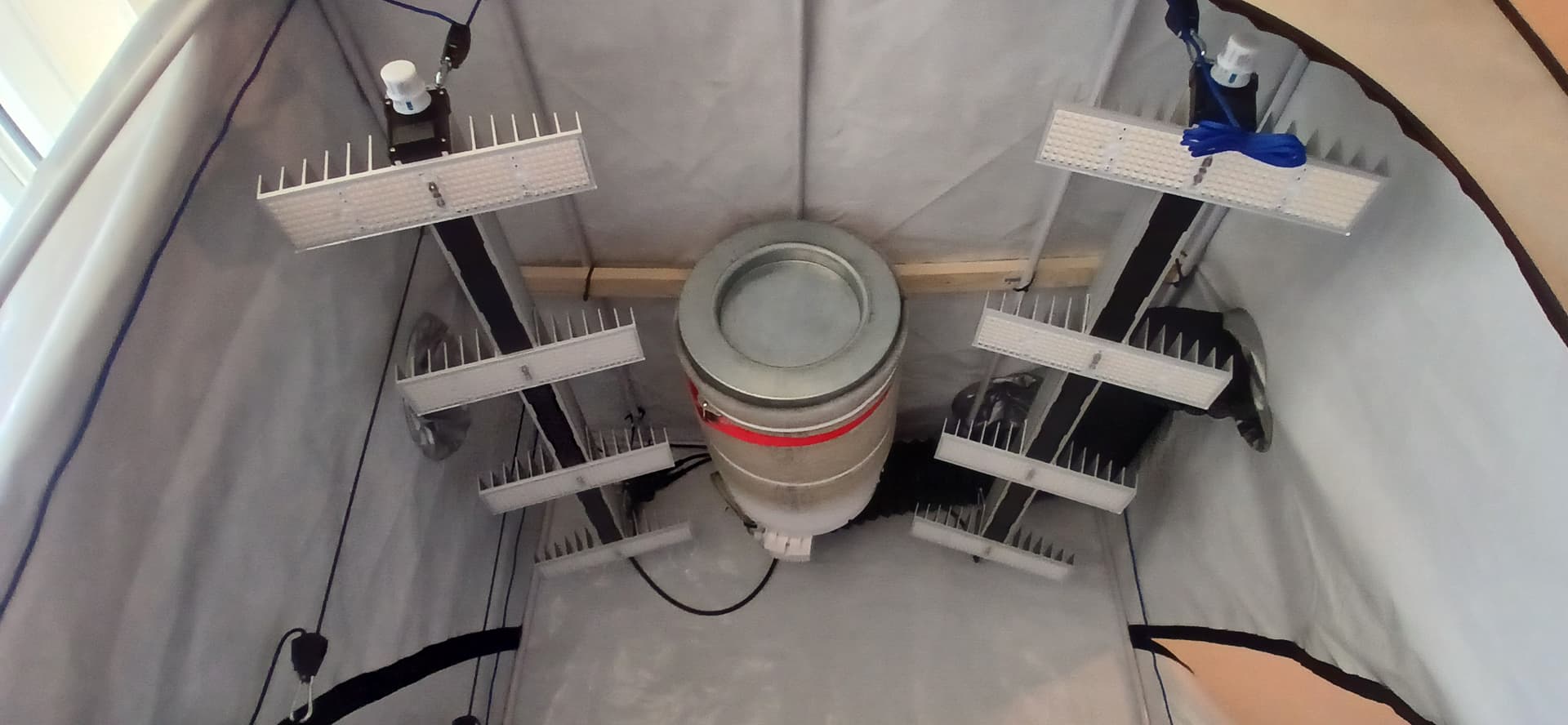 In diesem Grow werden wir an die Schmerzgrenze gehen und alles rausholen was raus zu holen ist. Die Erfahrung aus dem letzten Grow fließt natürlich direkt in diesen Grow somit wird der Ec wert auf das maximum getrieben und dies gepaart mit den zwei Sanlights 4/120 evo und dem Ebbe Flut Hydrosystem. Es werden zwei Samen gesteckt und diese beiden werden bis zum geht nicht mehr getoppt das ganze machen wir so lange bis wir sicher sind das der stretch das komplette Zelt ausfüllt. Ein oder zwei Netze liegen parat um alles zu flechten und hinterher stabil zu halten. Bewässert wird maximal 3 mal am Tag für 20 Minuten dies geschieht allerdings erst wenn die Wurzeln im Blähton angekommen sind. Zum vorziehen nutzen wir die minni Steinwollwürfel und fürdie Growphase nehmen wir die ganz großen Steinwollwürfel. Wasserwechsel wird alle 10 bis 12 Tage durchgeführt um das System sauber zu halten und um das Verhältnis der einzelnen Düngernährstoffe perfekt in der Waage zu halten. Aktuell bereiten wir gerade die steinwolle vor und drücken den ph Wert auf 6 sobald das erreicht ist kommen dann die kleinen keimlinge in die Anzuchtbox. Gekeimt wird zwischen zwei Zewa lagen auf einem Teller im dunkelen. Zum Schluss noch ein paar Bilder vom Zelt. Ihr seid alle herzlich willkommen zum diskutieren und zum zu schauen.