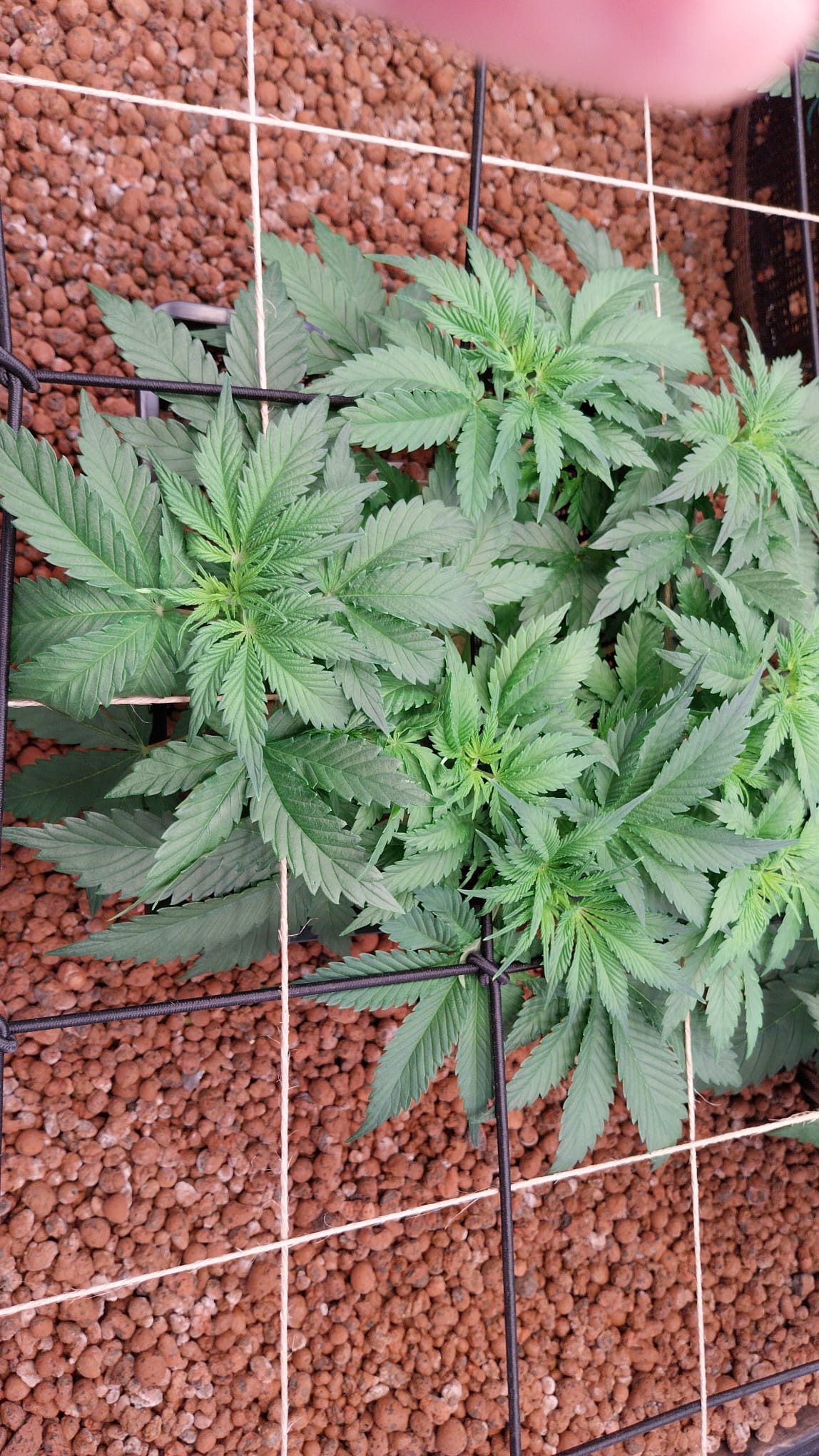 In die zwei großen Lücken lassen wir einfach den hauptstamm rein wachsen und wenn er lang genug ist werden wir ihn schräg ins zweite Netz einfädeln damit nehmen wir gleichzeitig noch etwas höhe raus und die Seitentriebe können gerade nach oben wachsen weil sie mehr licht bekommen.