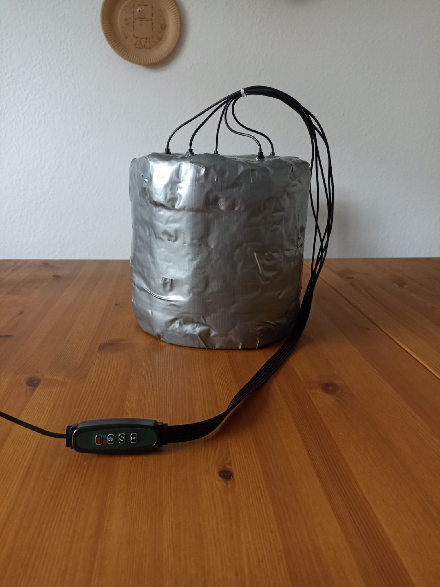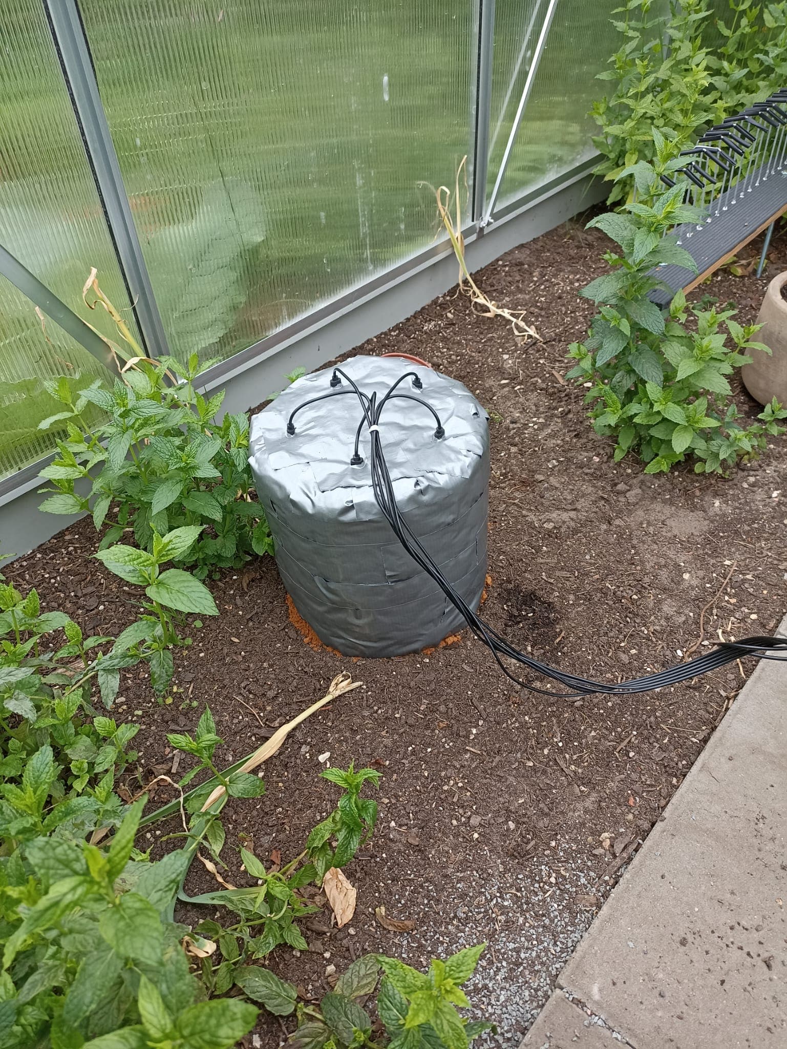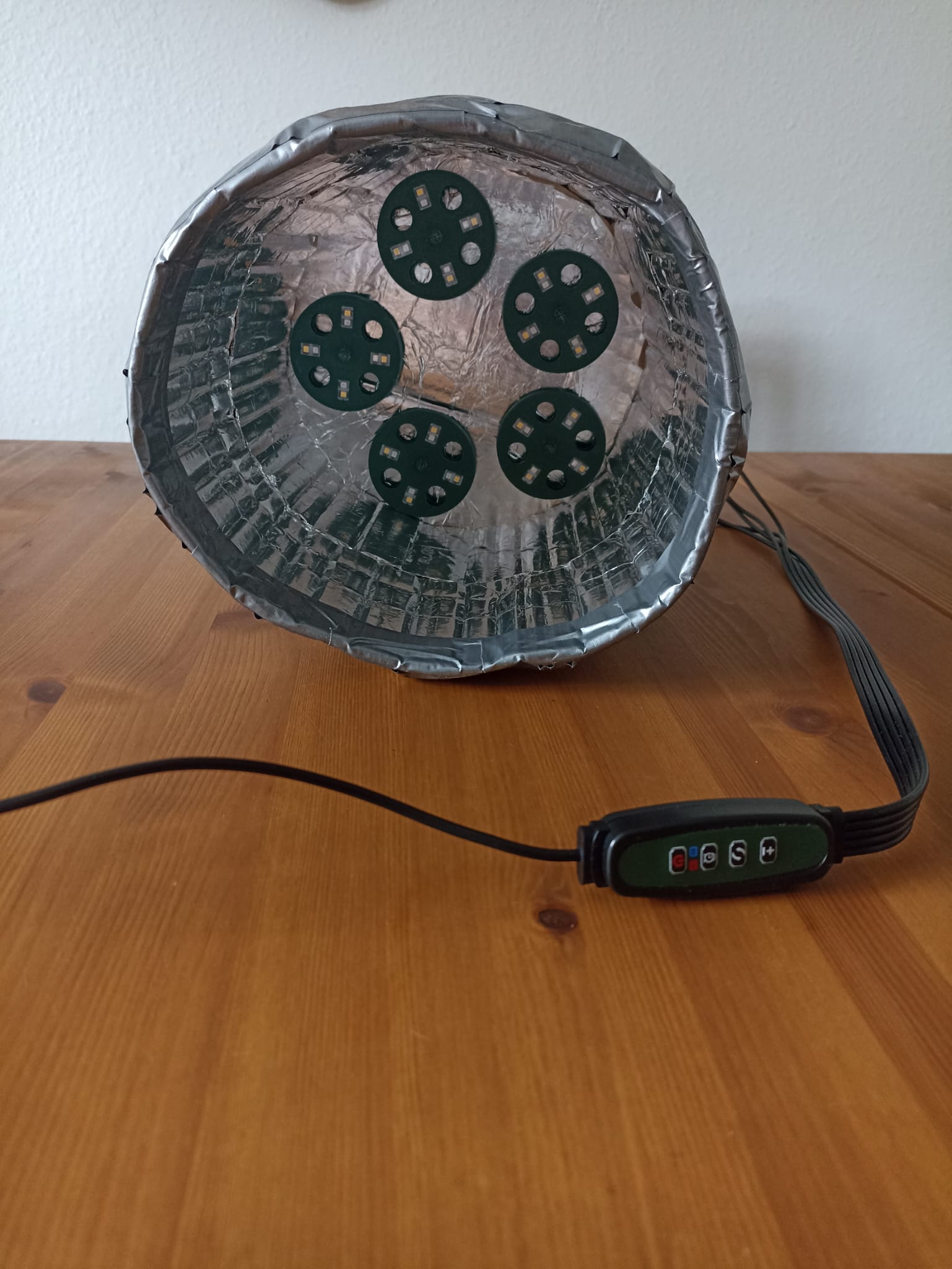 Die Lampen geben ca. 5000 lux ab und werden bei Nacht und tagsüber bei Kackwetter zum Einsatz kommen, solange es nicht zu eng wird. Um Nachts angenehme Temperaturen zu gewährleisten, hab ich den Bottich noch mit dicker Gewächshausnoppenfolie gedämmt.