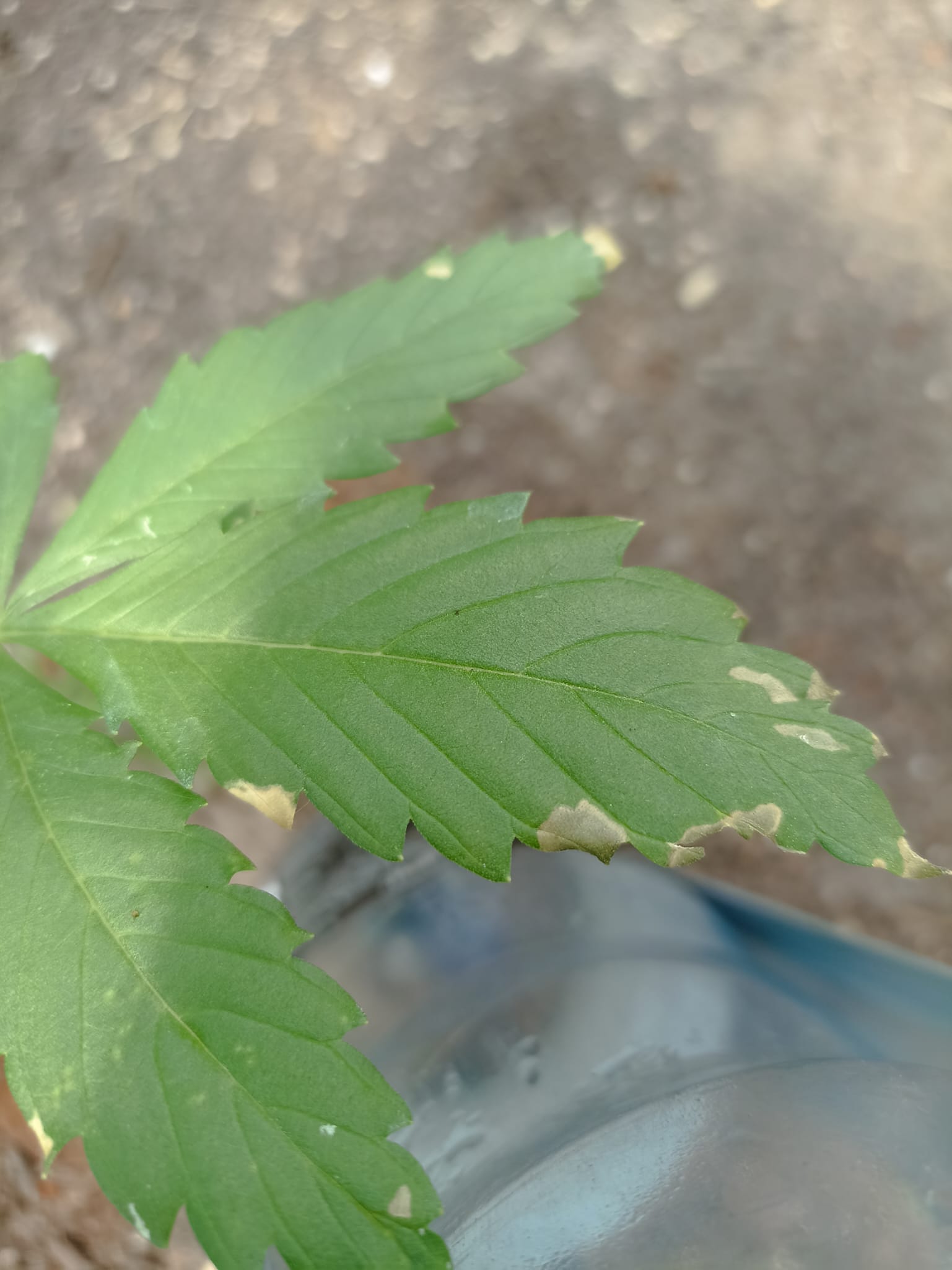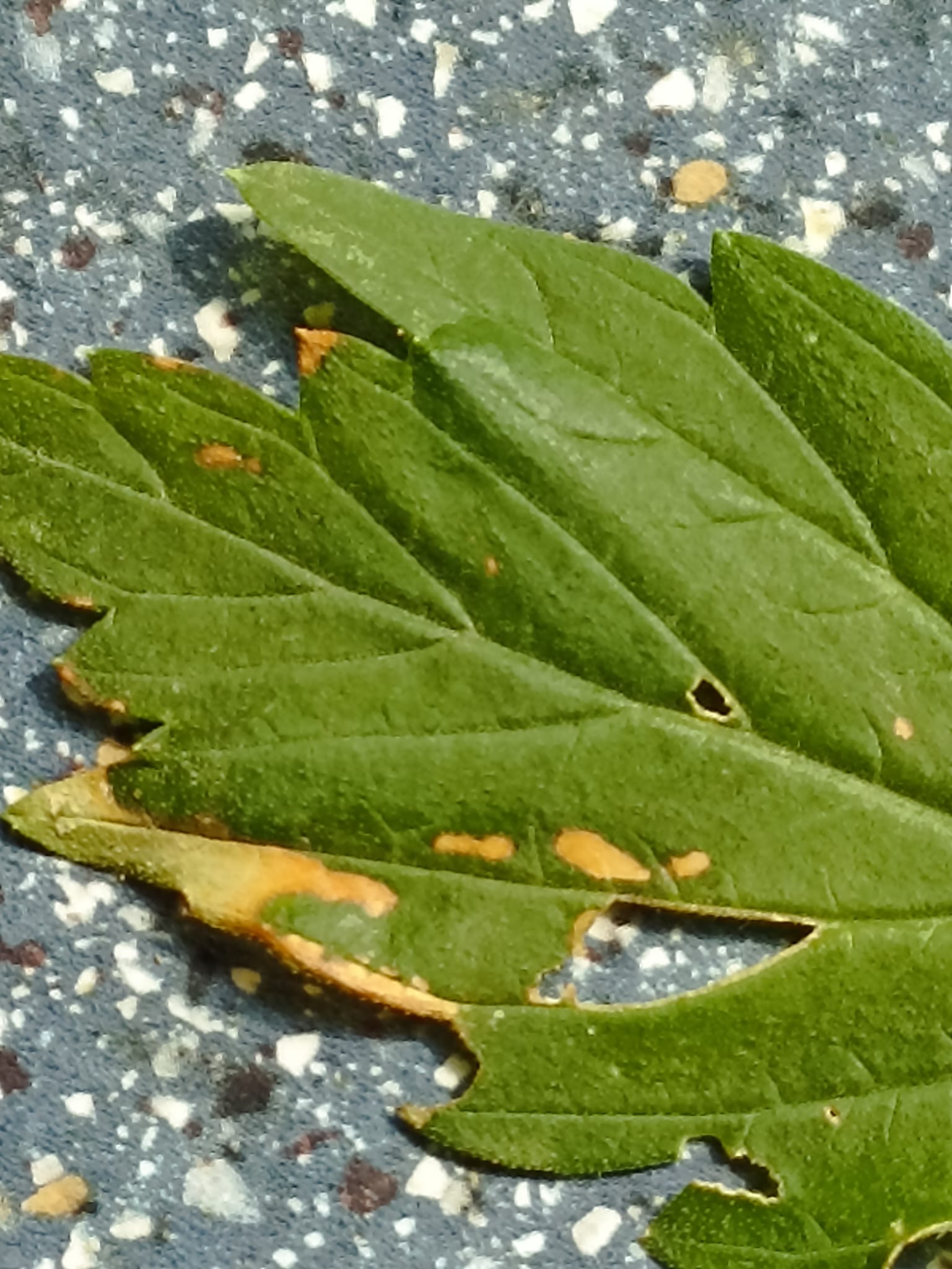 Ich hab noch mehr nachgedacht und glaube jetzt, dass es Sonnenbrand ist. Über Nacht ist nichts neues dazugekommen. Vor kurzem hatte ich ja leichten Blattlausbefall und habe dann mit der Seifenlauge gespritzt nach dem Motto, viel hilft viel. Die Probleme haben dann mit Beginn der Hitzewelle begonnen. Da ich dachte, da ist wieder Viechzeug am Werk, habe ich noch mal mit der Seifenlaufge gespritzt. Und zwar prophylaktisch auf alle. Danach ist es nur noch schlimmer geworden.