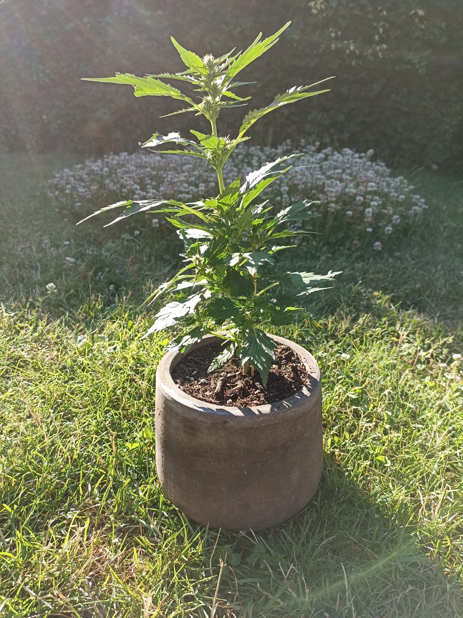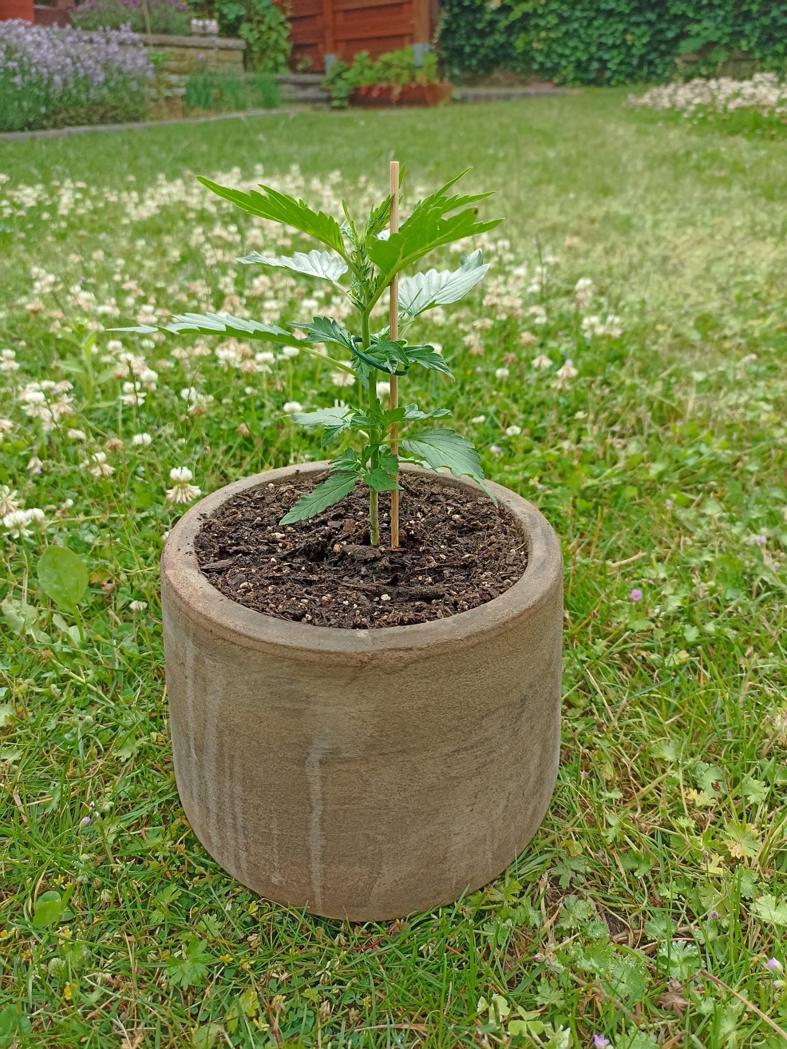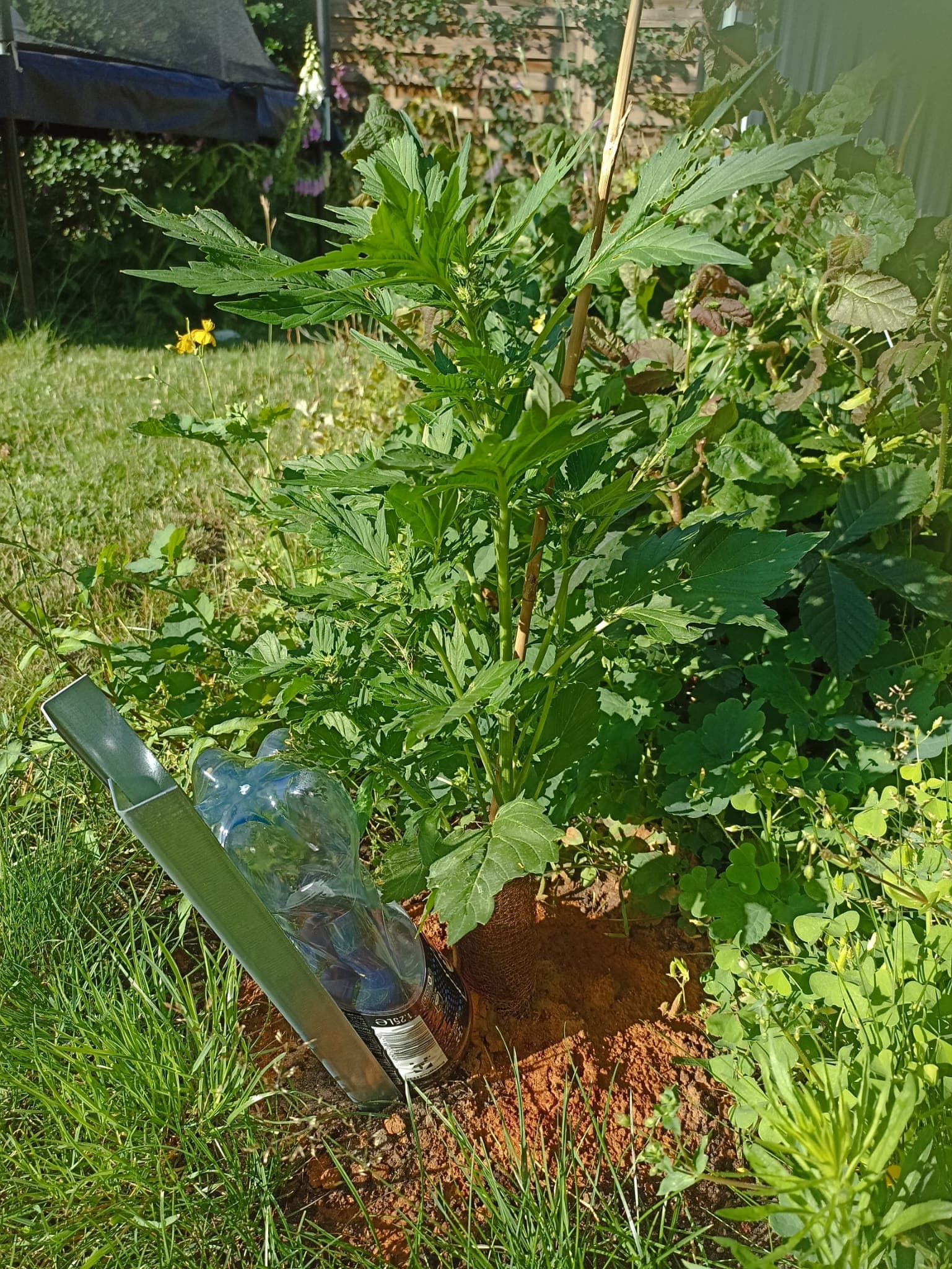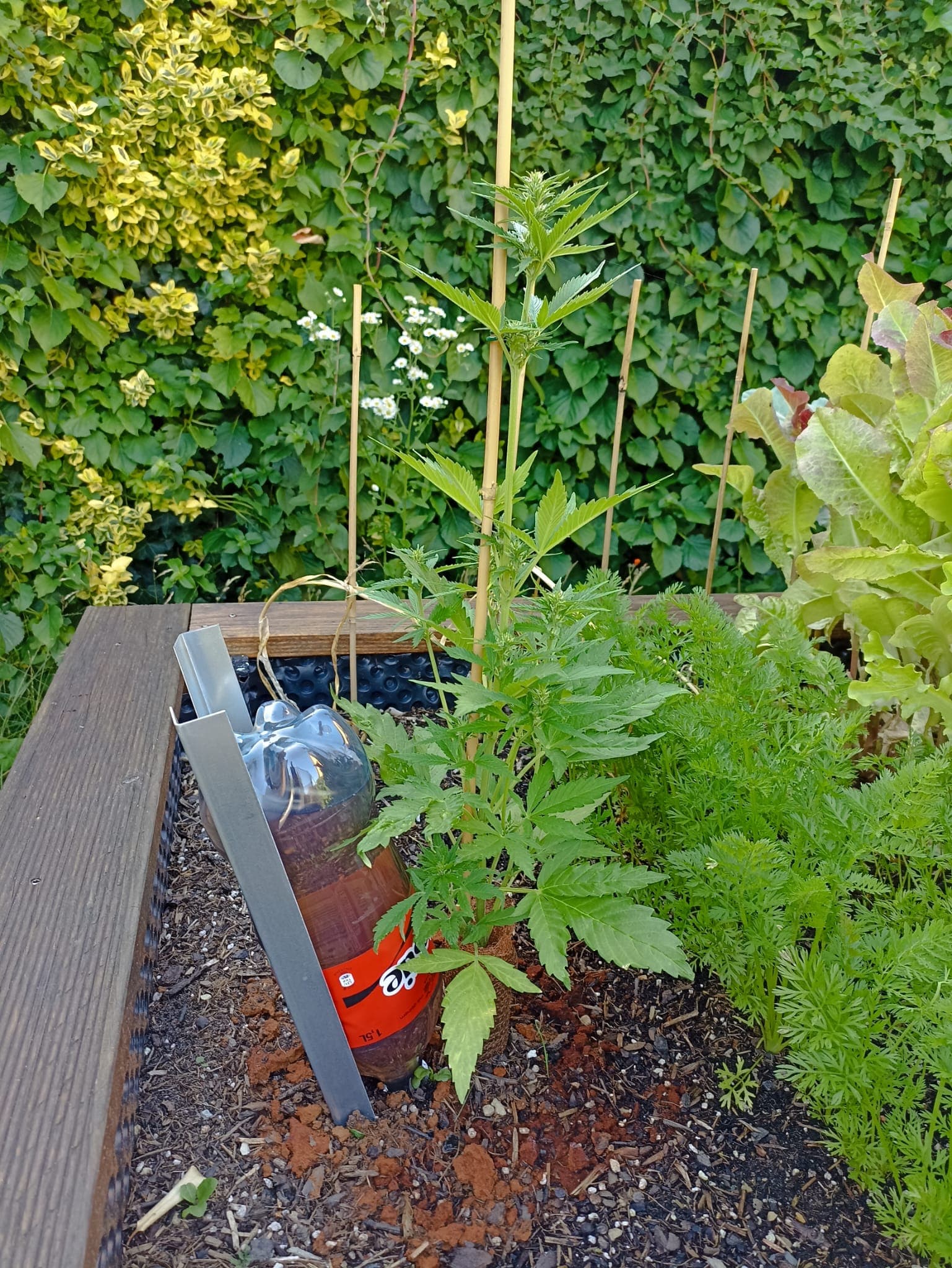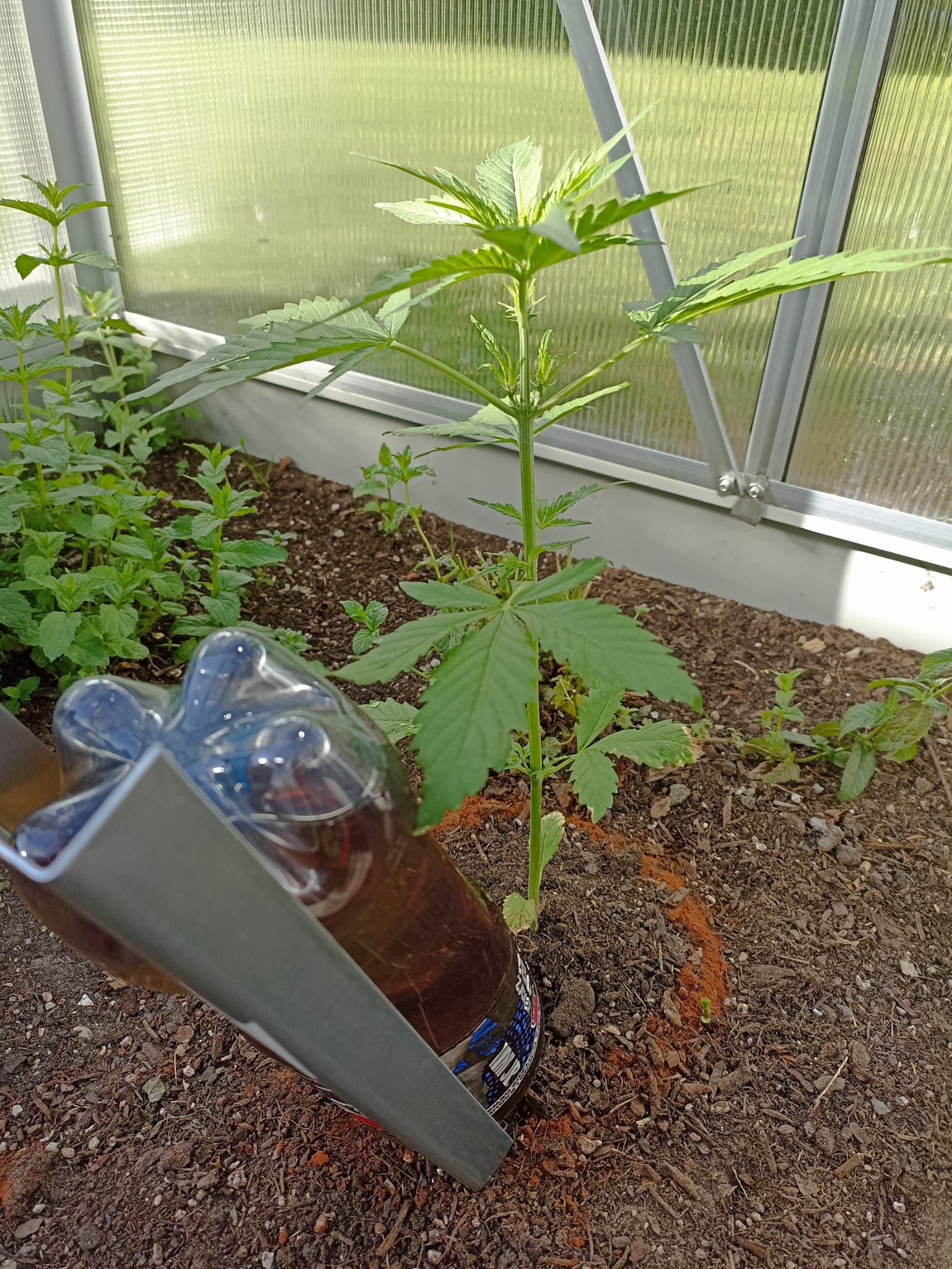 Urlaub steht an und damit meine cannabisunerfahrene Vertretung sich keinen Kopp machen muss, wann sie wieviel gießen soll, hab ich die letzte Woche mit Flaschentropfbewässerung experimentiert. Es scheint den Pflanzen zu gefallen, jedenfalls gibt es keine Anzeichen dafür, dass sie zuviel oder zuwenig Wasser bekommen. Es ist spannend zu sehen, wann wieviel Wasser in den Boden geht. An manchen Tagen läuft bei der einen Pflanze nix, bei der anderen ist die Flasche abends leer. Biobloom habe ich Portionsweise abgefüllt, es muss also nur geguckt werden, ob ne Flasche aufgefüllt werden muss.