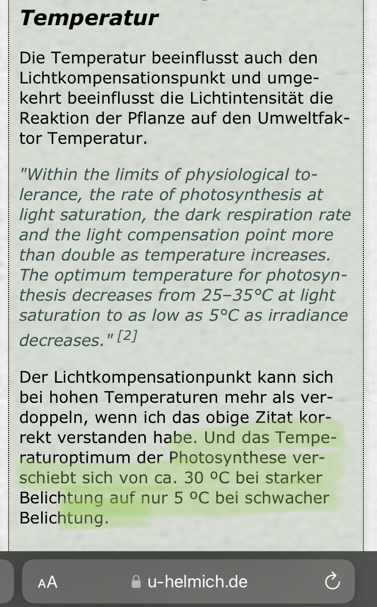 Niedrige Temperaturen > Pflanze und Bodenleben werden langsamer > Lichtmenge reduzieren, da wenn es kälter ist die Pflanze bei unproportionaler „Sonneneinstrahlung“ nicht hinterherkommt?