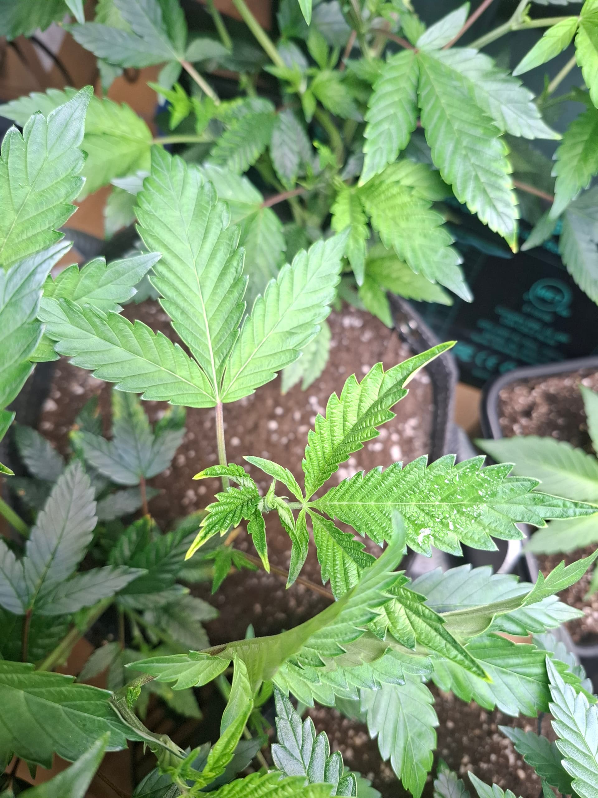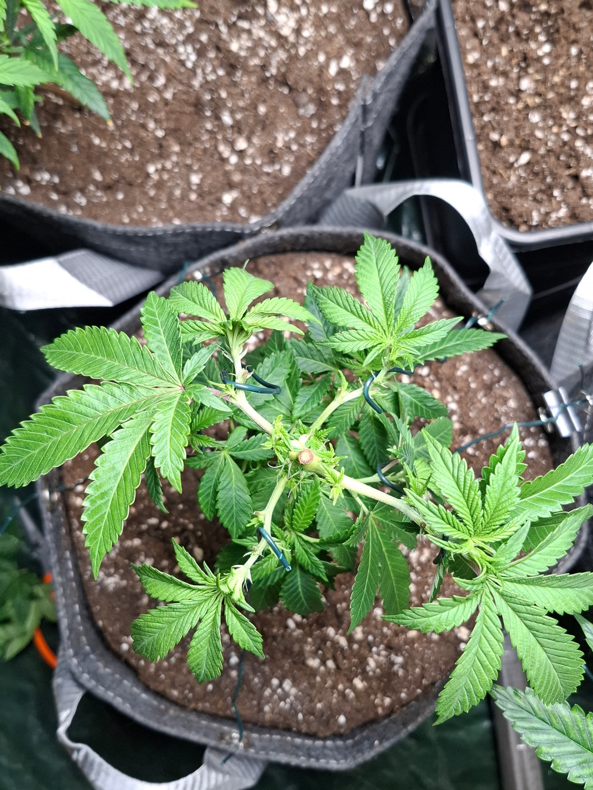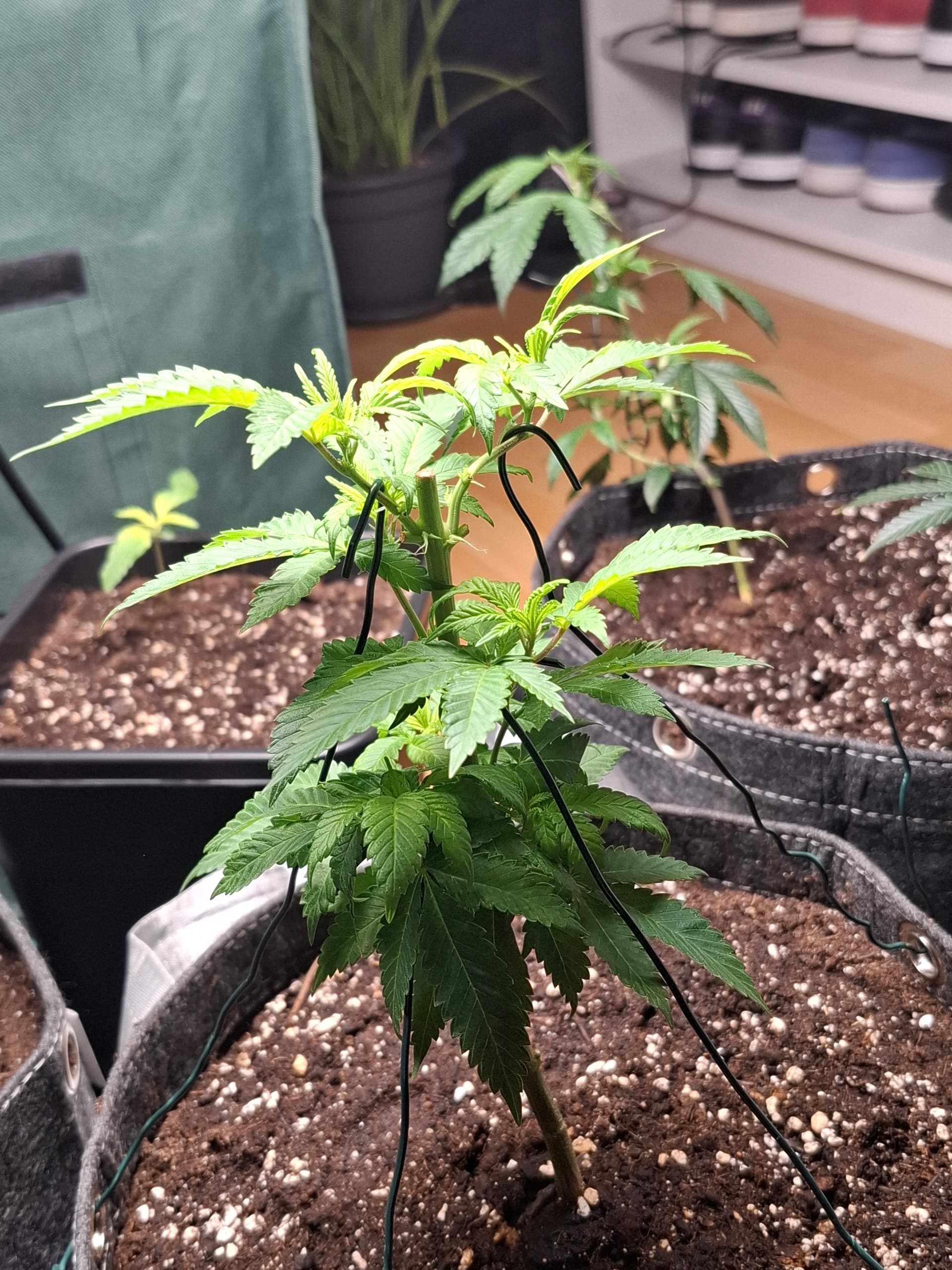 Die unteren Blätter haben Düngespitzen weil die Steckis in kleinen Töpfen mit massiv viel Greenhouse Feeding Grow standen, seit dem umtopfen sah der wuchs perfekt grün aus.