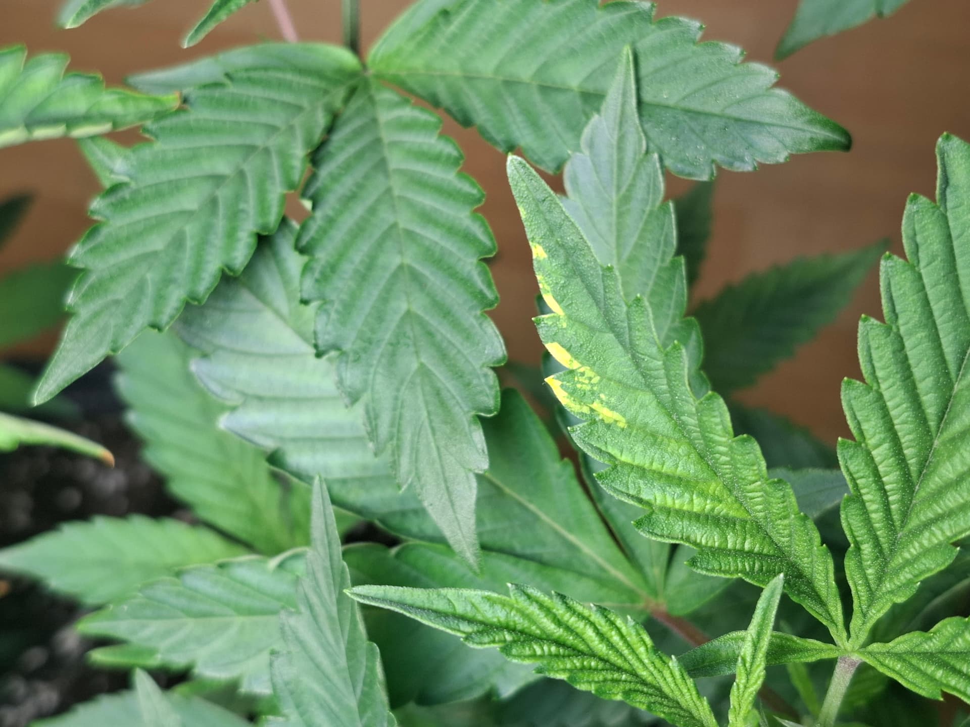 Ein paar Flecken, 2 komisch aussehende Blätter mit gelben Kanten (eins davon macht ne leichte Kurve… vllt Tabak-Virus?) und die eingerollten Blätter…