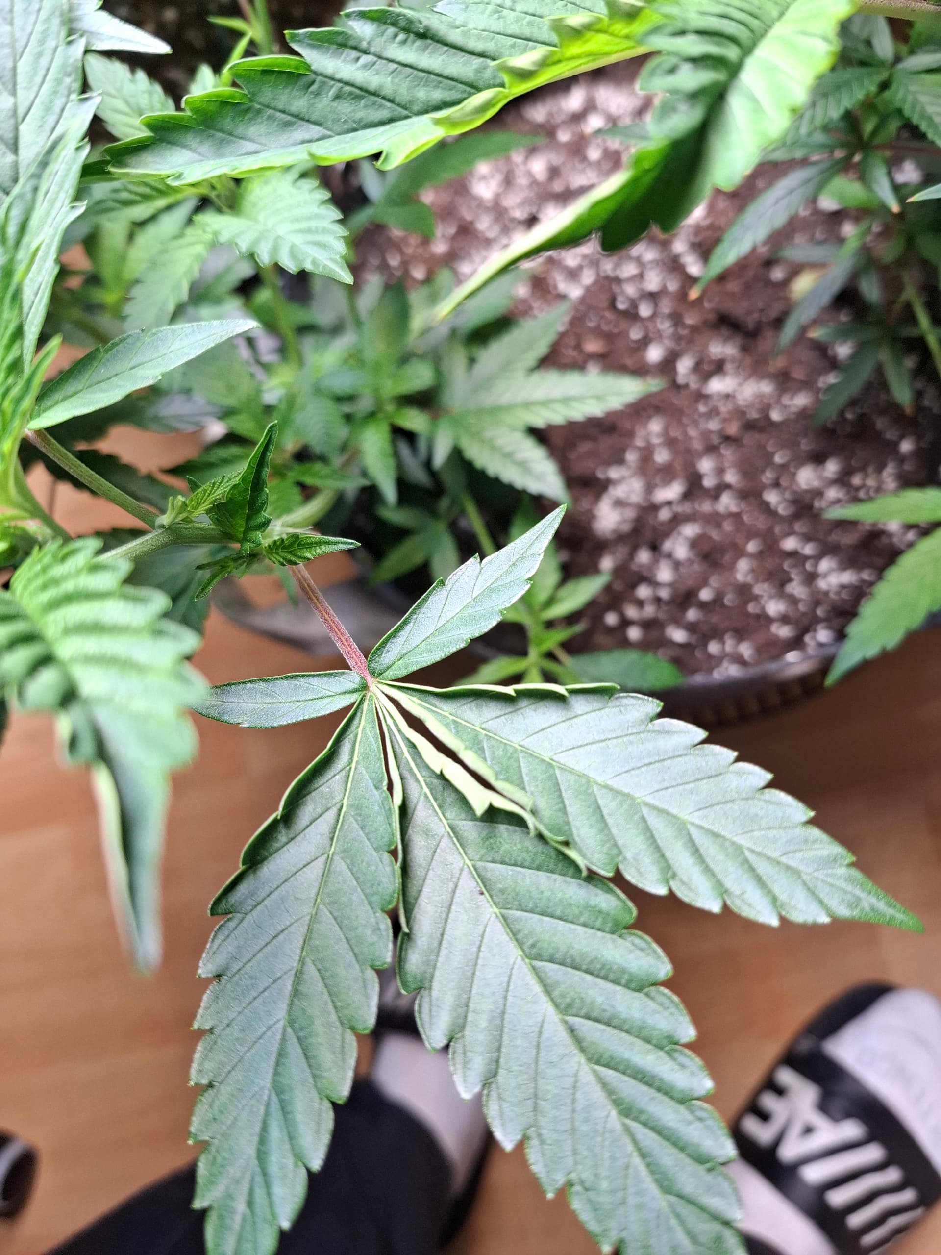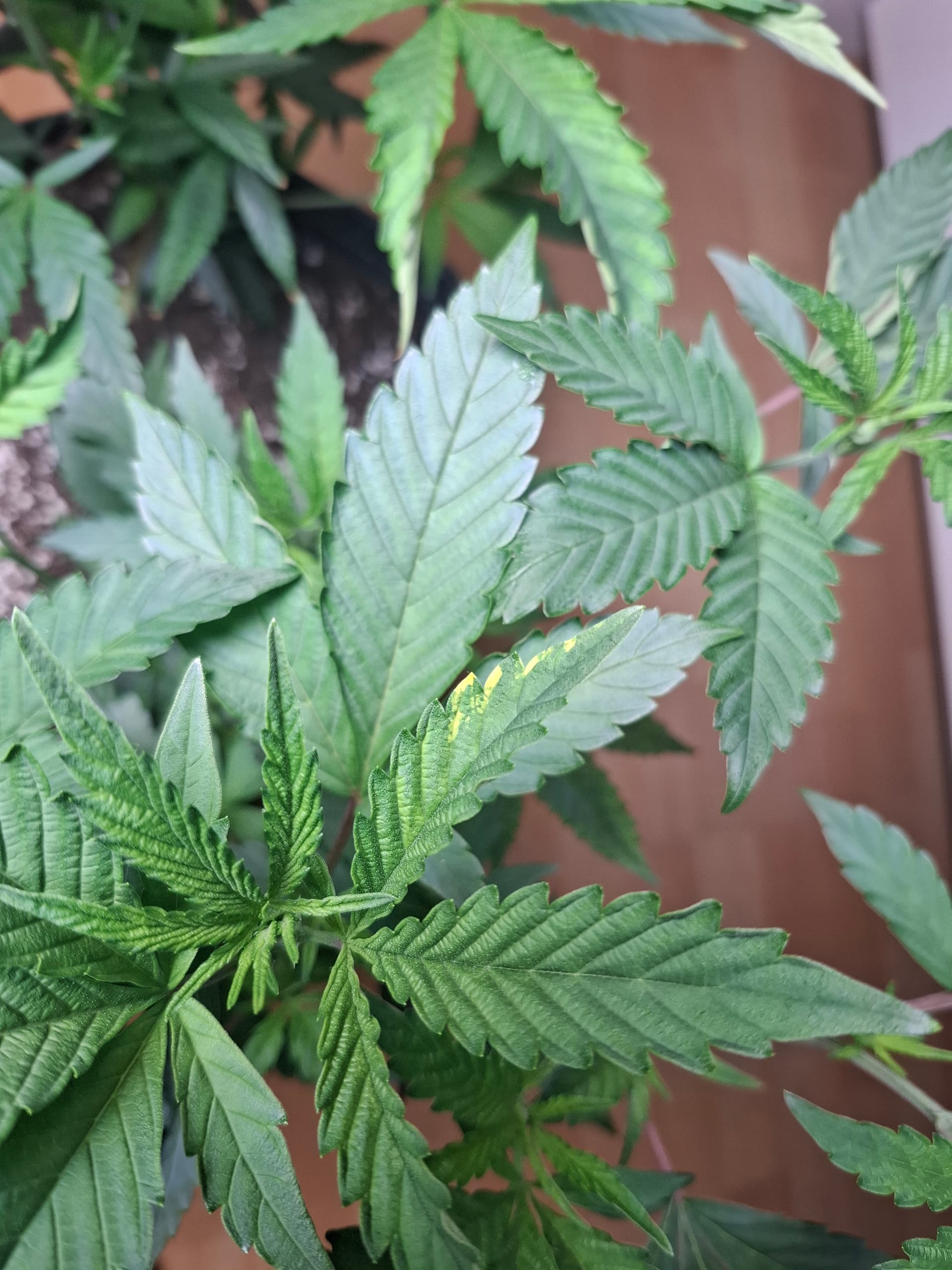 Heller Wuchs in der Mitte unten zu sehen könnte auf fehlendes Magnesium und / oder Stickstoff deuten oder zu hohe Lampenleistung bei zu wenig Nährstoffen.