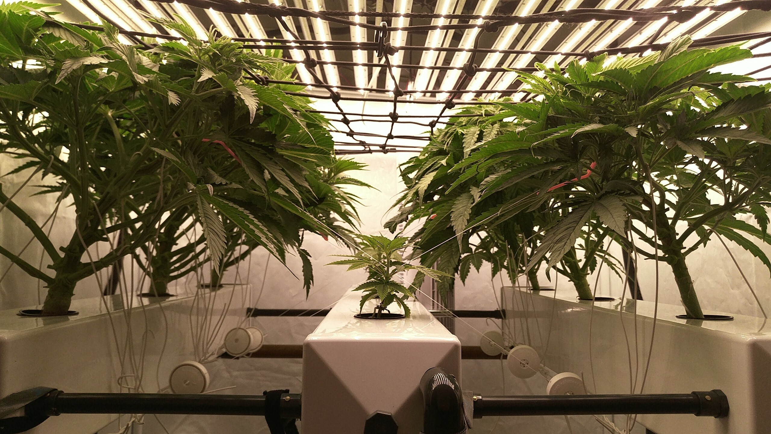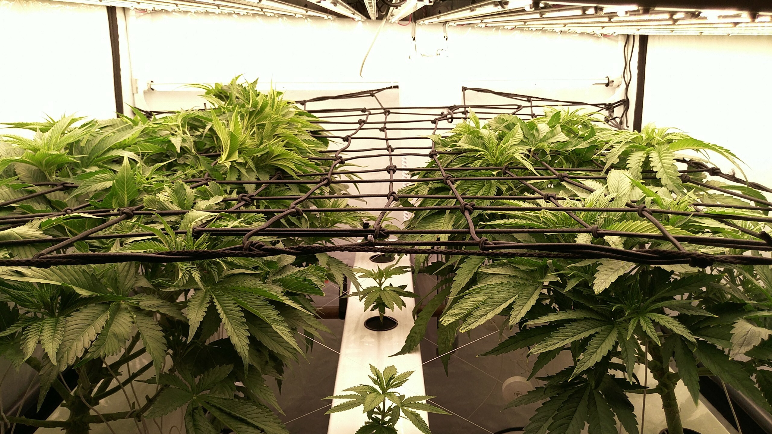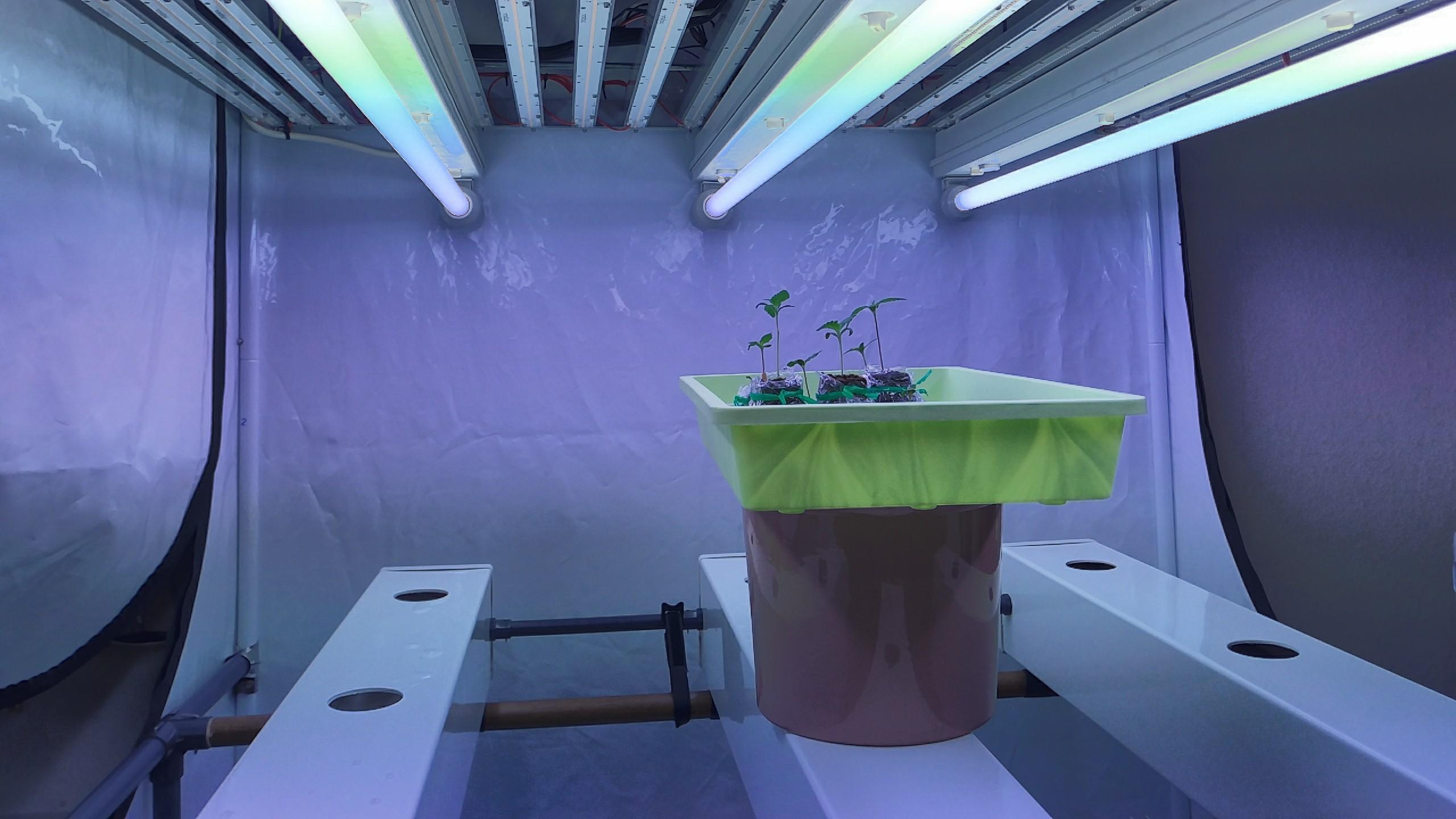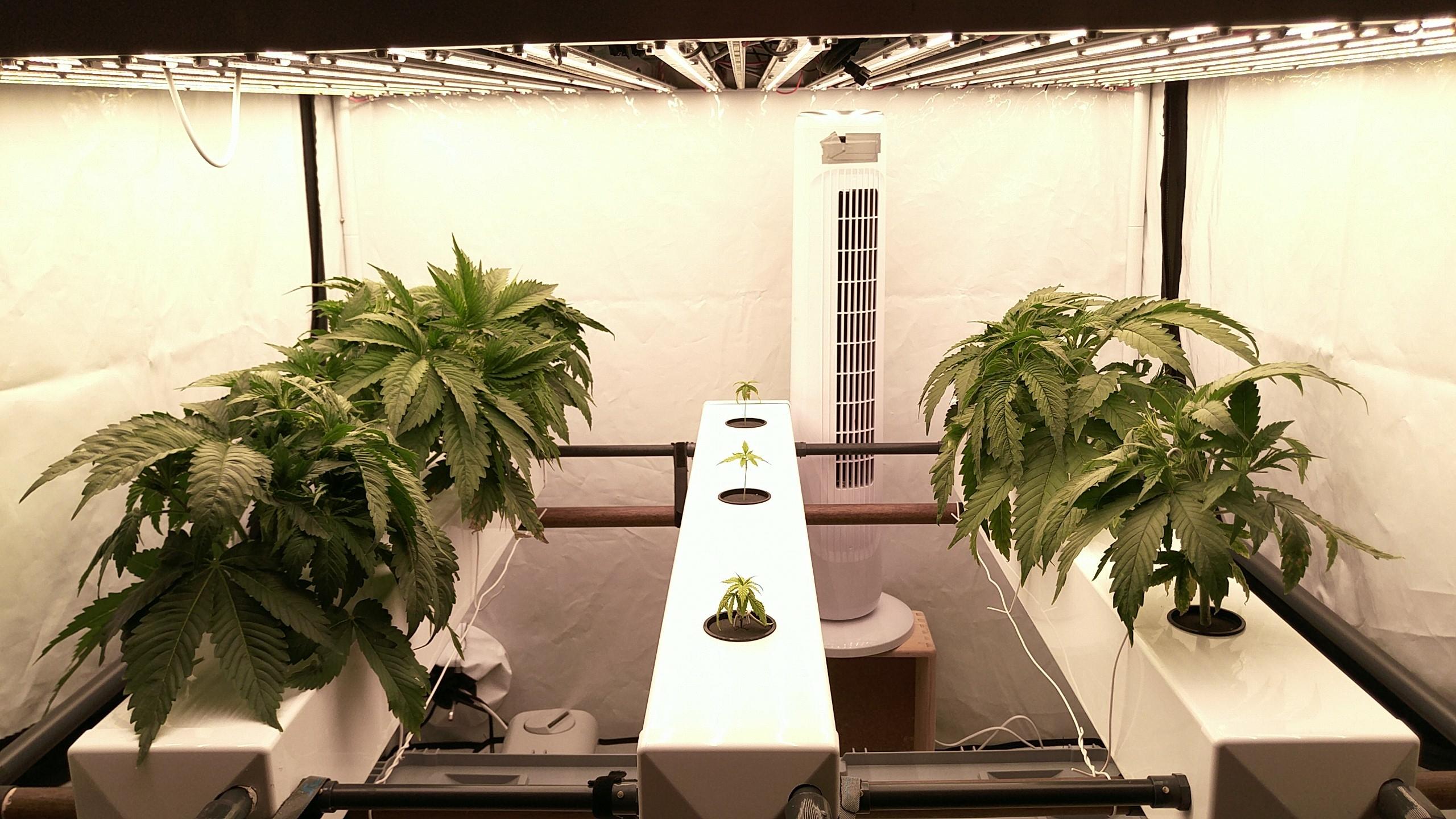 Soweit scheint das Zelt rund zu laufen. Ich hatte die Heizung durch ein 80W Heizkabel getauscht, das hinten vor der Zeltwand über den Röhren hängt. Luftfeuchtigkeit ist ein Traum mit dem Befeuchter, die Abluft muss selten regeln.