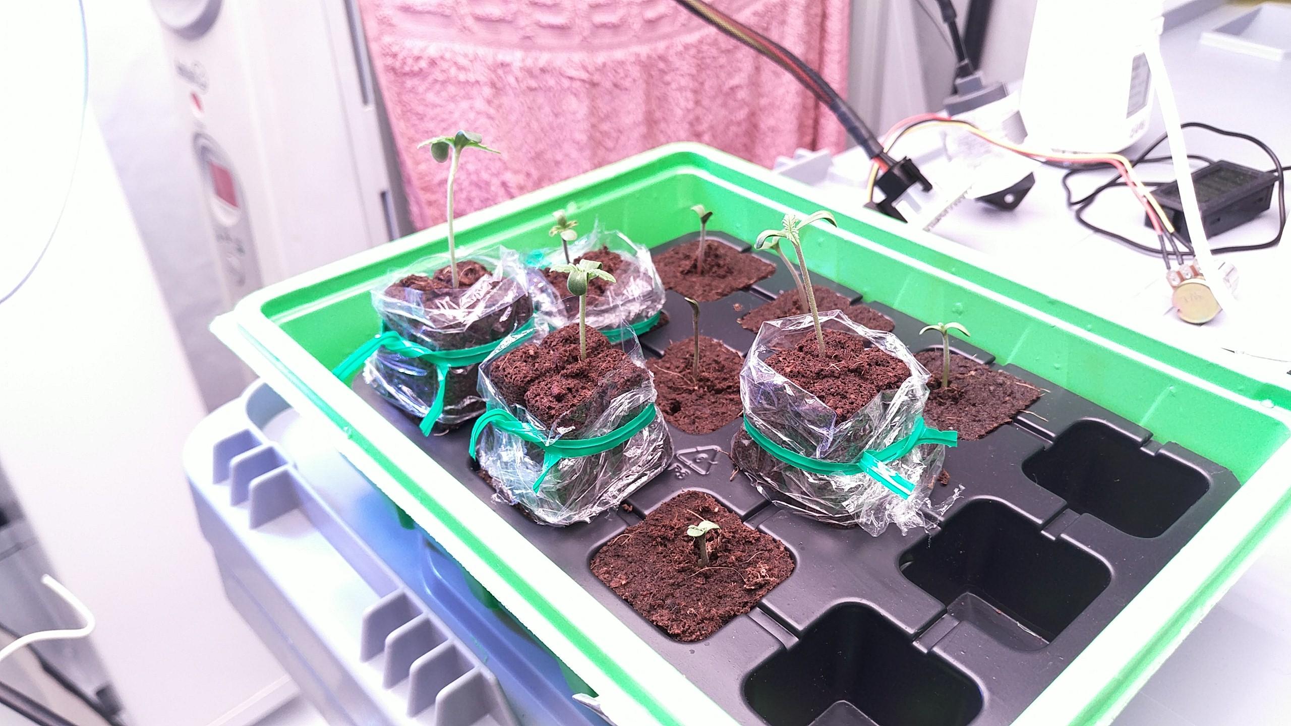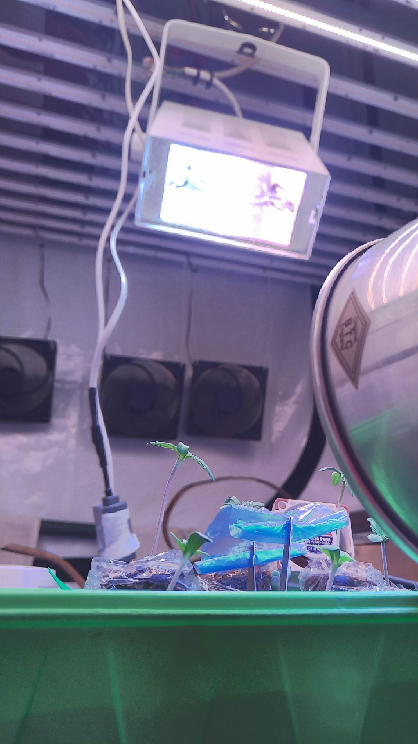 Ich höre jetzt entgegen meiner Tabelle öfter, dass Keimlinge schon gut und gerne 20DLI vertragen. Ich habe entsprechend etwas höher gestellt. Der mittlere ist nach seiner OP mit der Samenhülle nicht fit geworden und ist auf der Intensivstation. Er kann nciht so viel Licht ab wie die anderen und hat einen Schirm aus dem Diffusor von der E27-LED bekommen (auf einem Drahtbügel, desinfiziert):
