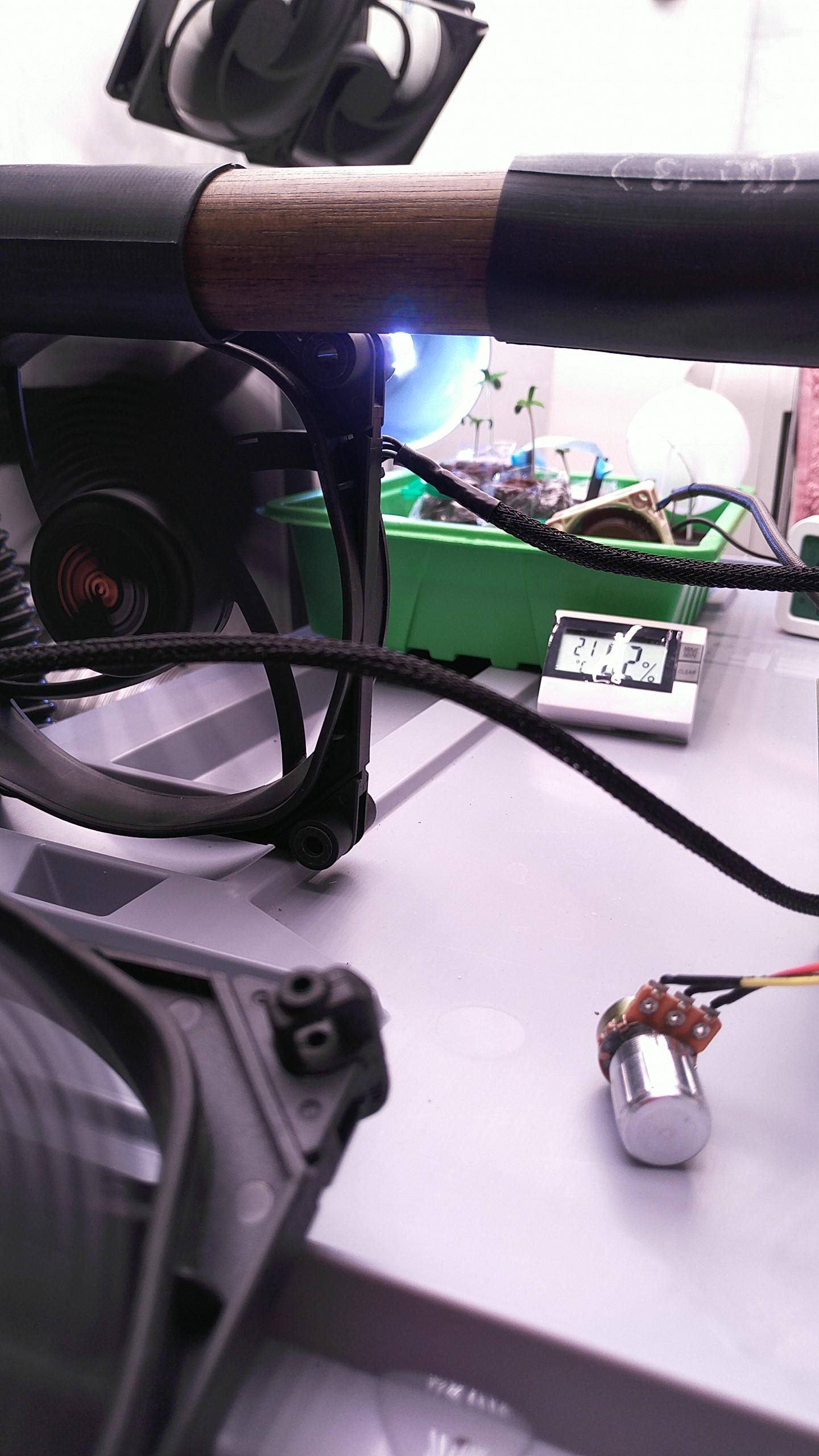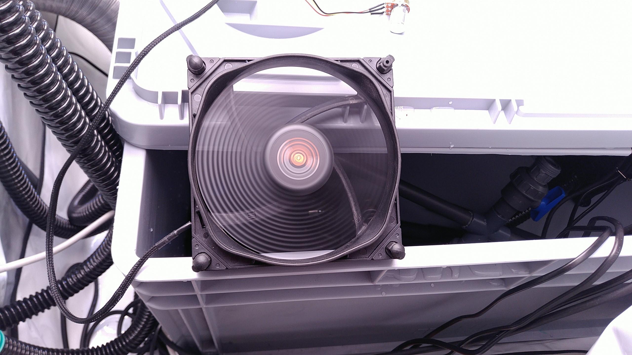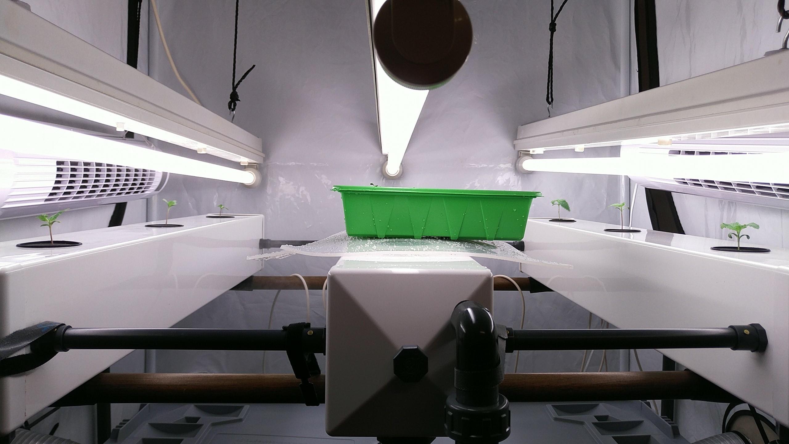 Morgen geht’s in die Netztöpfe. Gerade läuft noch Fentons Reagens durch den Kreis und entfernt Plastikrückstände. Der Wasserkühler ist getestet, er brummt schön tief wenn er anspringt. Der Luftbefeuchter ist auch endlich da: