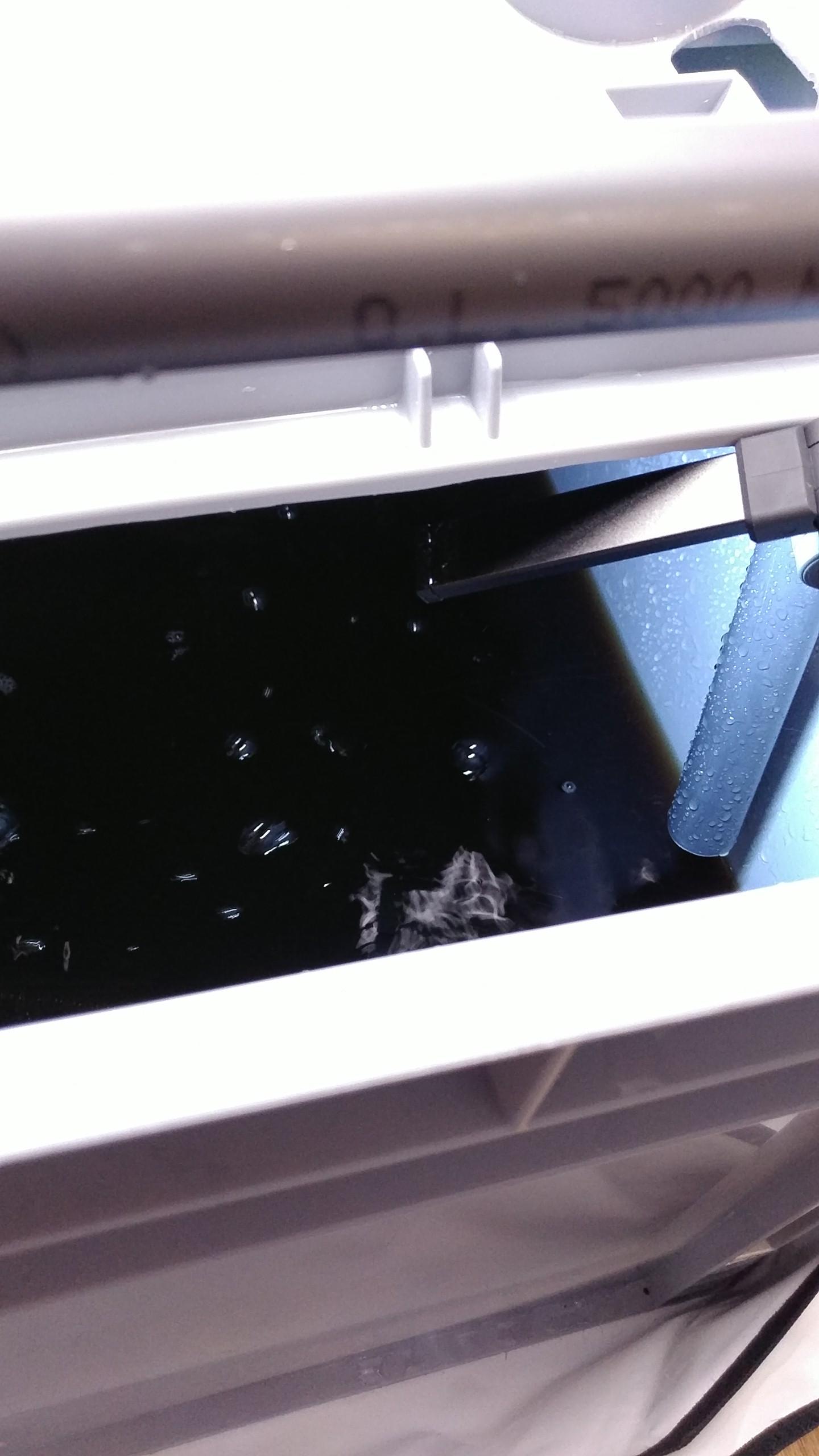 Inzwischen wurde das Wasser angesetzt, Lampen tiefer gehängt und Umluft plaziert. Richtig gut jetzt mit den beiden Turmventis, das ist sehr gleichmäßig so. 3 mal den Feinfilter gereinigt, weil sich die Bennies vom Bactorr S13 dachten sie machen einen Biofilter daraus. Eine finstere Suppe ist das geworden mit denen: