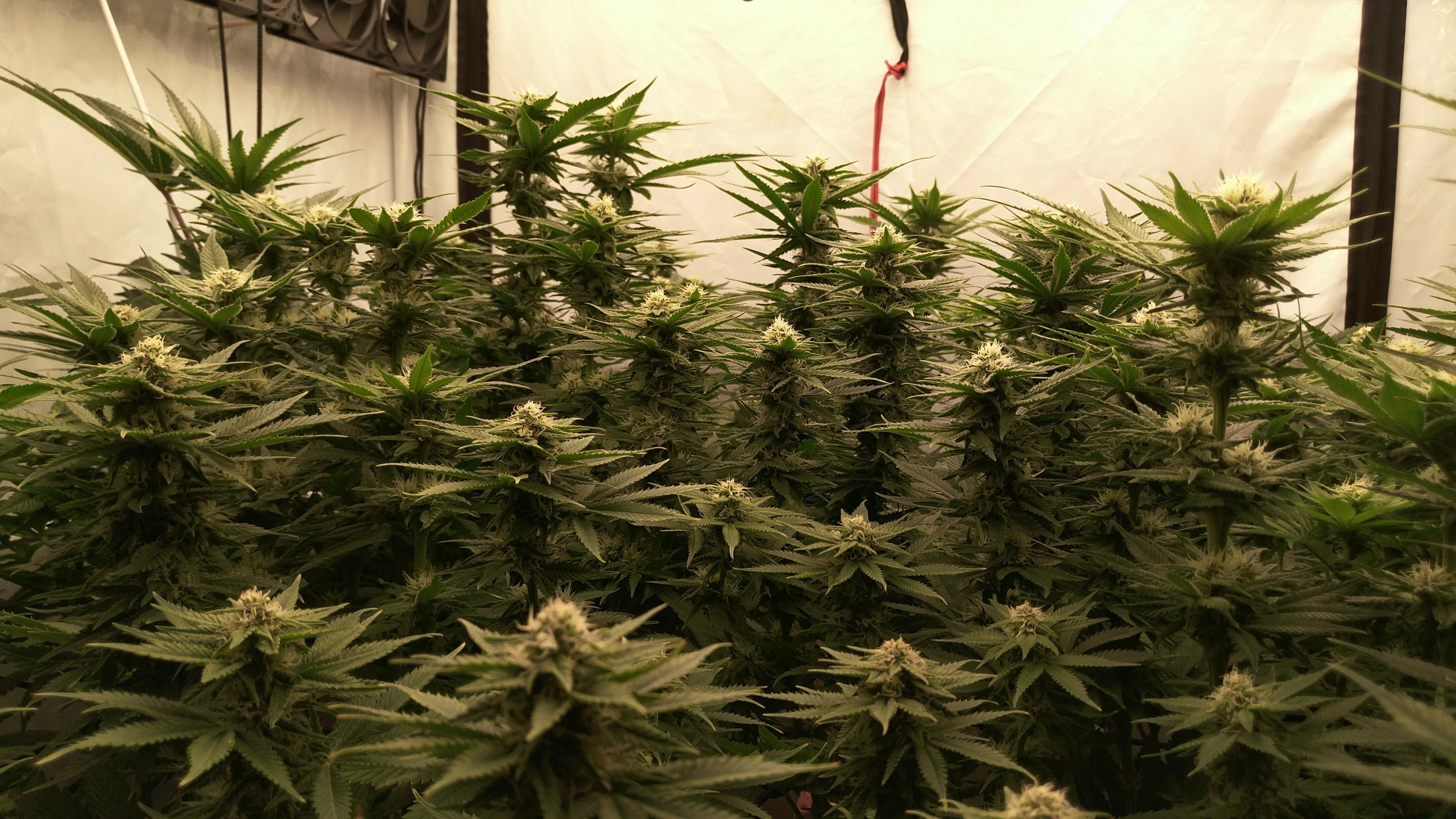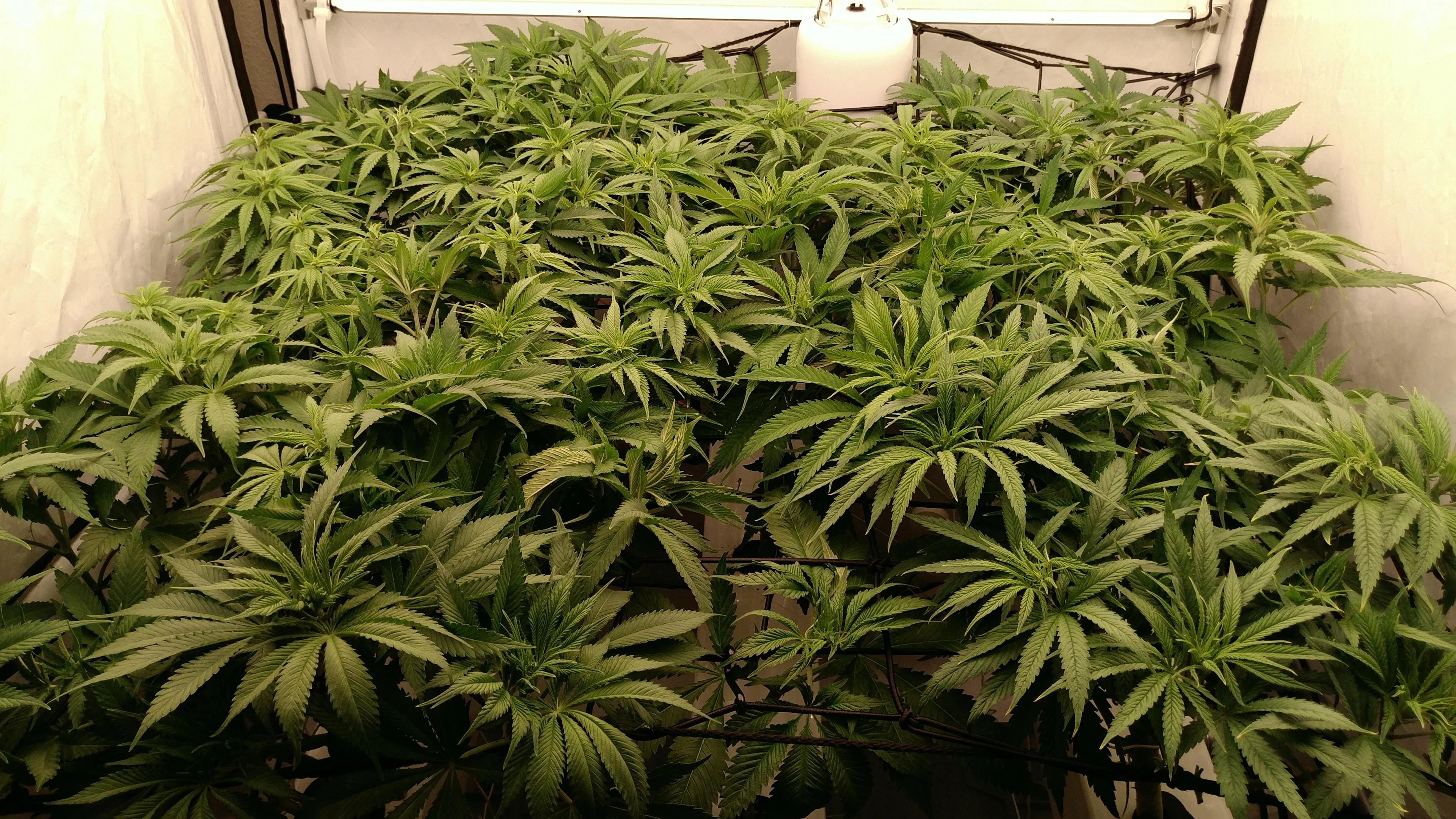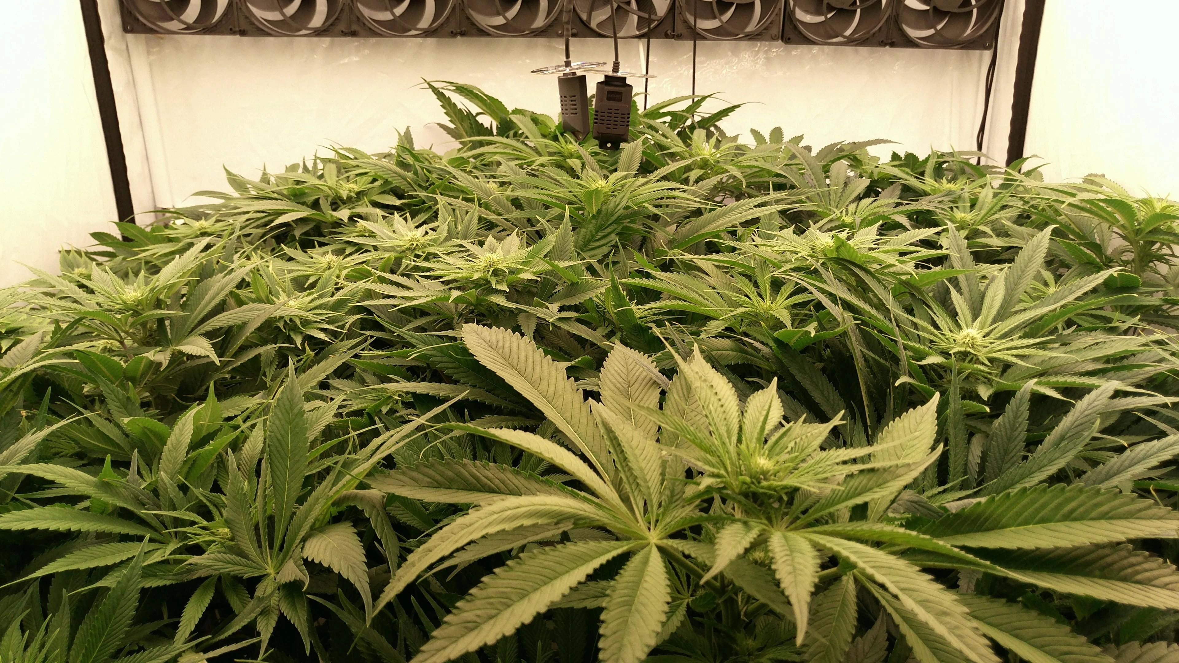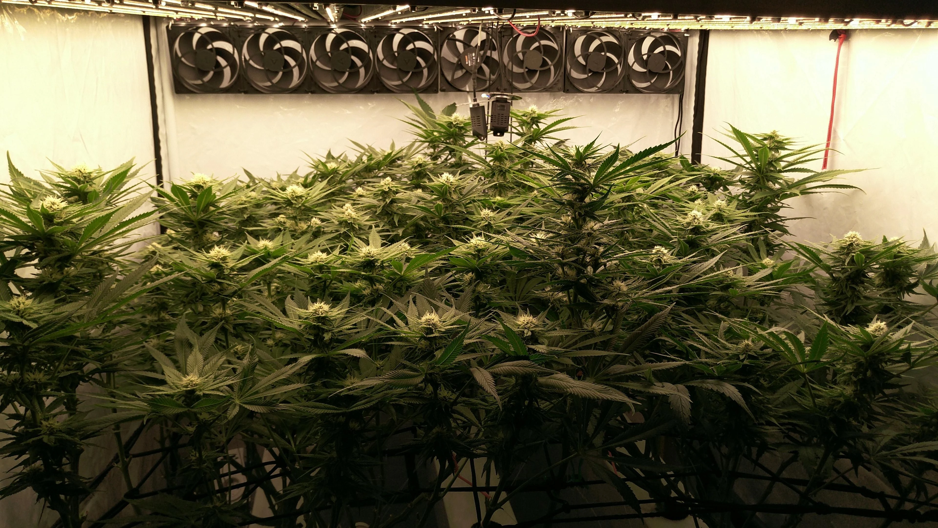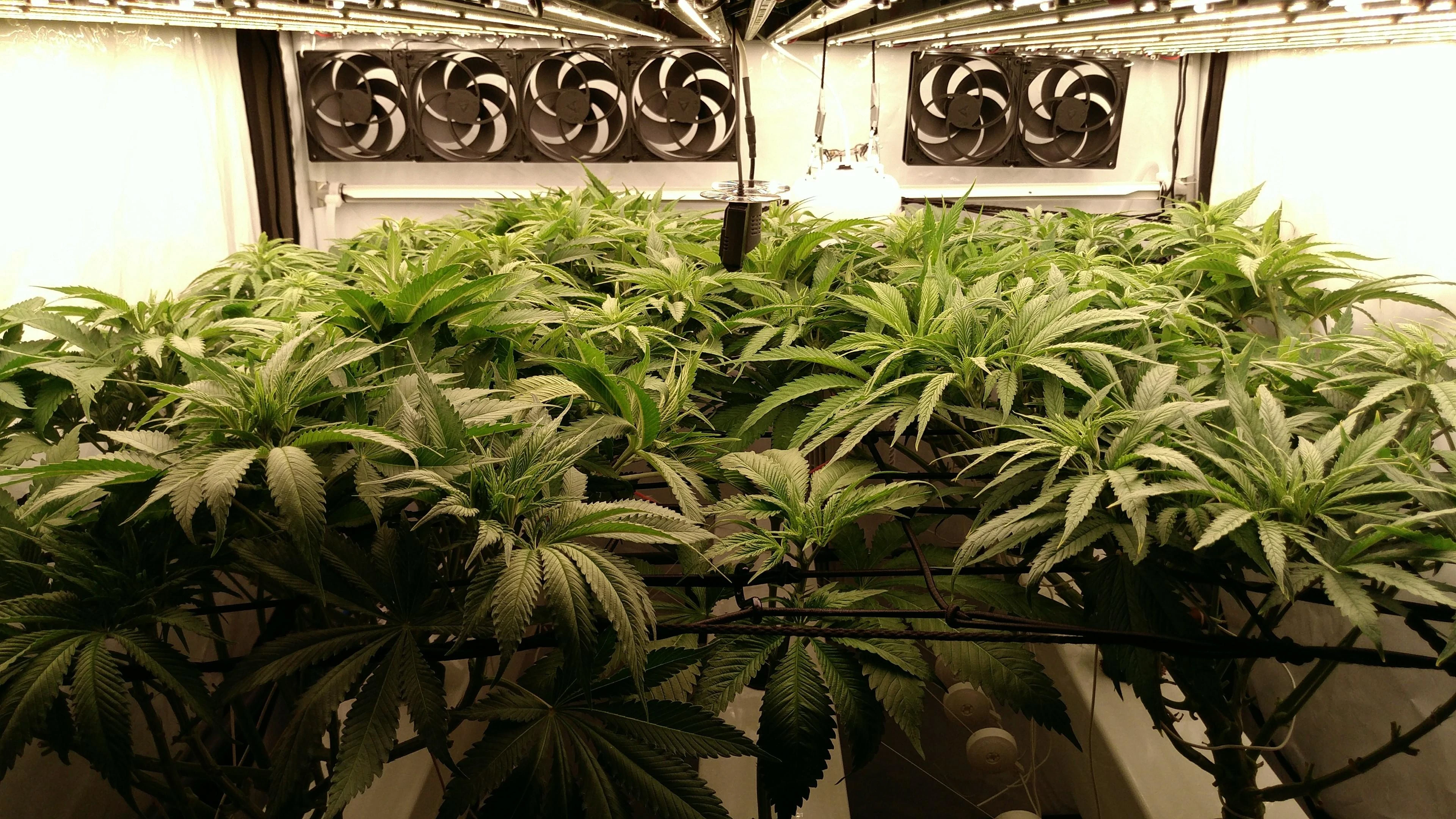 Die Tops stehen so dicht, dass meine größte Sorge stagnierende, feuchte Luft ist. Also Blätter dazwischen weg, Umluft höher gedreht und ein paar kWh mehr in Entfeuchtung. Gerade bei dem oft schwülen Wetter die Tage.