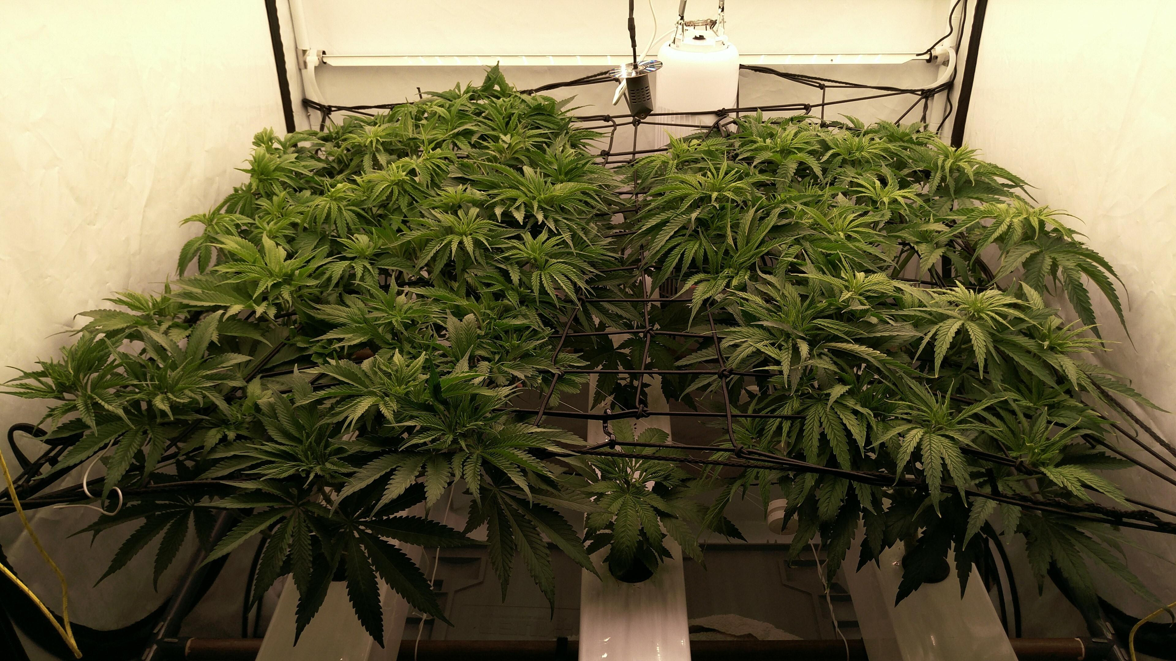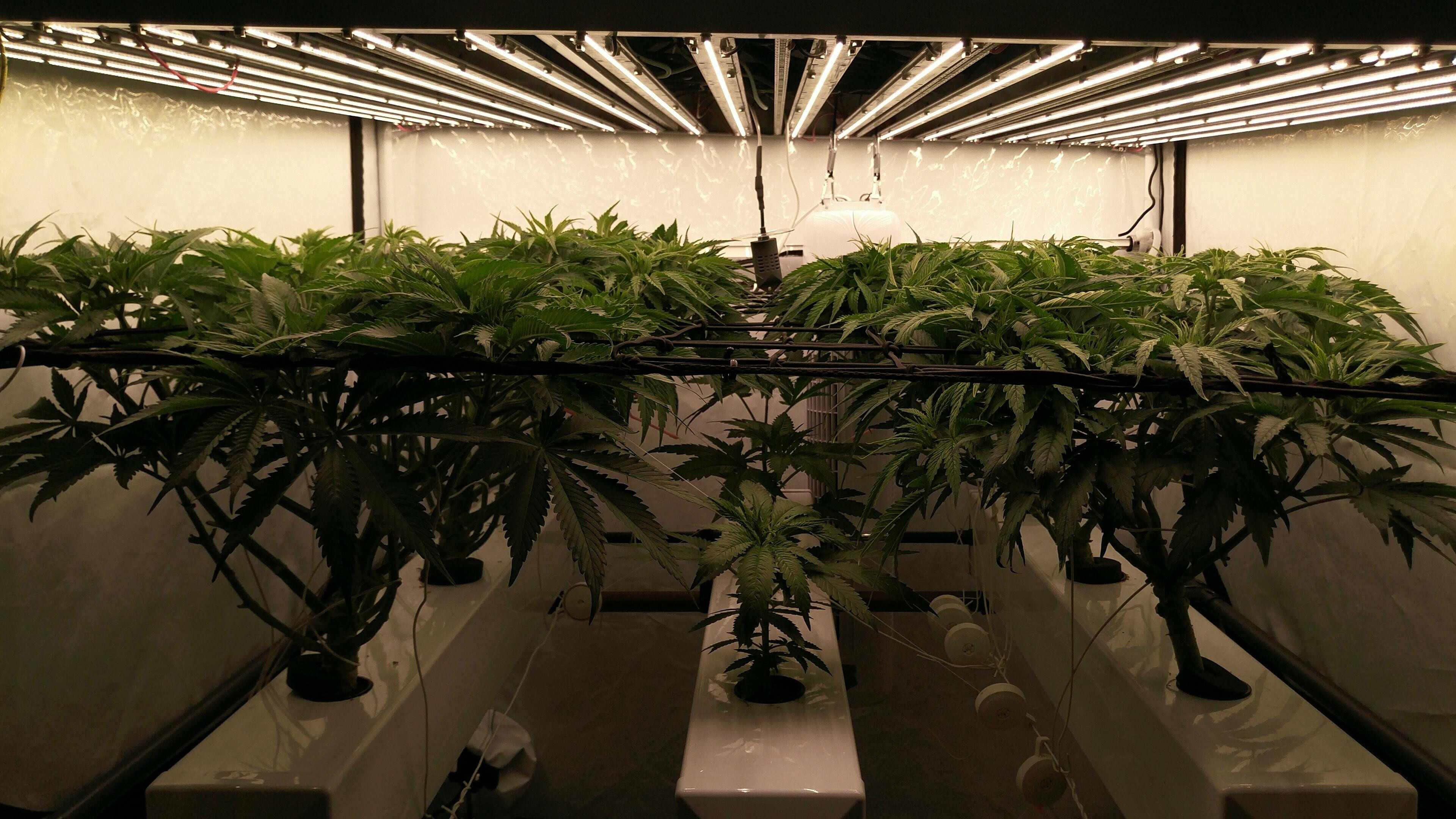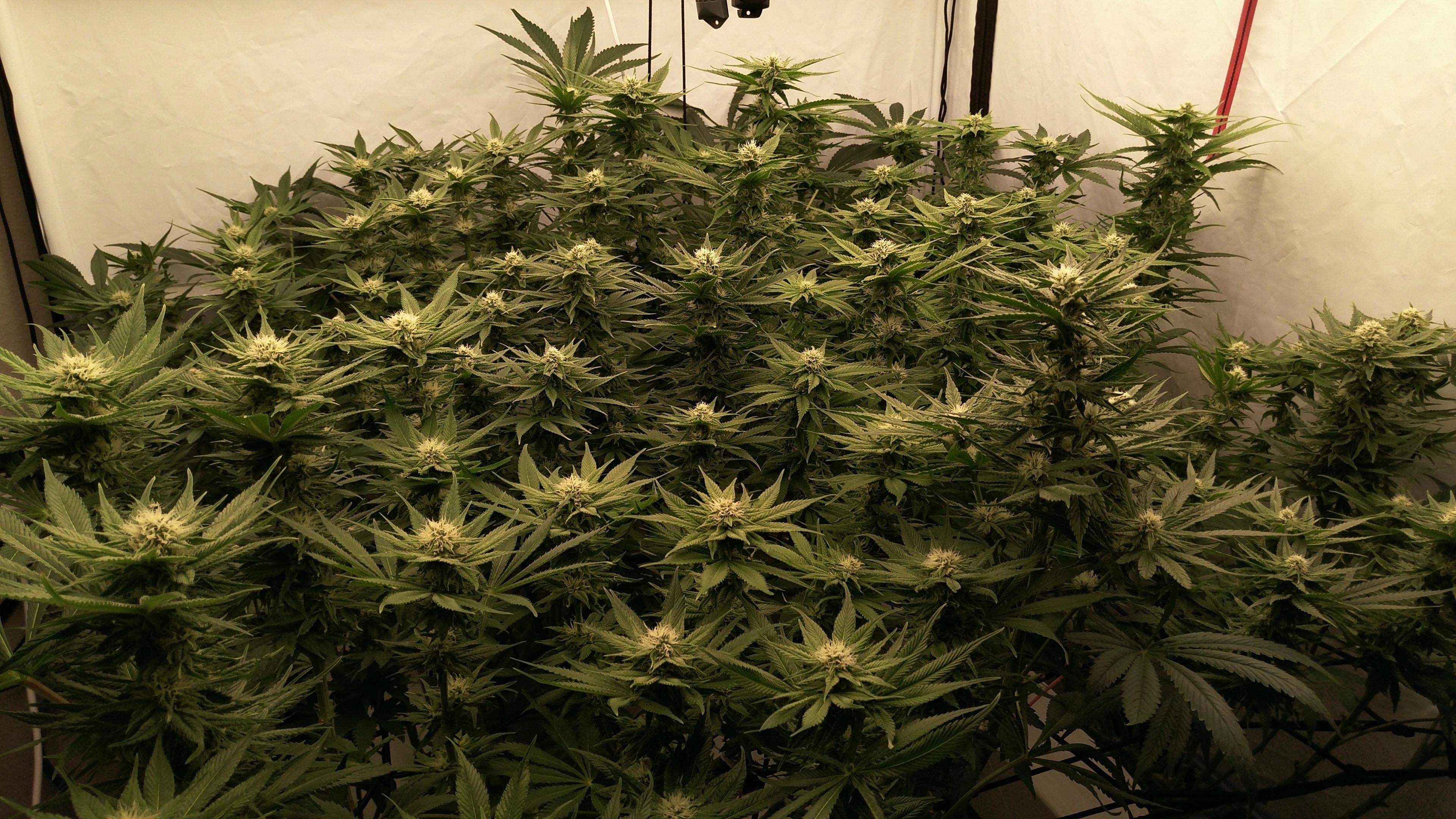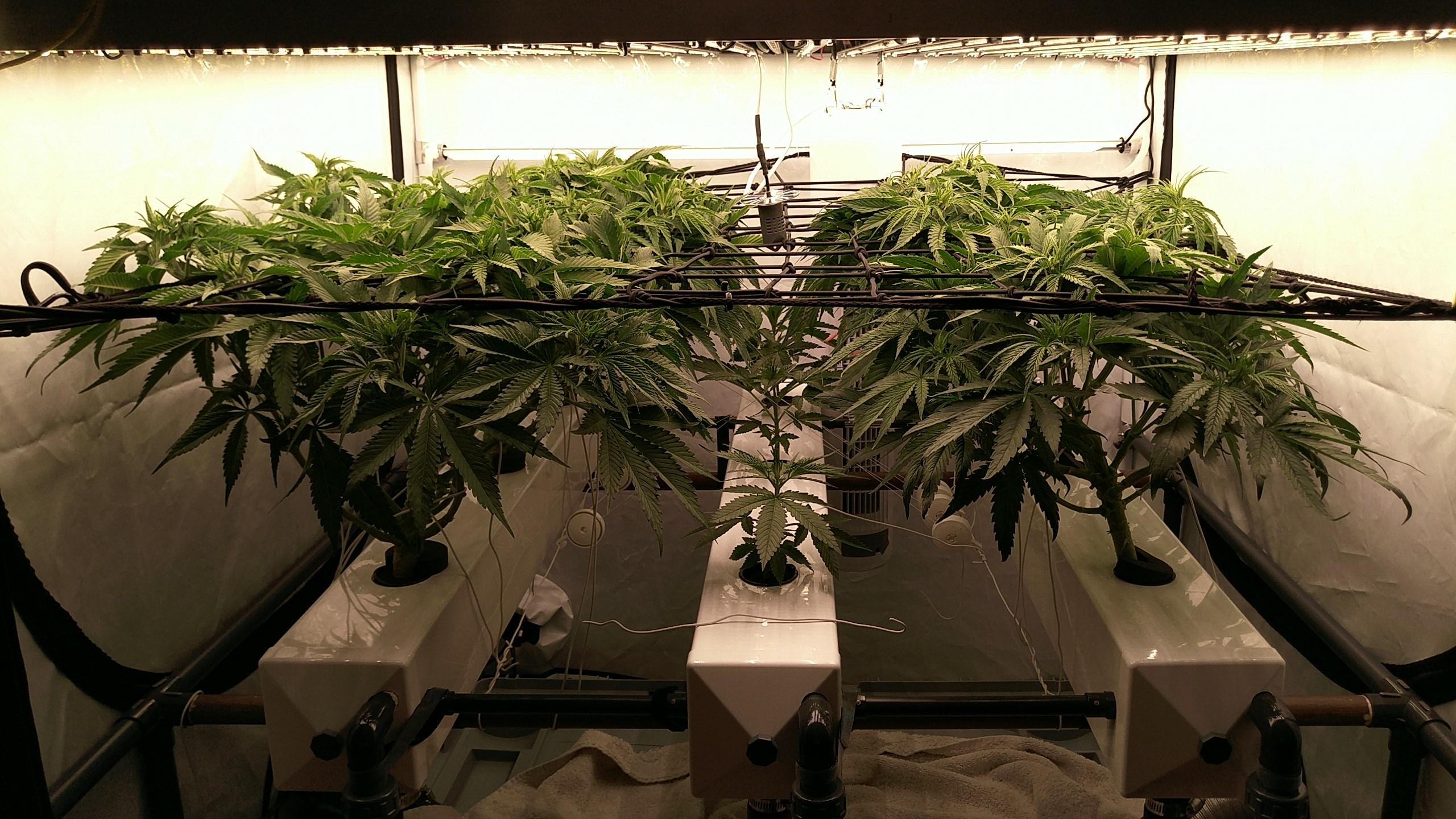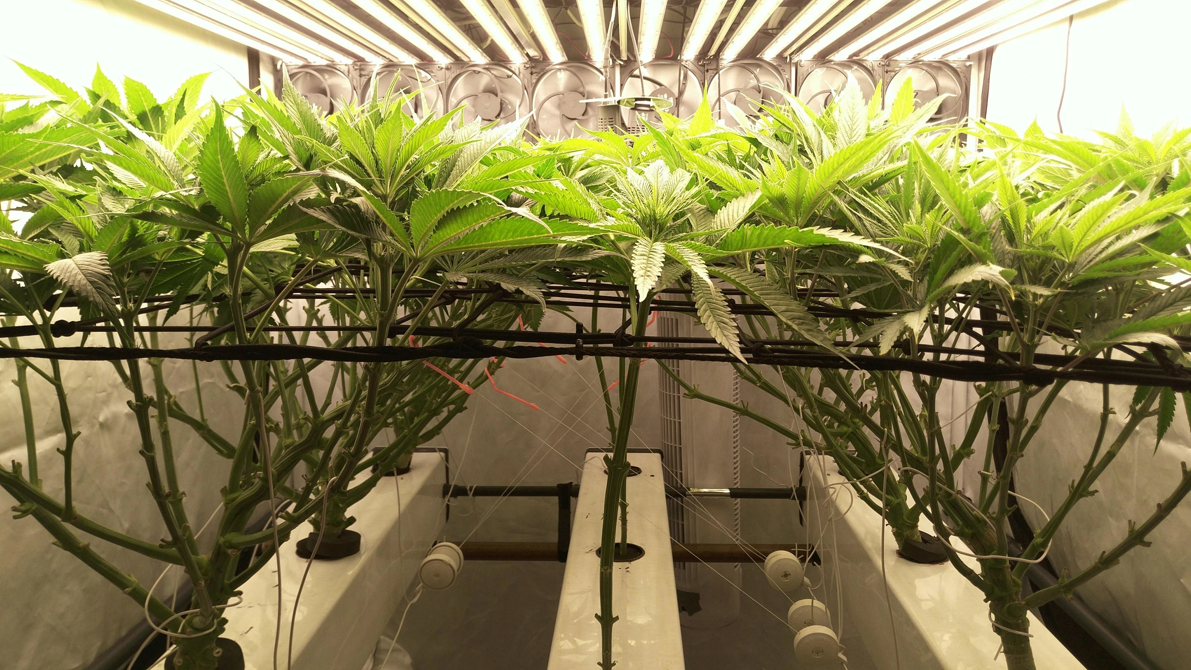 Die Tops stehen so dicht, dass meine größte Sorge stagnierende, feuchte Luft ist. Also Blätter dazwischen weg, Umluft höher gedreht und ein paar kWh mehr in Entfeuchtung. Gerade bei dem oft schwülen Wetter die Tage.