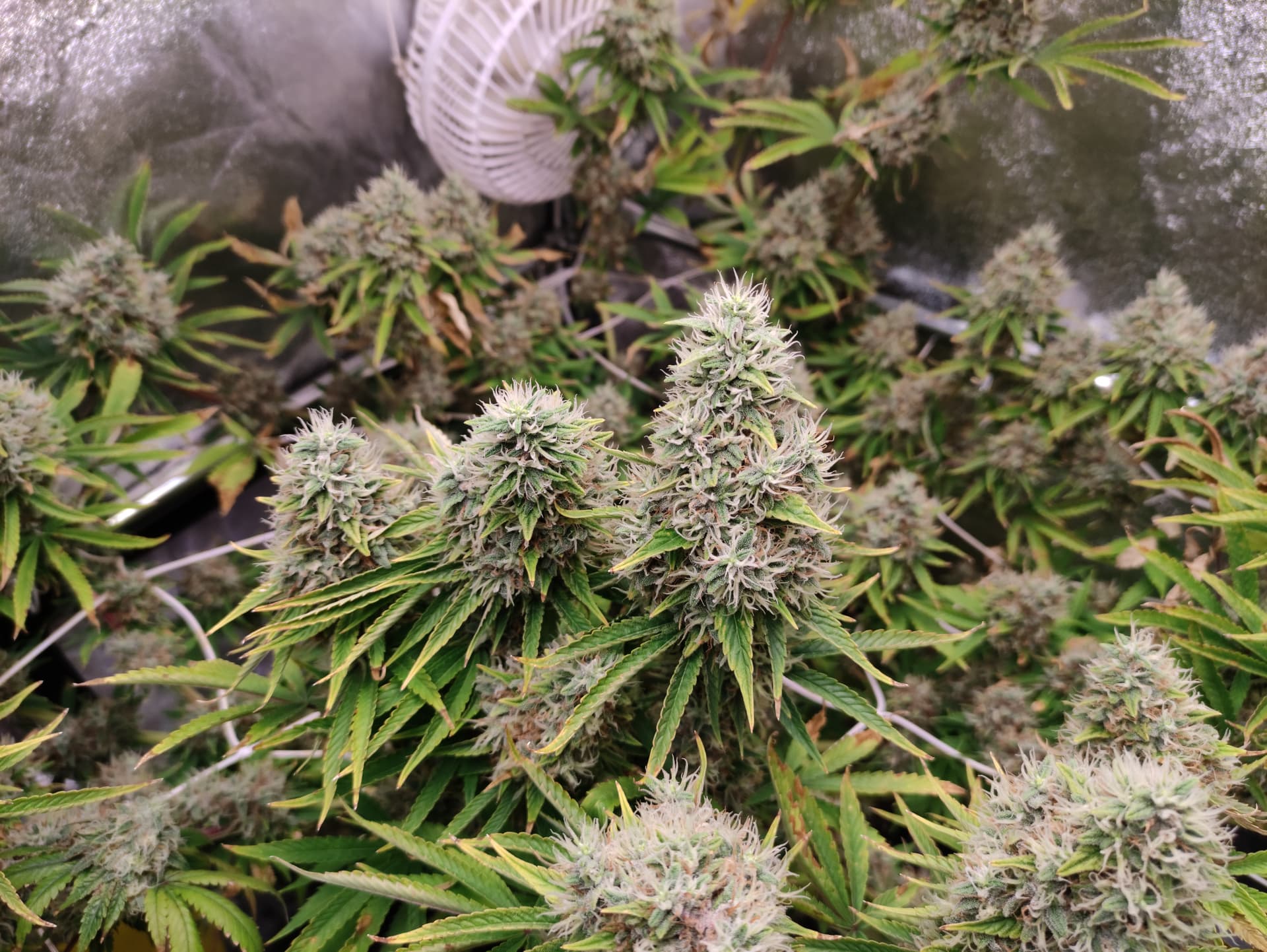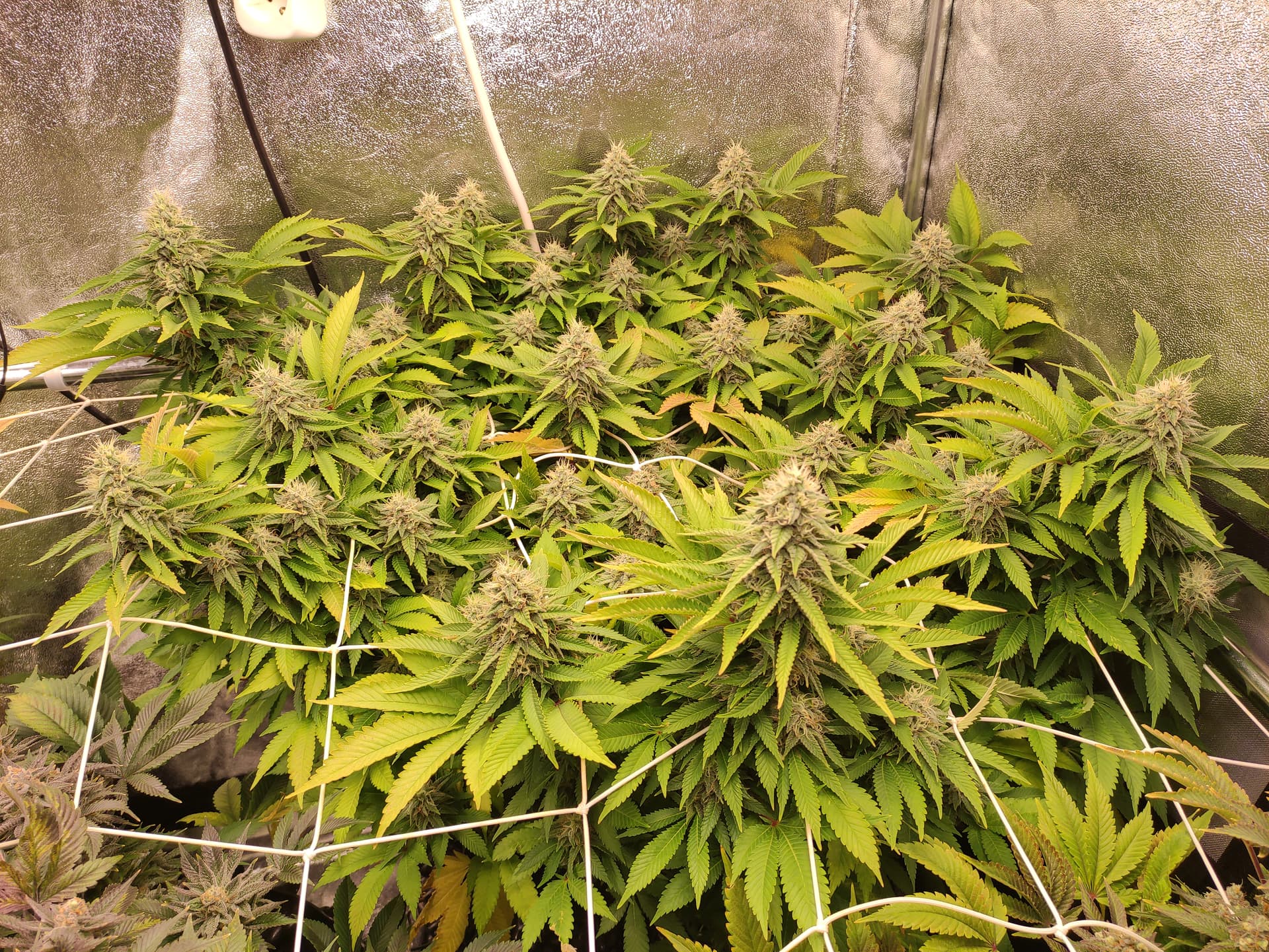 Kali Mist von Serious Seeds hatte jetzt keine übertrieben riesigen Buds, ich hab aber auch Scrog in der Blüte und LST im frühen Wachstum angewandt. Lange Rede kurzer Sinn: