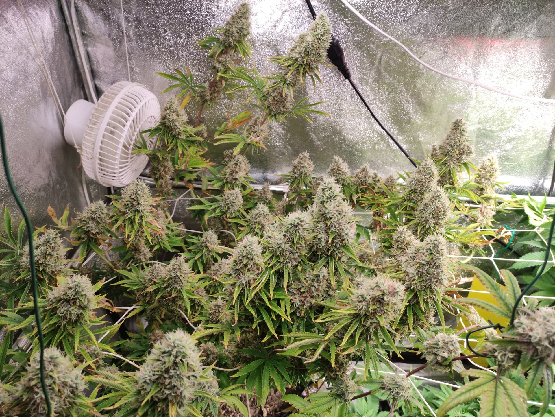 Indoor hat 1 Pflanze, auf 0,45m², nach 4 Wochen Wachstum und 13 Wochen Blüte 344g Trocken und getrimmt abgeworfen.