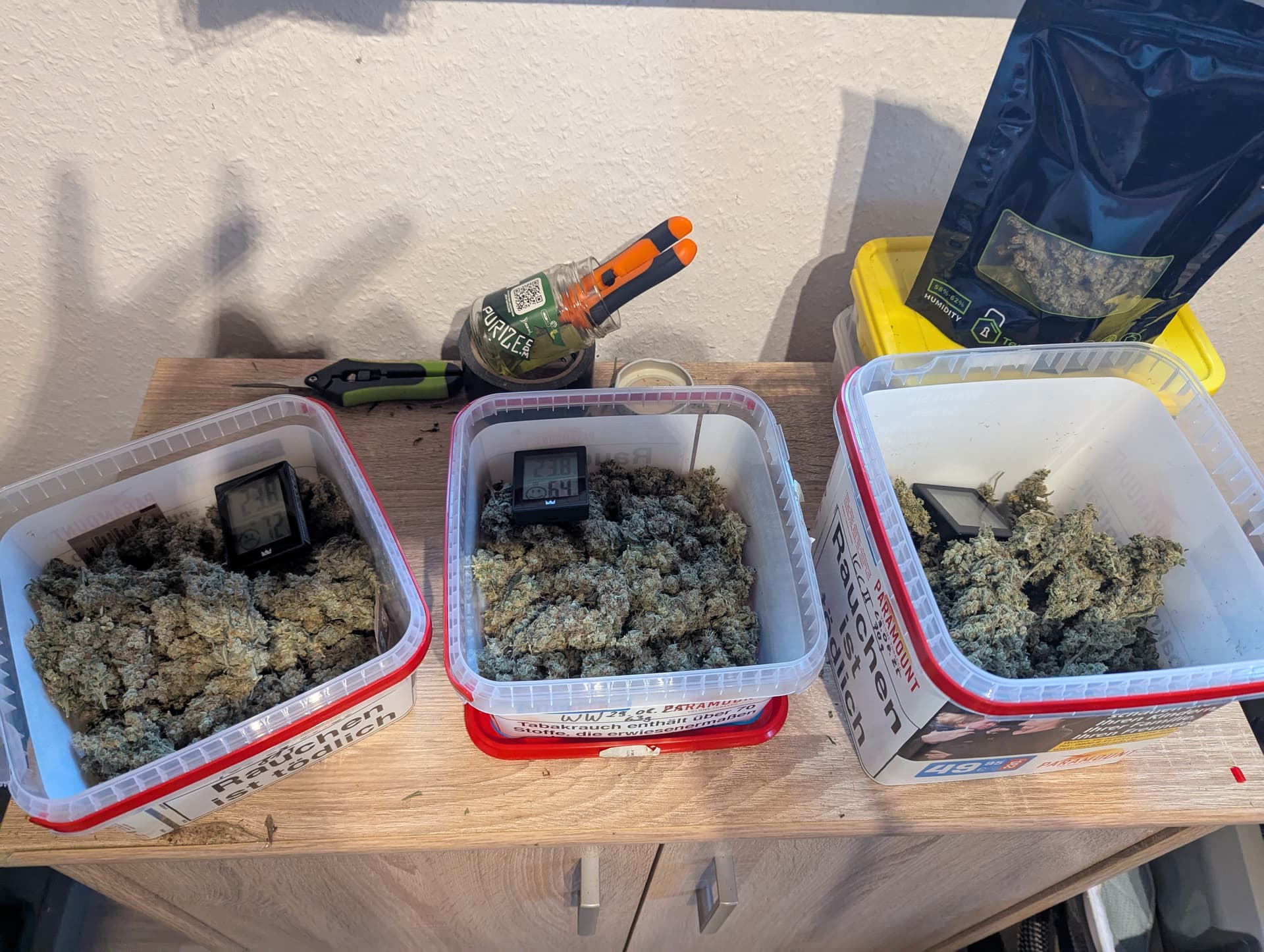 Die Luftfeuchtigkeit habe ich durch regelmäßiges Lüften und neu Verteilung der Ernte im Glas recht schnell auf stabile 62% bekommen und so verweilen die kostbaren Teile im dunklen Schrank.