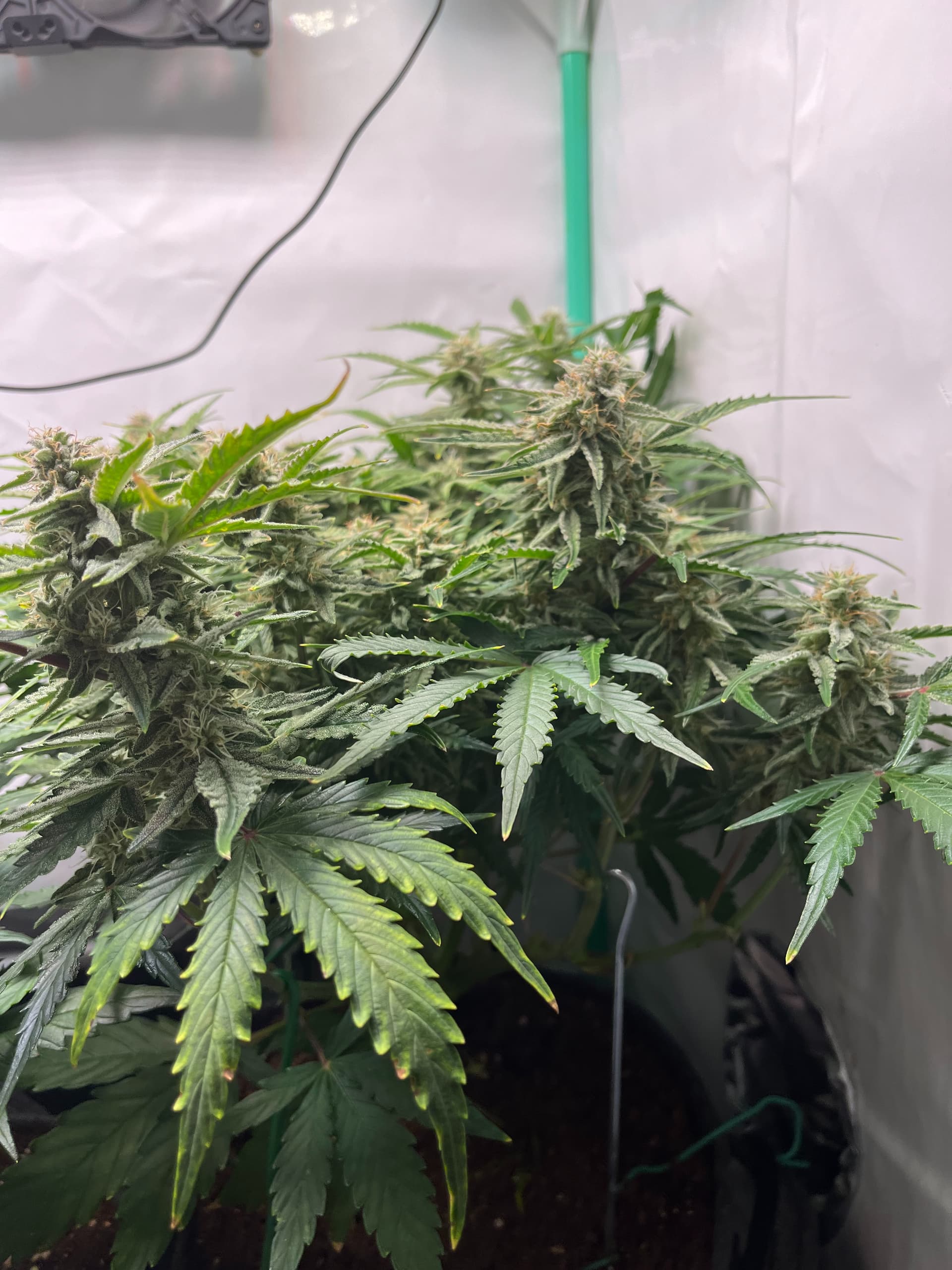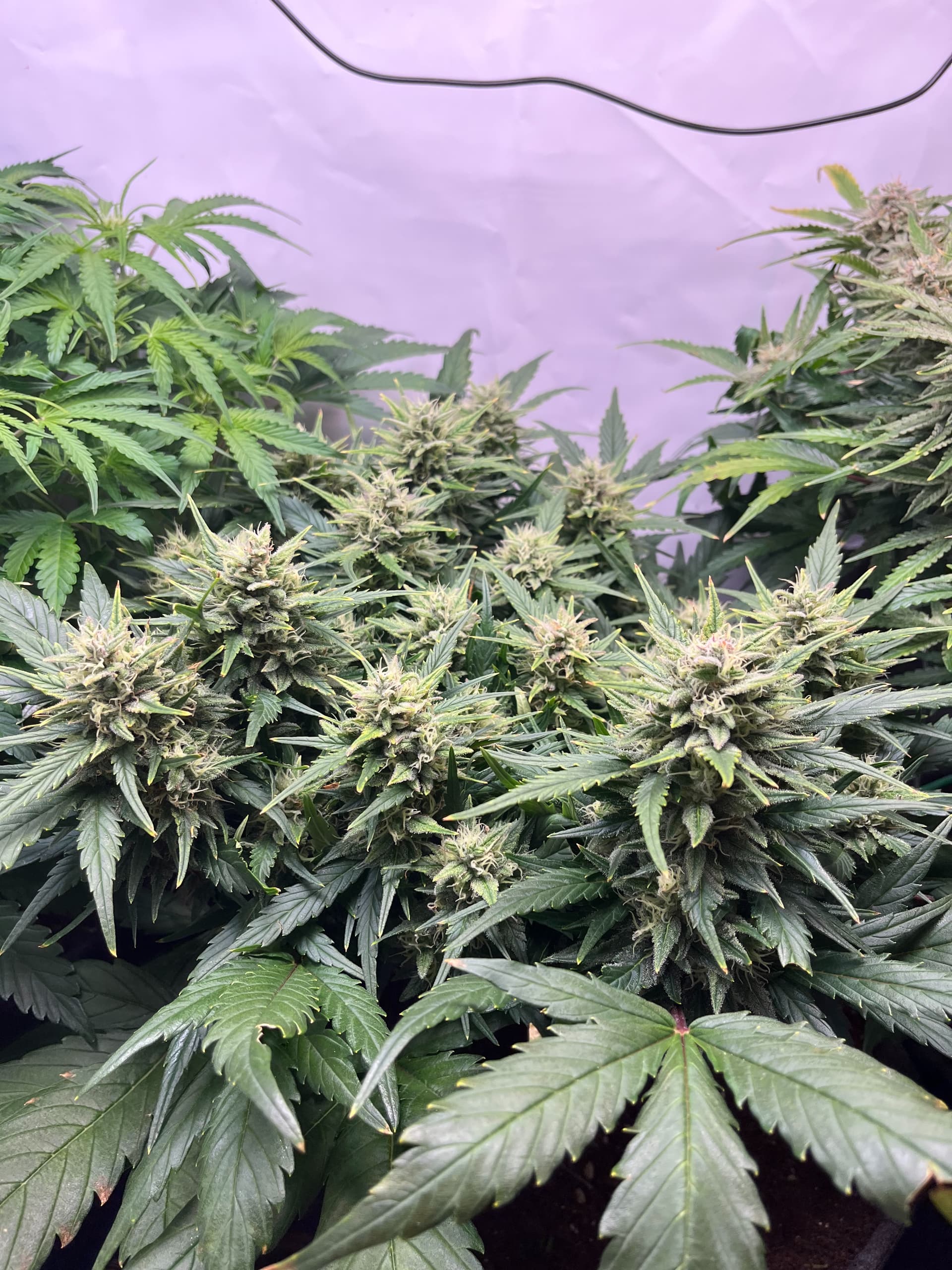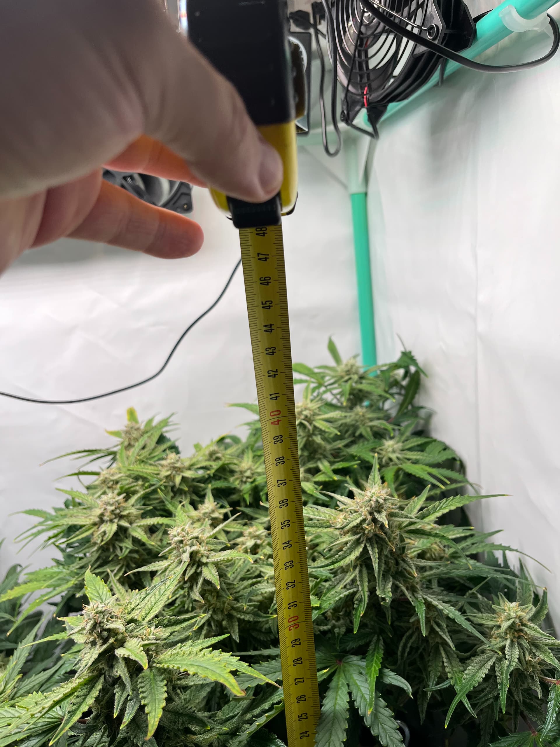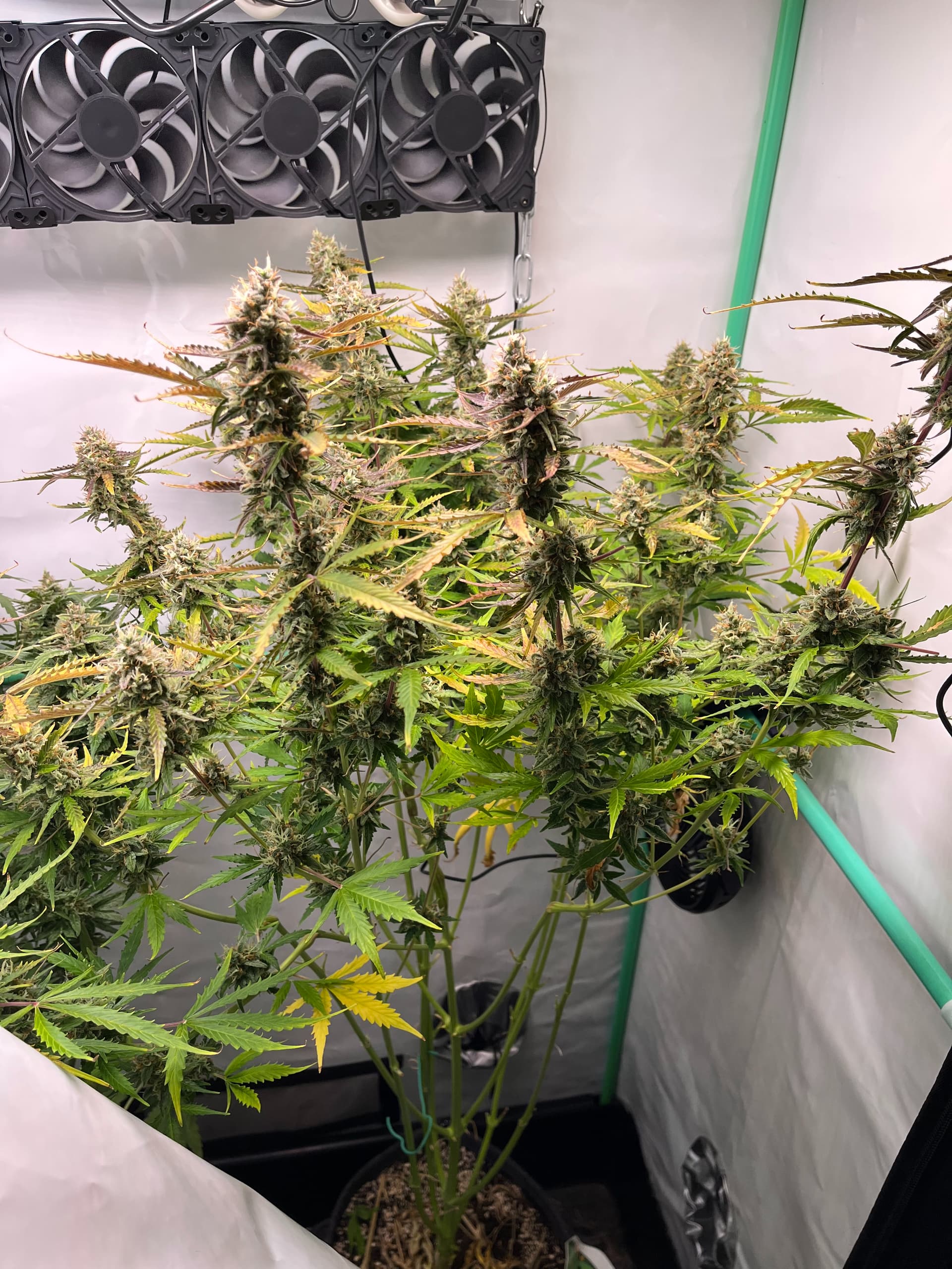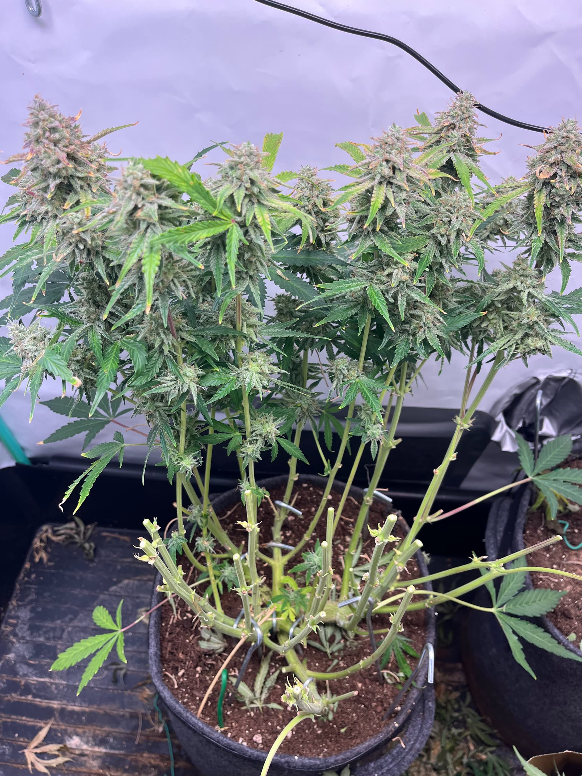 hier die F1 ca. 5 Wochen alt nach topping und LST, viel Licht, viel Wind hat auch sehr stark reagiert, dachte eigentlich eine der größten F1 würde da stärker gegen arbeiten aber seht selbst, hat einen schönen dicken Stamm aber ist auch sehr niedrig.