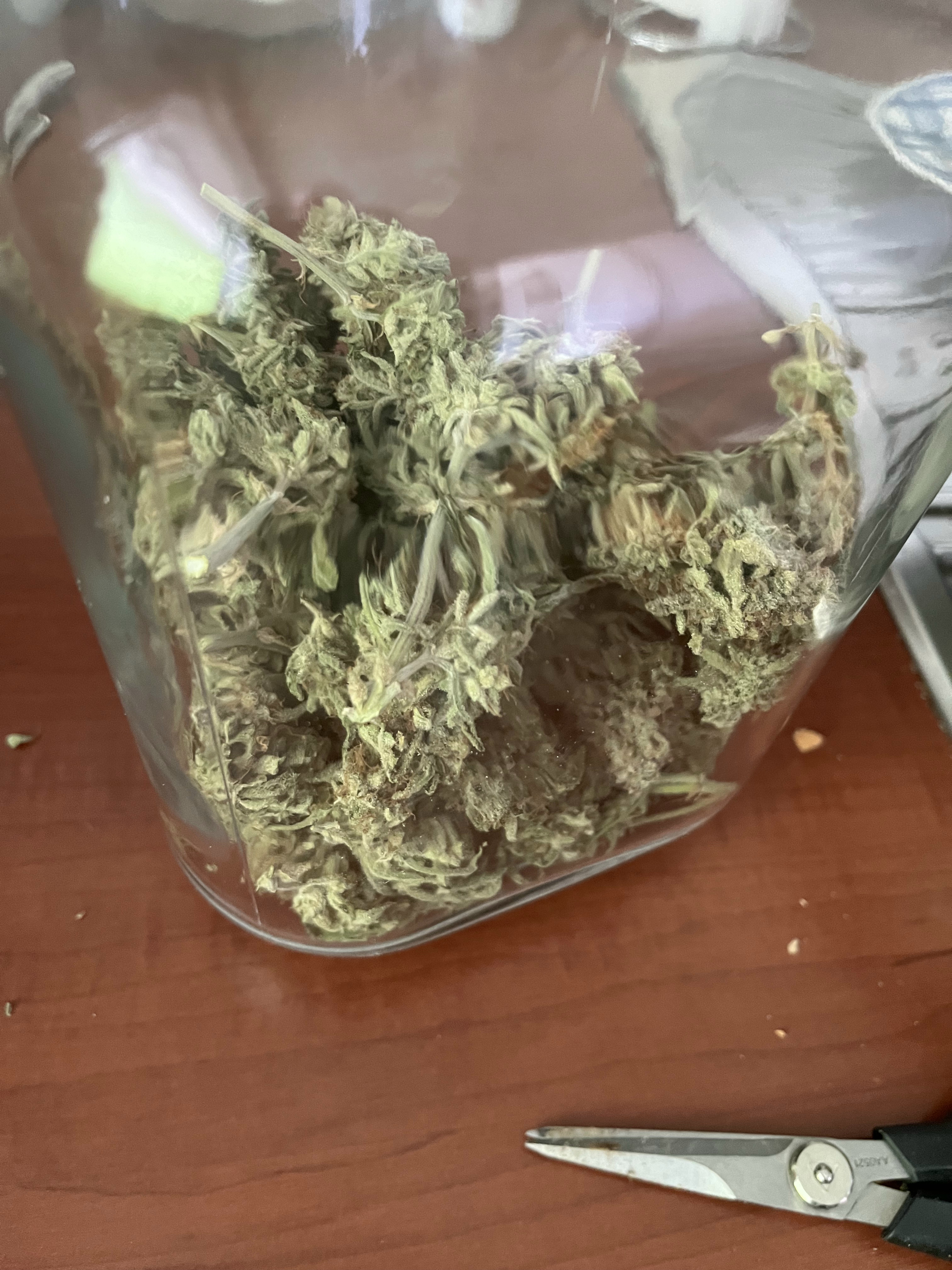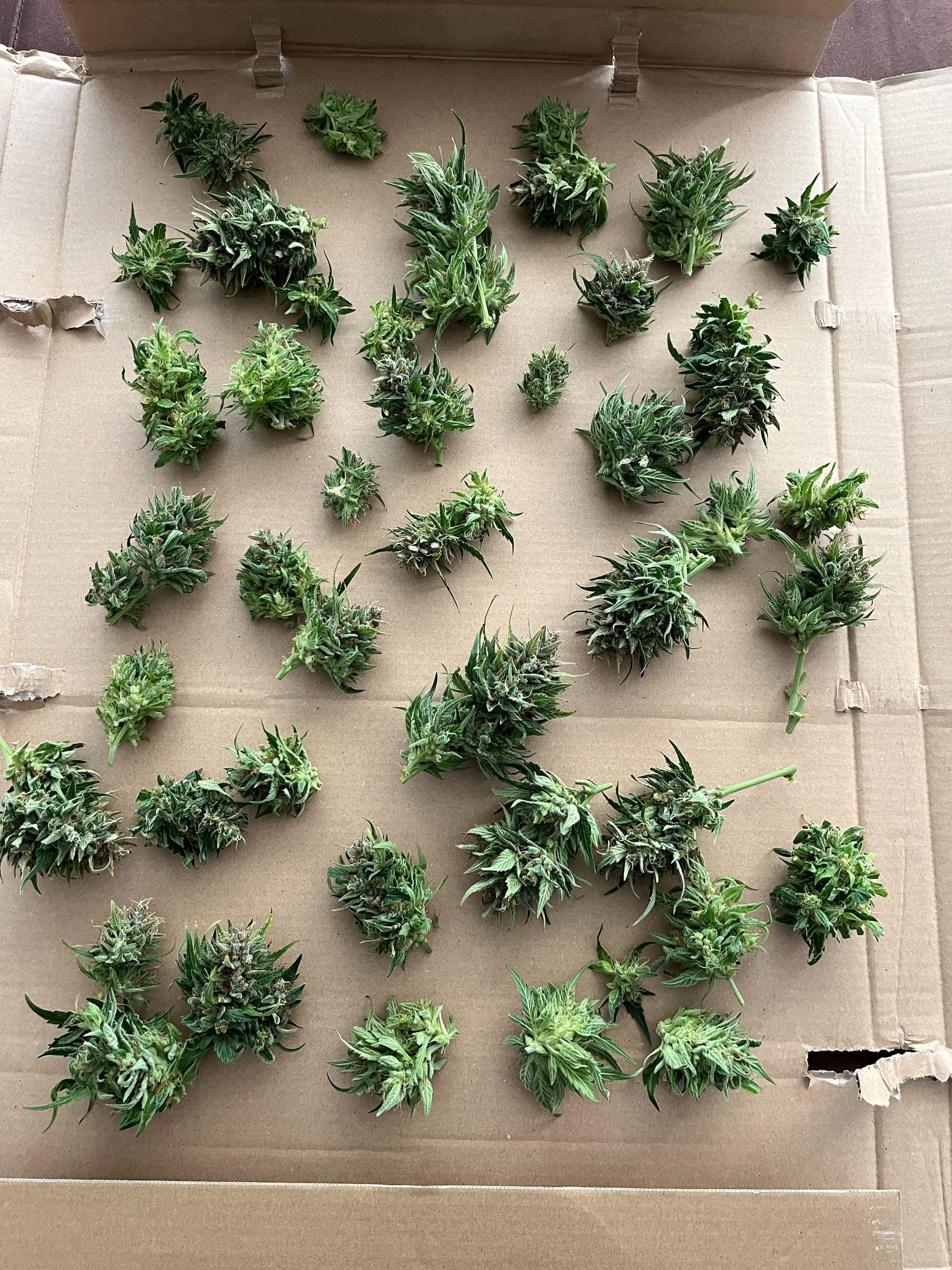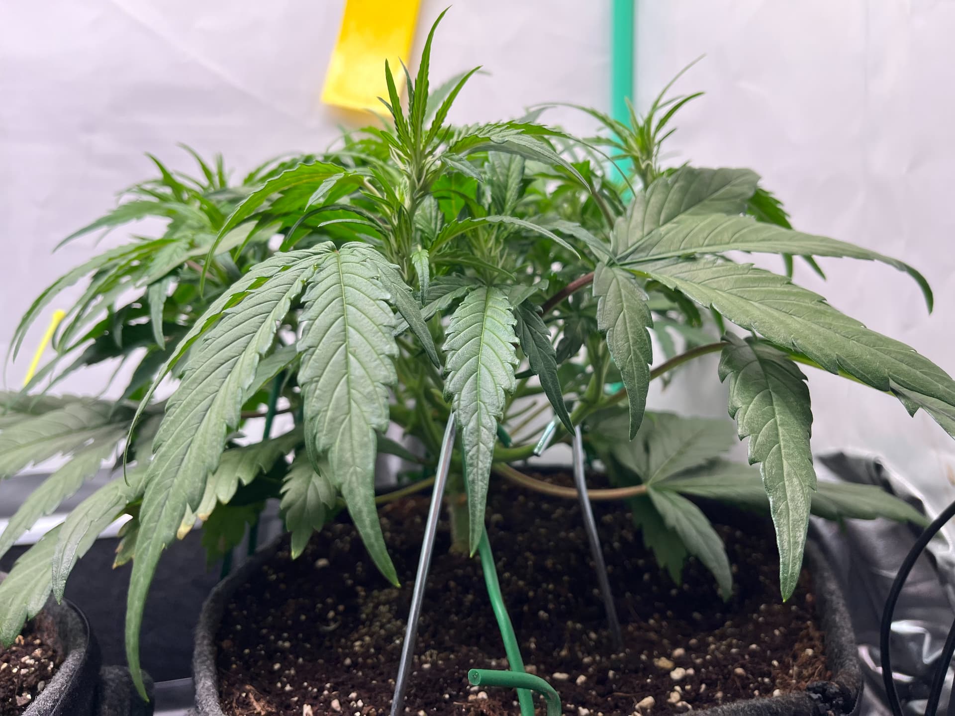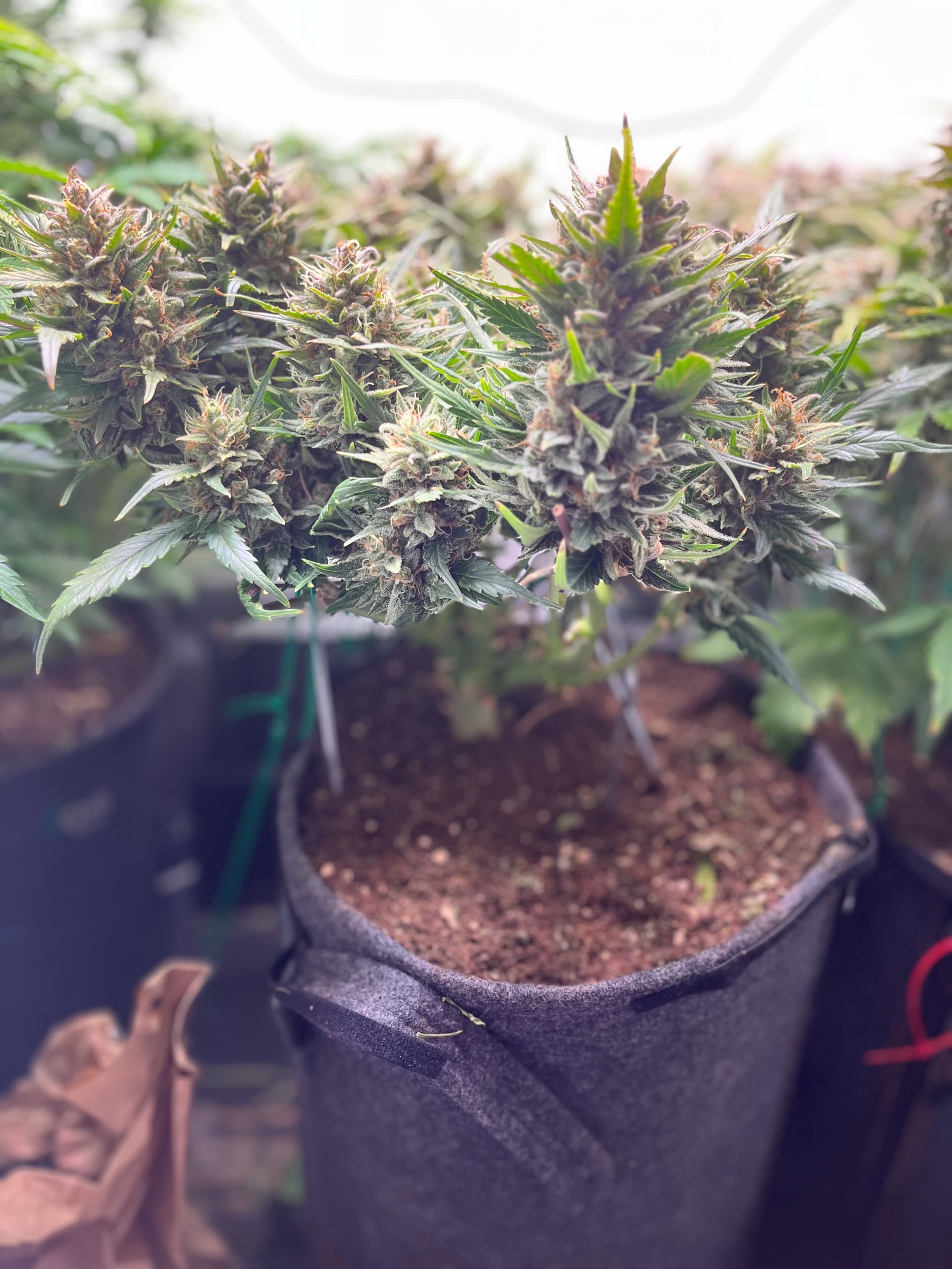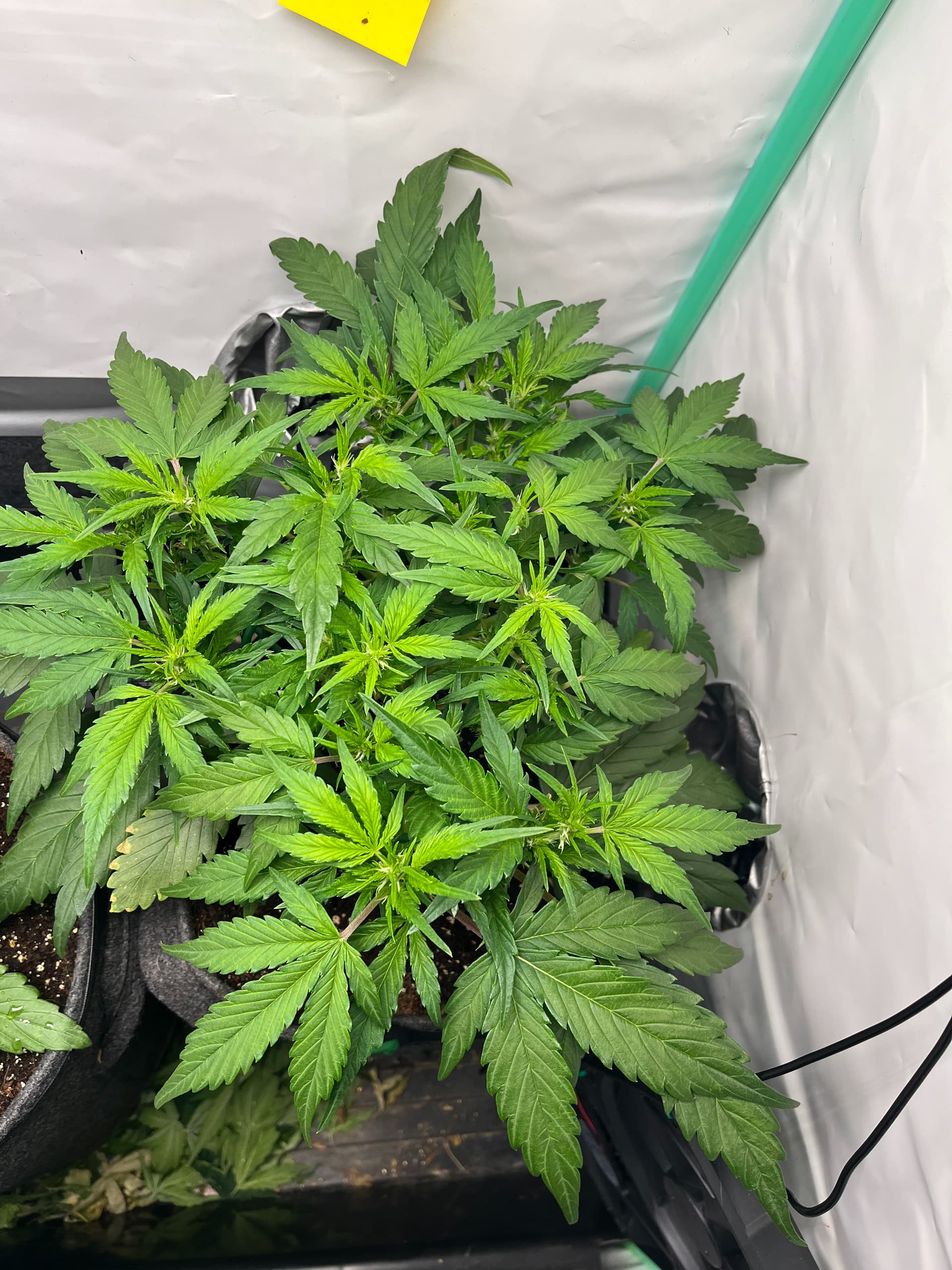 hier die F1 ca. 5 Wochen alt nach topping und LST, viel Licht, viel Wind hat auch sehr stark reagiert, dachte eigentlich eine der größten F1 würde da stärker gegen arbeiten aber seht selbst, hat einen schönen dicken Stamm aber ist auch sehr niedrig.