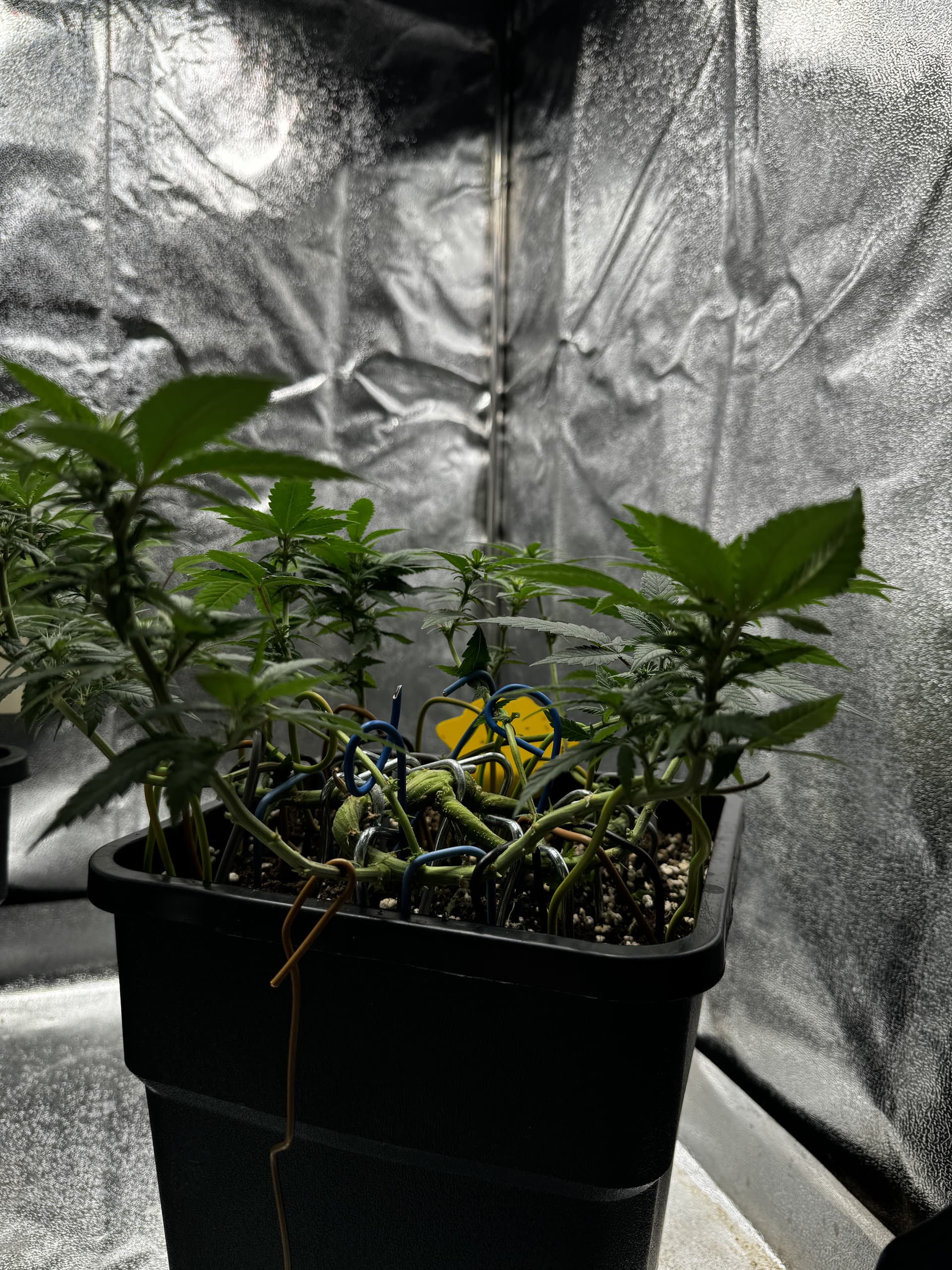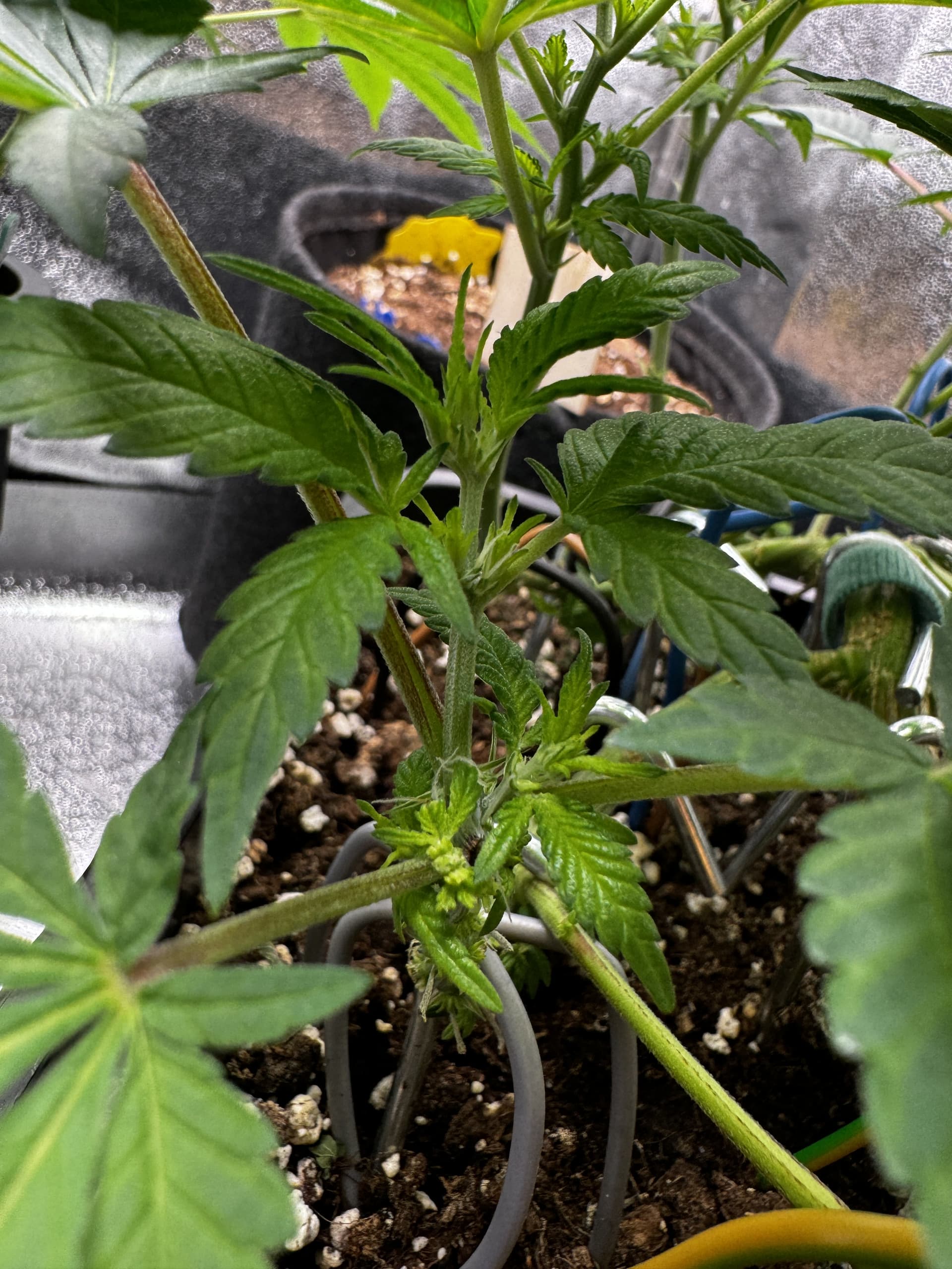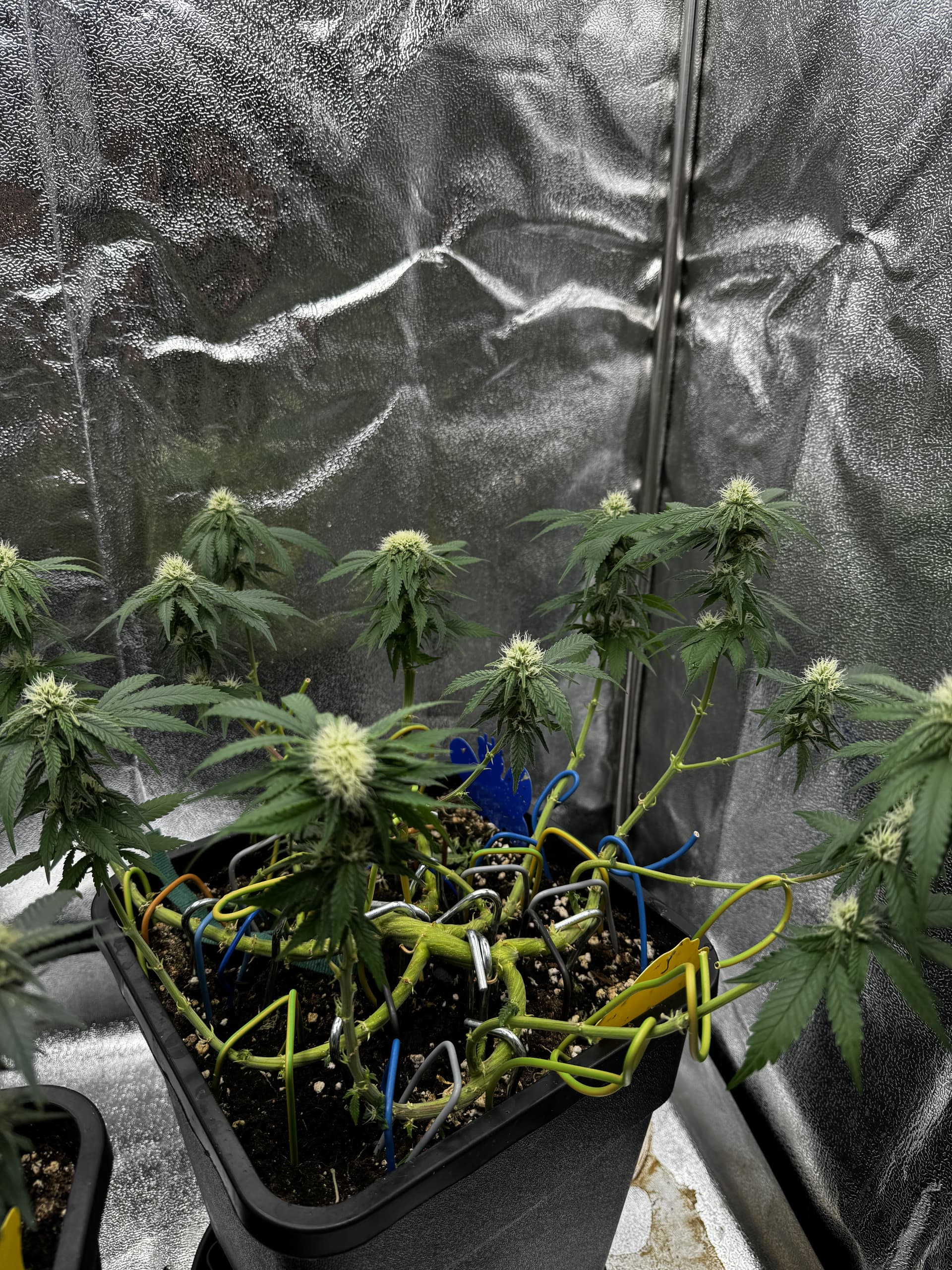 Die Buds werden mittlerweile recht schwer, so dass ich Sorge habe, dass der ein oder andere Trieb abknicken könnte, heißt ich werde jetzt auf jeden Fall täglich nach den beiden schauen. Ich habe das Scrog Netz eingezogen um die Buds ein bisschen abzustützen und ebenfalls ein paar Schaschlik Spieße eingesetzt.