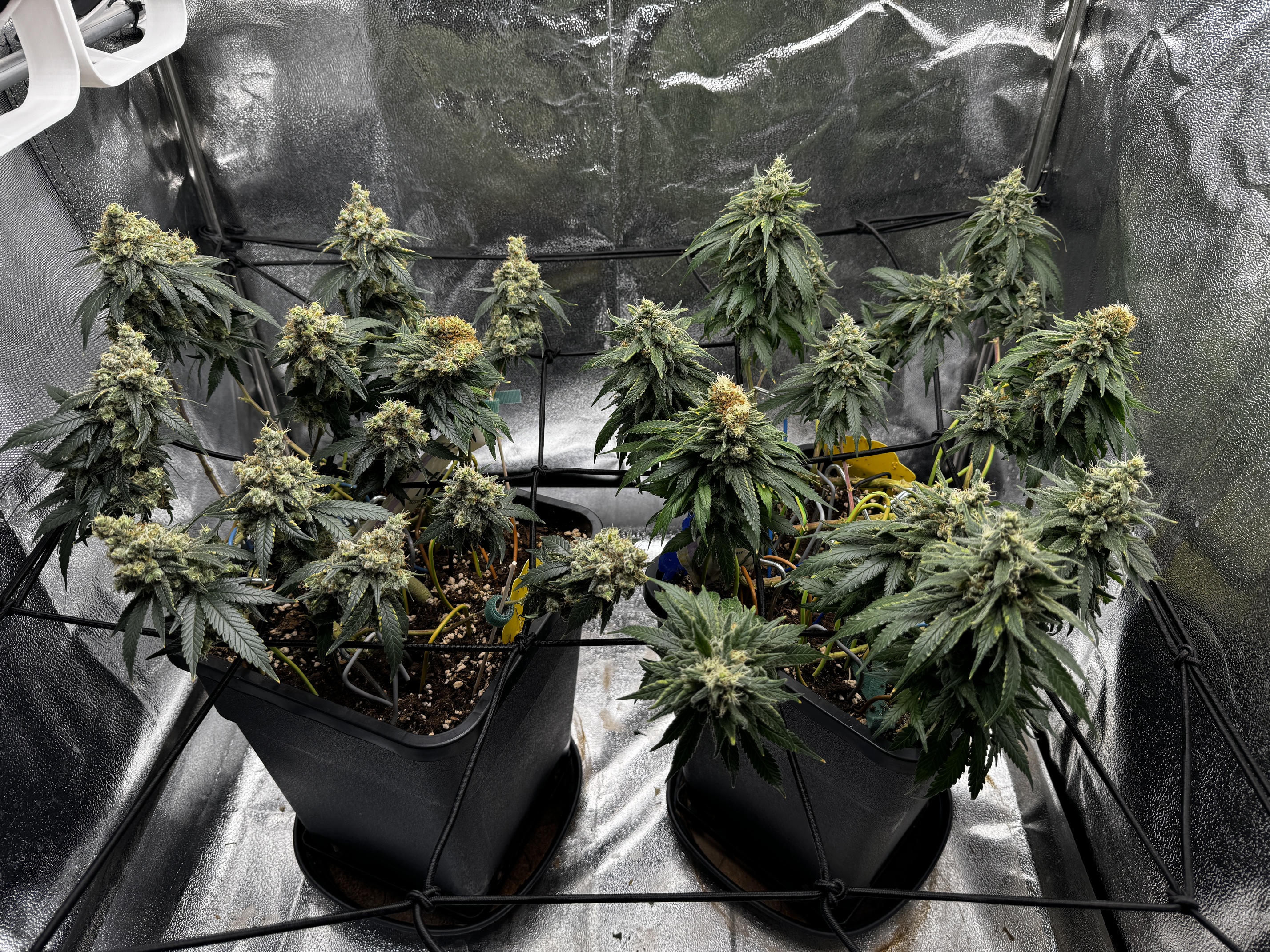 Die beiden Special Queen wurden nochmal rasiert und etwas runter gebunden, damit alle Triebe auf derselben Höhe sind. Seit Sonntag stehen die Ladys unter 12/12 Sonne.