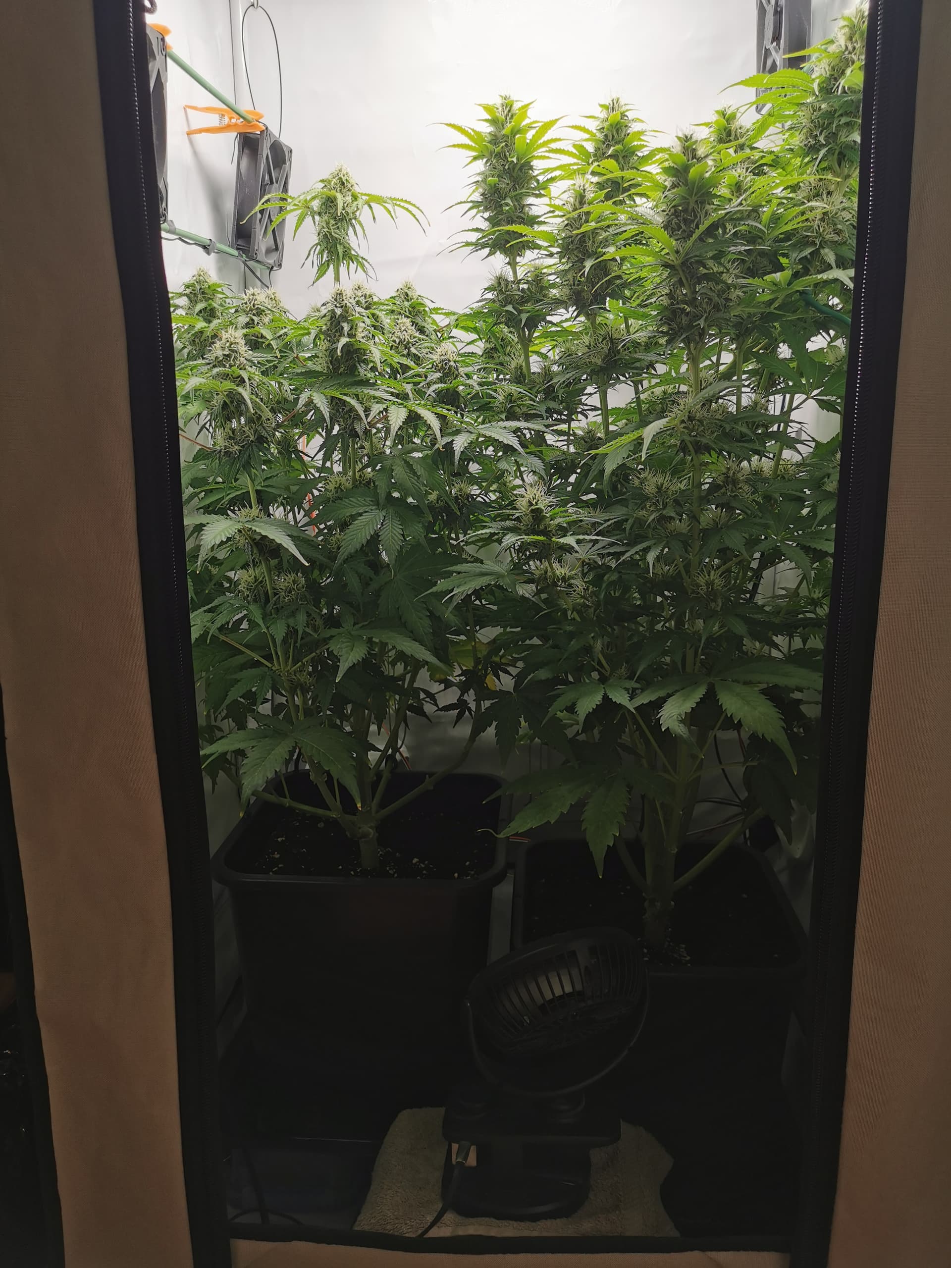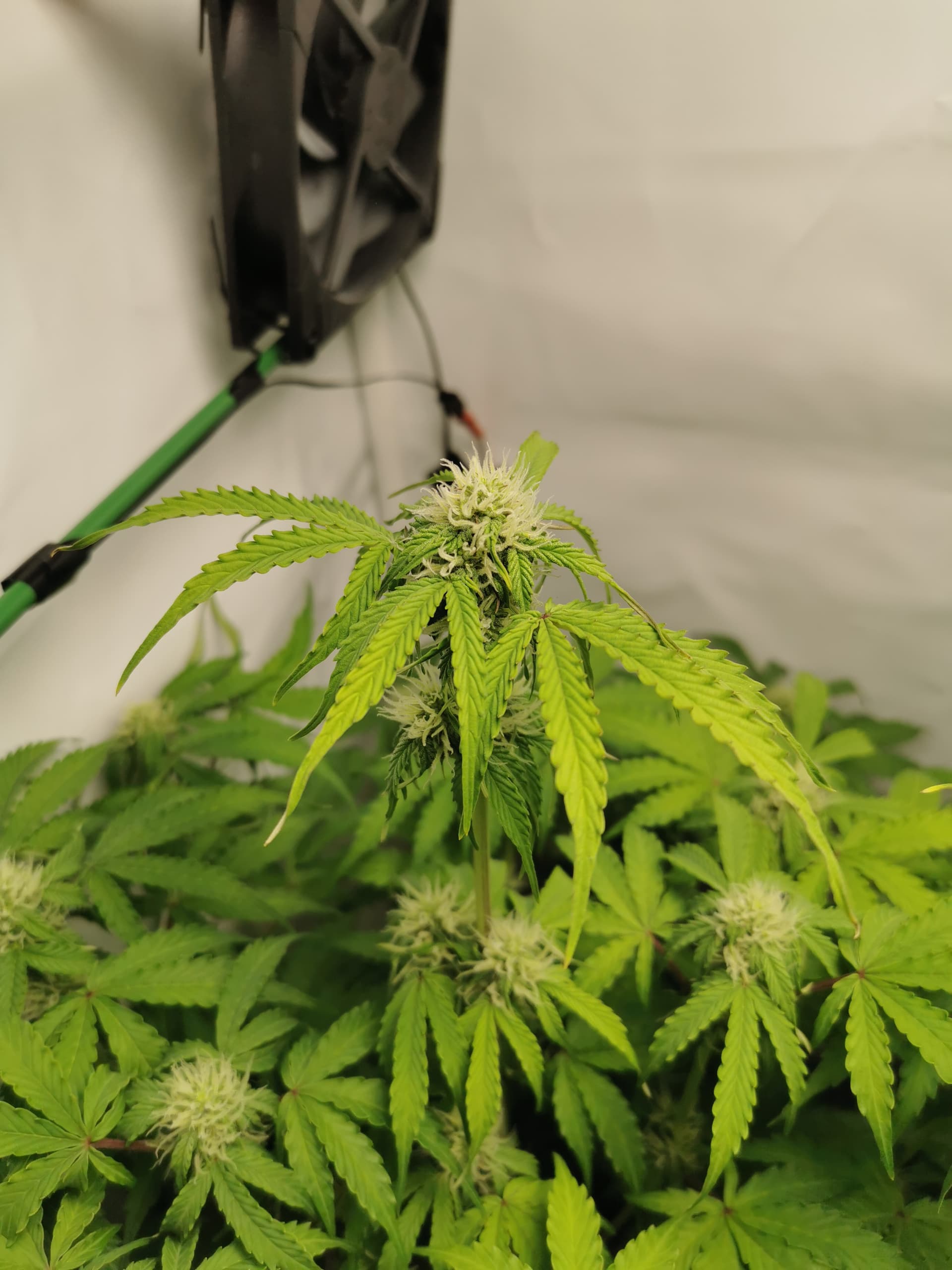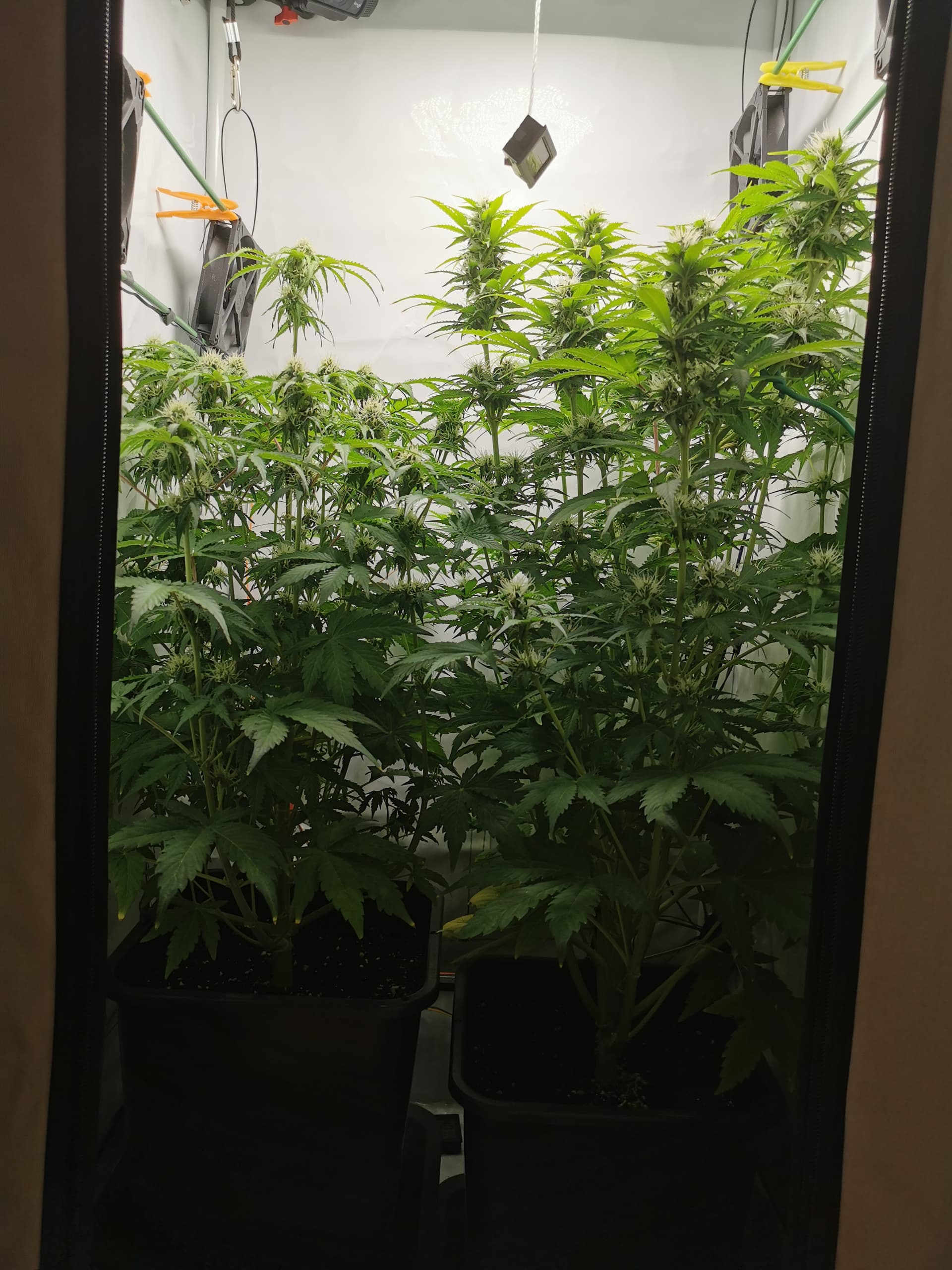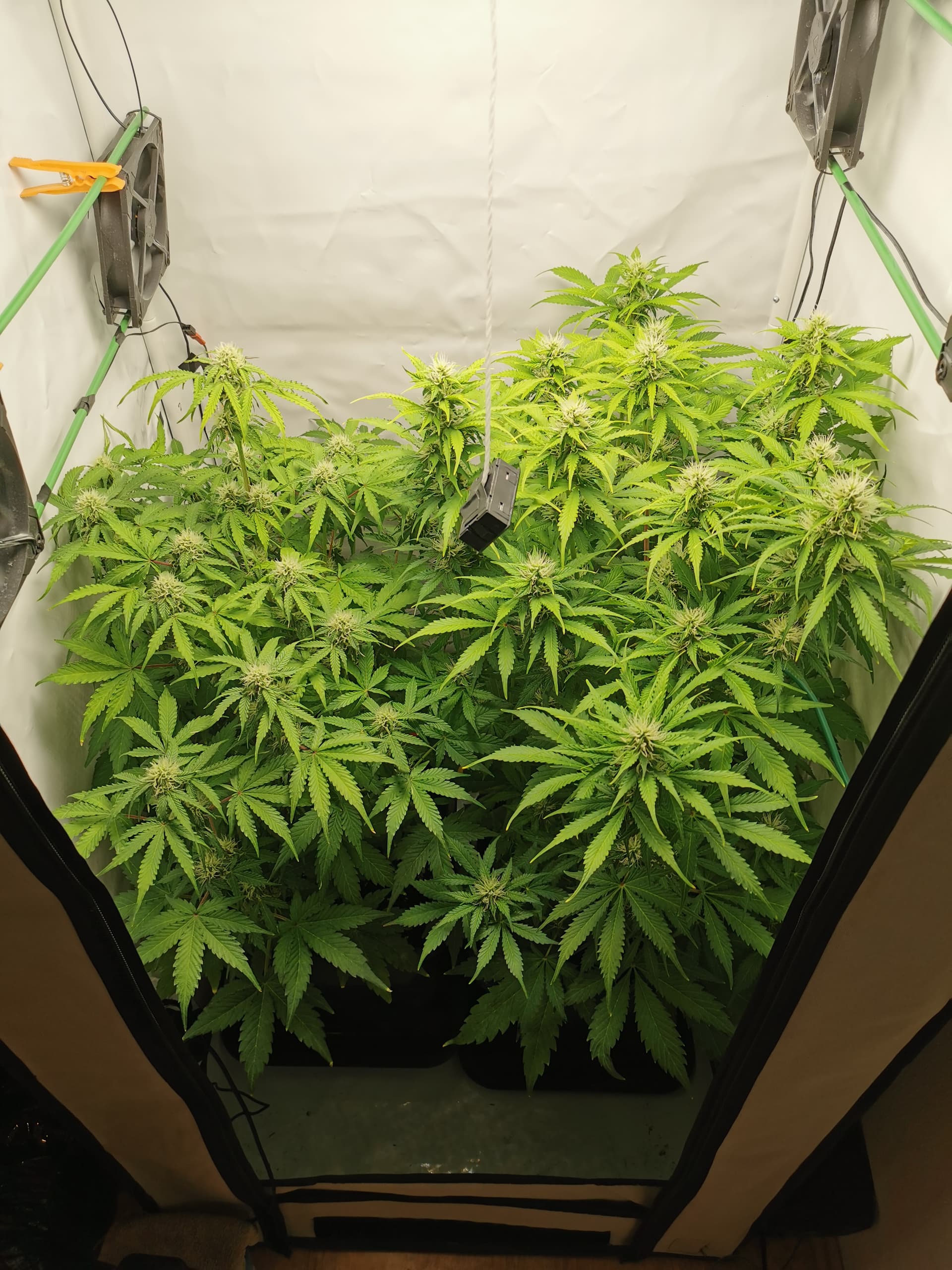 Für die Hochblüte die jetzt beginnt, schnapp dir ein Thermo-/Hygrometer wie du es später zum Curing nutzen wirst und häng es in der Mitte vom Zelt auf Höhe der Blattspitzen auf. Dann bring die 100Watt Lampe auf 20cm ran. Falls die Temperatur 27° übersteigt muss die Lampe ein wenig höher aber mit 100W … geh bis 20cm oder 27° ran… hast gesteigerten Stoffwechsel und das Licht dringt viel tiefer in die Pflanze.