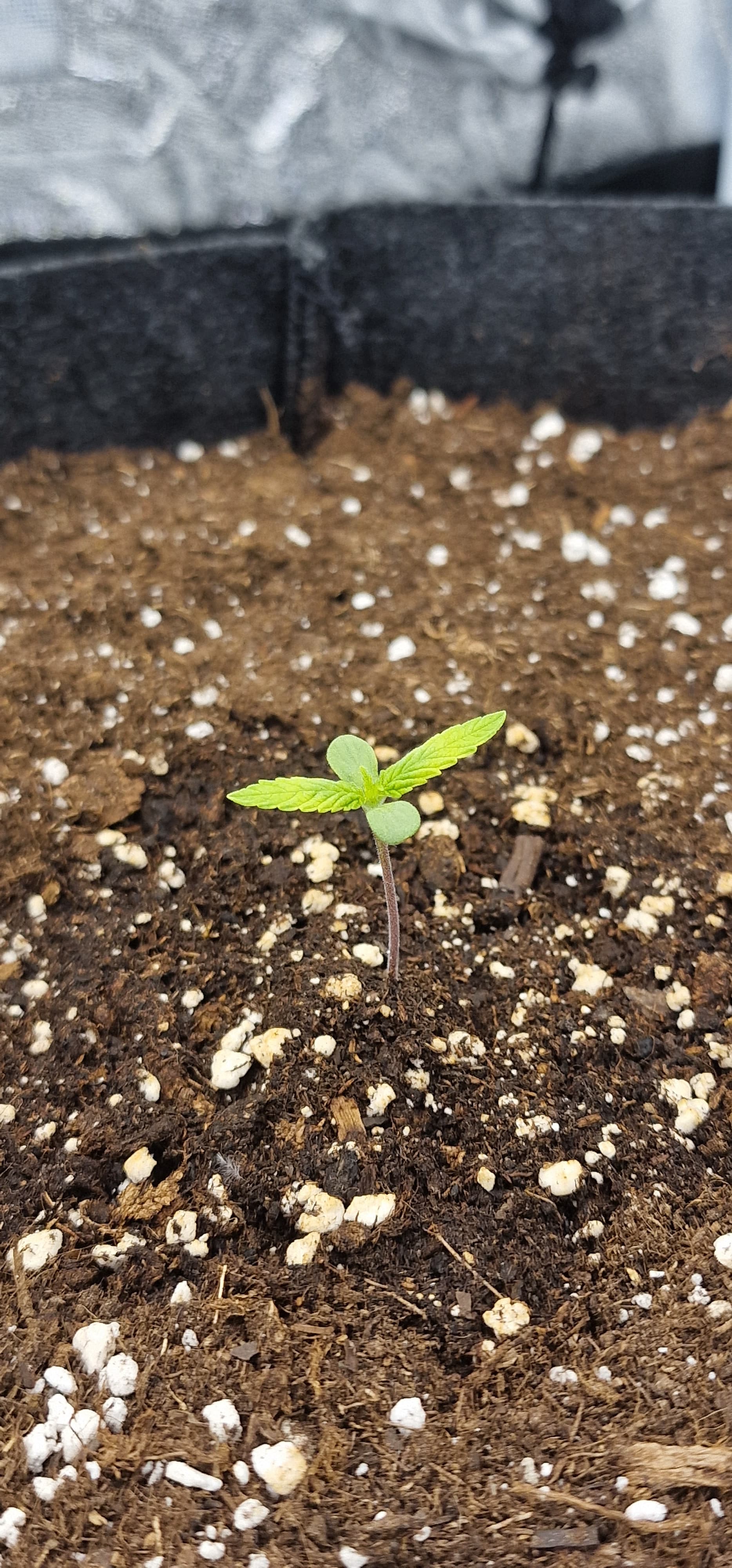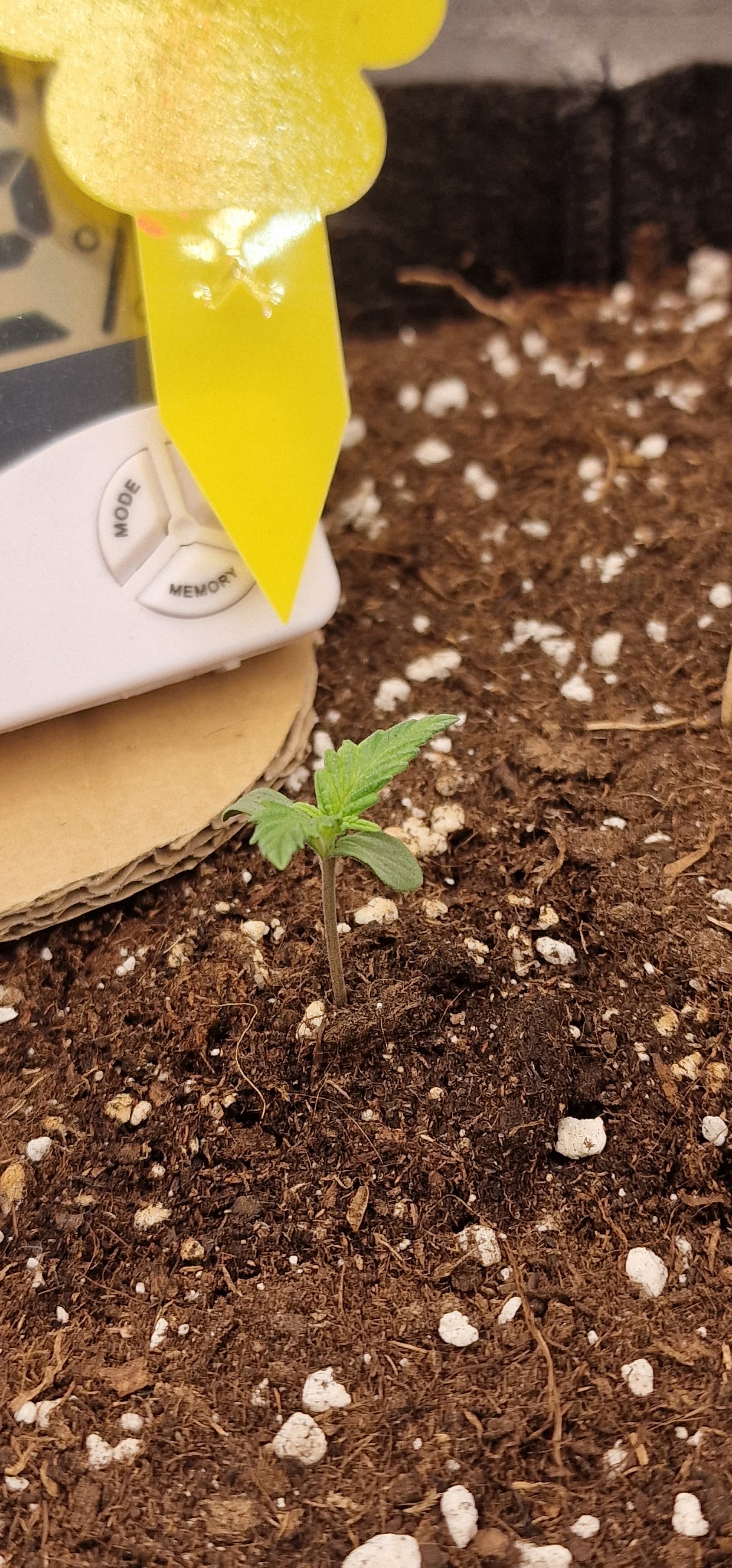 Leider hat sich die Biscotti erneut zum Licht gestreckt, deswegen habe ich die Anordnung im Zelt geändert, damit die Ausleuchtung effizienter ist. Damit es später keine Probleme mit der Feuchtigkeit gibt, habe ich Pappe zwischen die Töpfe gepackt. Ich werde die Pflanzen dann zur Zelttür und zur Hinterwand binden, sodass dieser Platz ebenfalls genutzt wird.