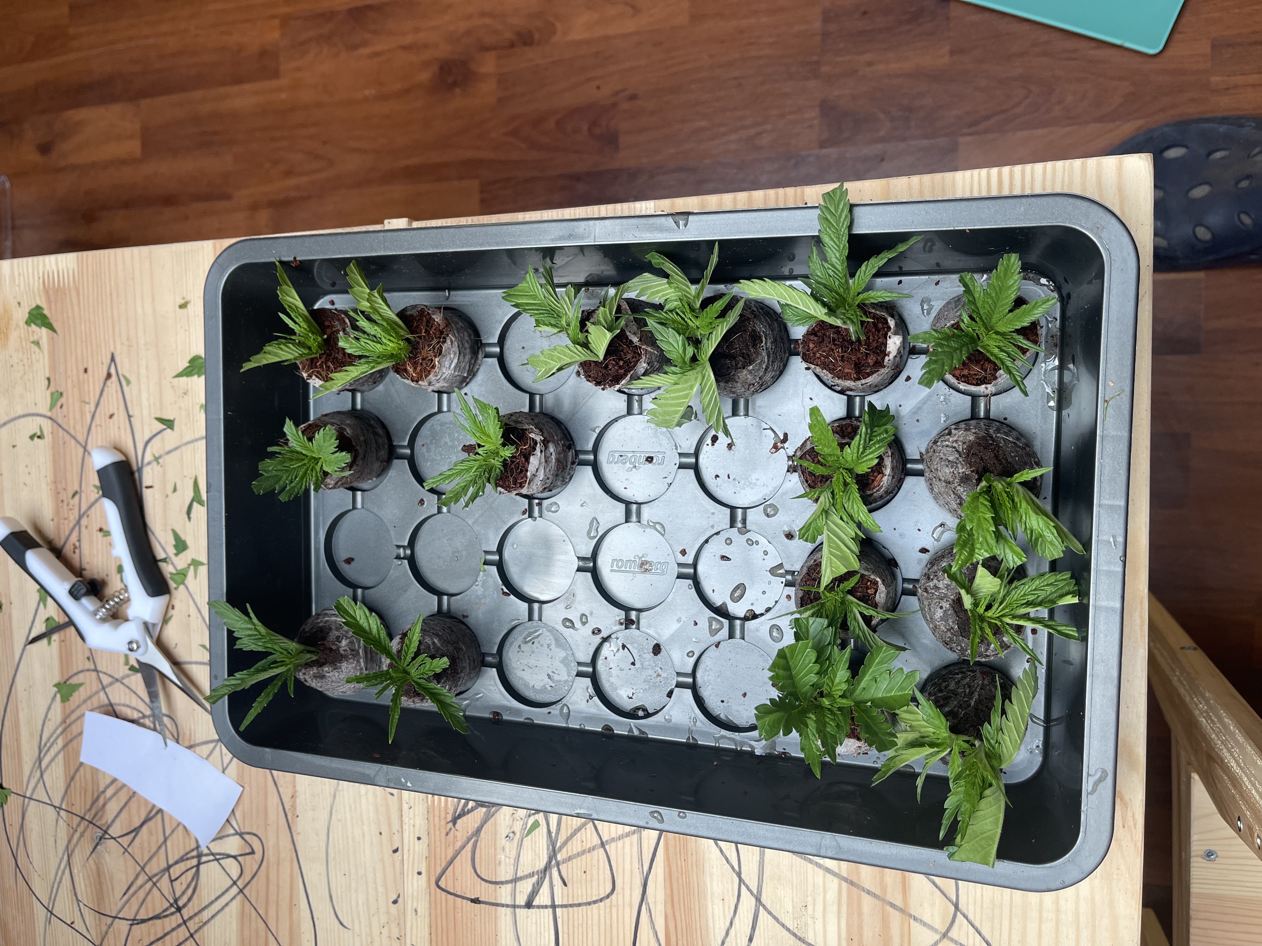 Also nun dann habe ich heute Steckis geschnitten mit 6x Torfquelltöpfe und 10x Kokosquelltöpfe insgesamt 16x 2 pro Pflanze lief auch ganz gut leider sind einige Steckis etwas klein da nichts passendes an den Damen war ebenso bei meiner besten der Tripple G also habe ich bei ihr als einziger weil mir der Stecki sehr wichtig war einen Trieb direkt vom Stamm was man ja eigentlich nicht macht aber wollte safe gehen und einen größeren haben. Meine wichtigen Steckis habe ich in die Torfquelltöpfe gesteckt.