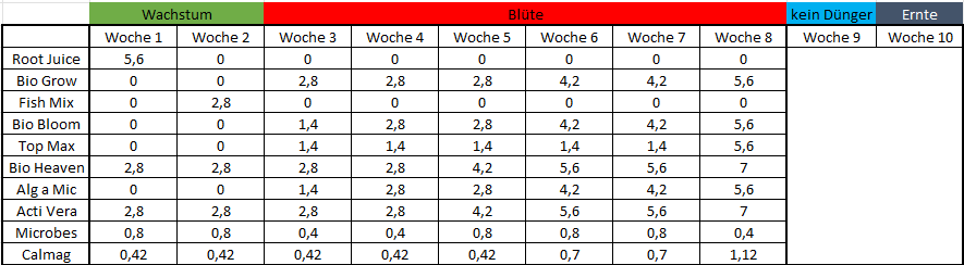Hier die neuen Angaben, gerechnet auf alle 4 Pflanzen, also 2L Wasser: