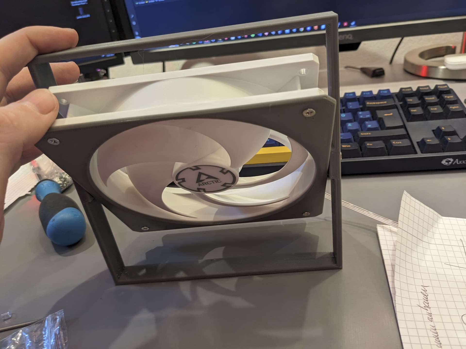 Ansonsten hatte ich noch einige 140er Lüfter und hab dafür schwenkbare halter gedruckt. Idee war hier 4 nebeneinander zu jeder Seite im großen Zelt an konstruktiinsschienen zu montieren. So dass sie nach oben und unten verschiebbar sind. Hatte es mir gut vorgestellt dann auch von unten belüften zu können ohne jedes mal den Venti umzubauen. Hab jetzt aber auch schon zwei weitere schwenk Ventis da. Mal sehen ob das überhaupt nötig wird.
