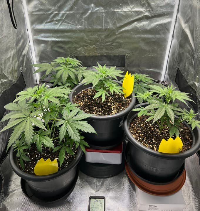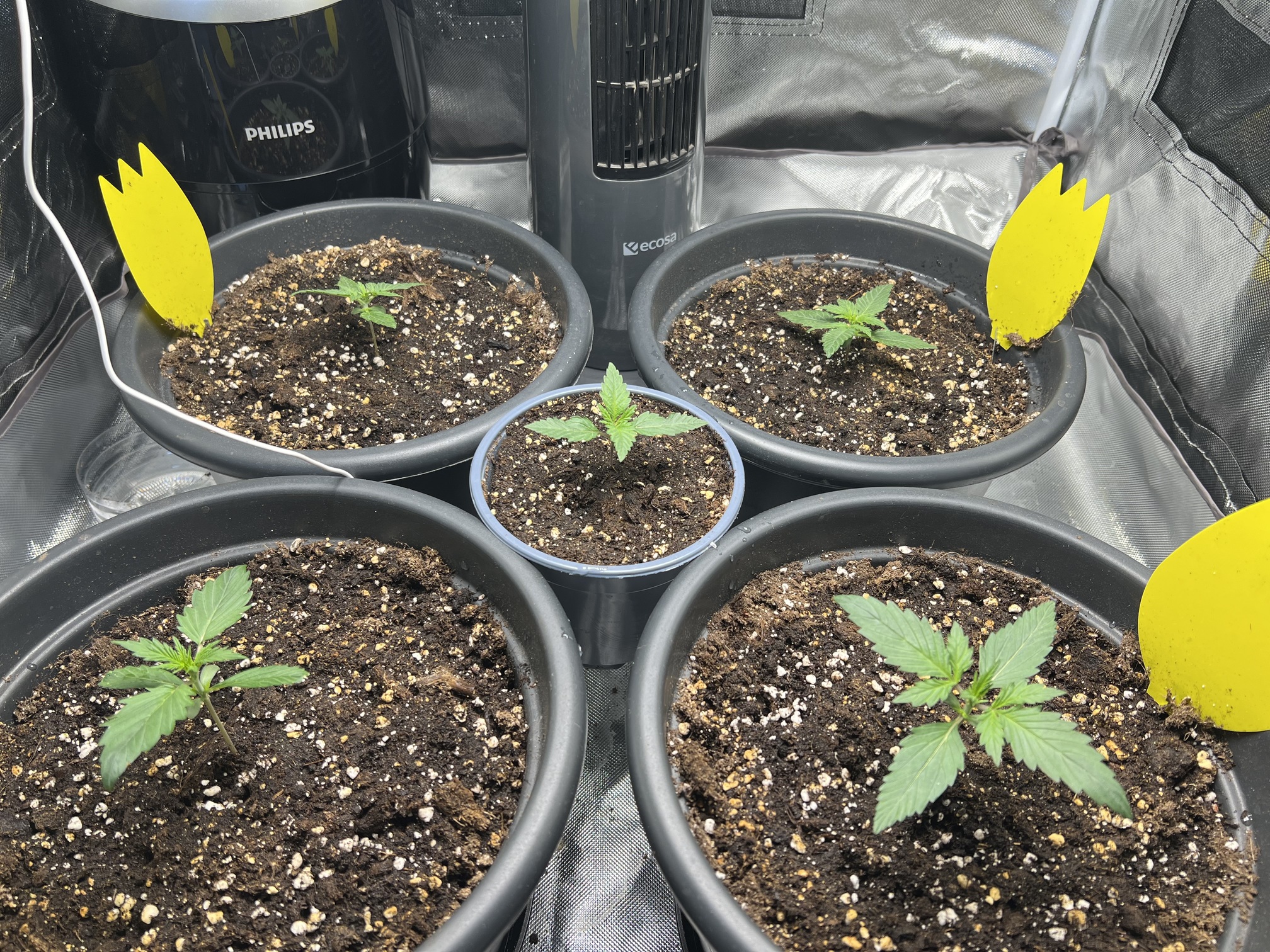 Die vorderen beiden Pflanzen weisen Blattverfärbungen auf, das lag an meiner Tollpatschigkeit beim gießen. Hab schön das Wasser mit Dünger über die beiden Ladys gegossen. War wohl nicht so geil…