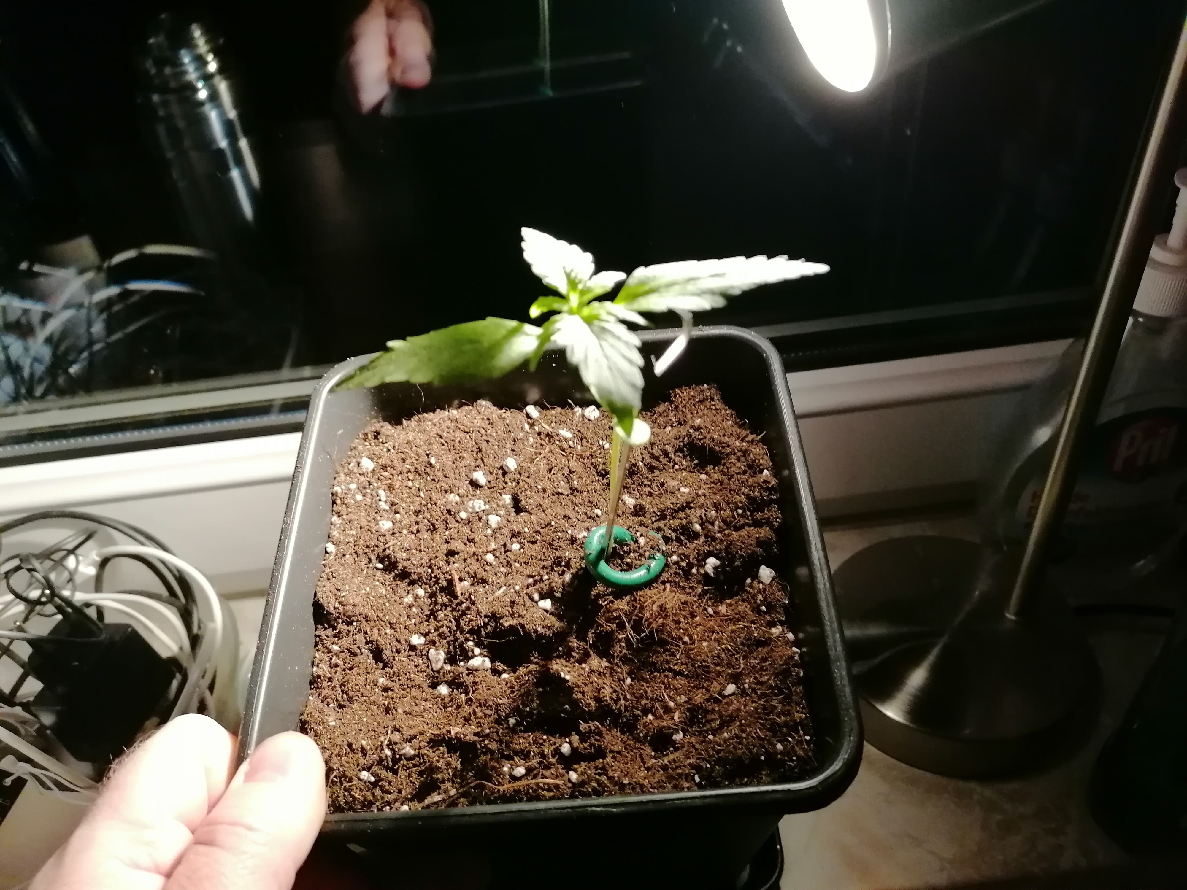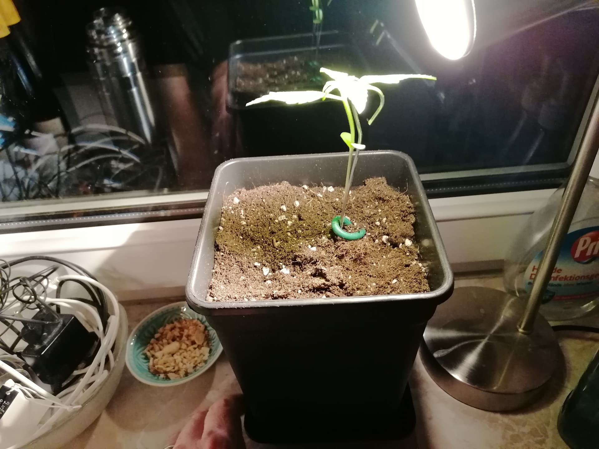Spassprojekt meiner Frau - der 3.gekeimte Samen ist in einem 3,5 ltr Topf auf der Fensterbank gelandet
