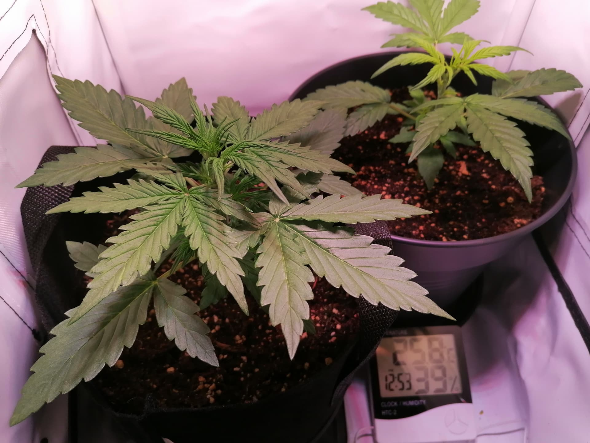 6,5 ltr Plastiktopf und 8 ltr Stoff Topf, ich kenne die 1/3 Giessregel, habe aber letzten Sonntag (also Tag 11) Angst gehabt zuviel zu geben (vorher als Sämling nur besprüht) Mittwoch habe ich dann noch den Rest nachgegeben und heute zeigt das Gewicht auf der Waage fast genau so viel /wenig an, wie vor der ersten richtigen Wassergabe am Sonntag. Die haben also alles verbraucht. 1/3 Regel muss ich das Ausgangsvolumen, vor allem bei der 8 ltr Stoff, sicher niedriger ansetzen, weil die Erde nicht bis oben gefüllt ist.