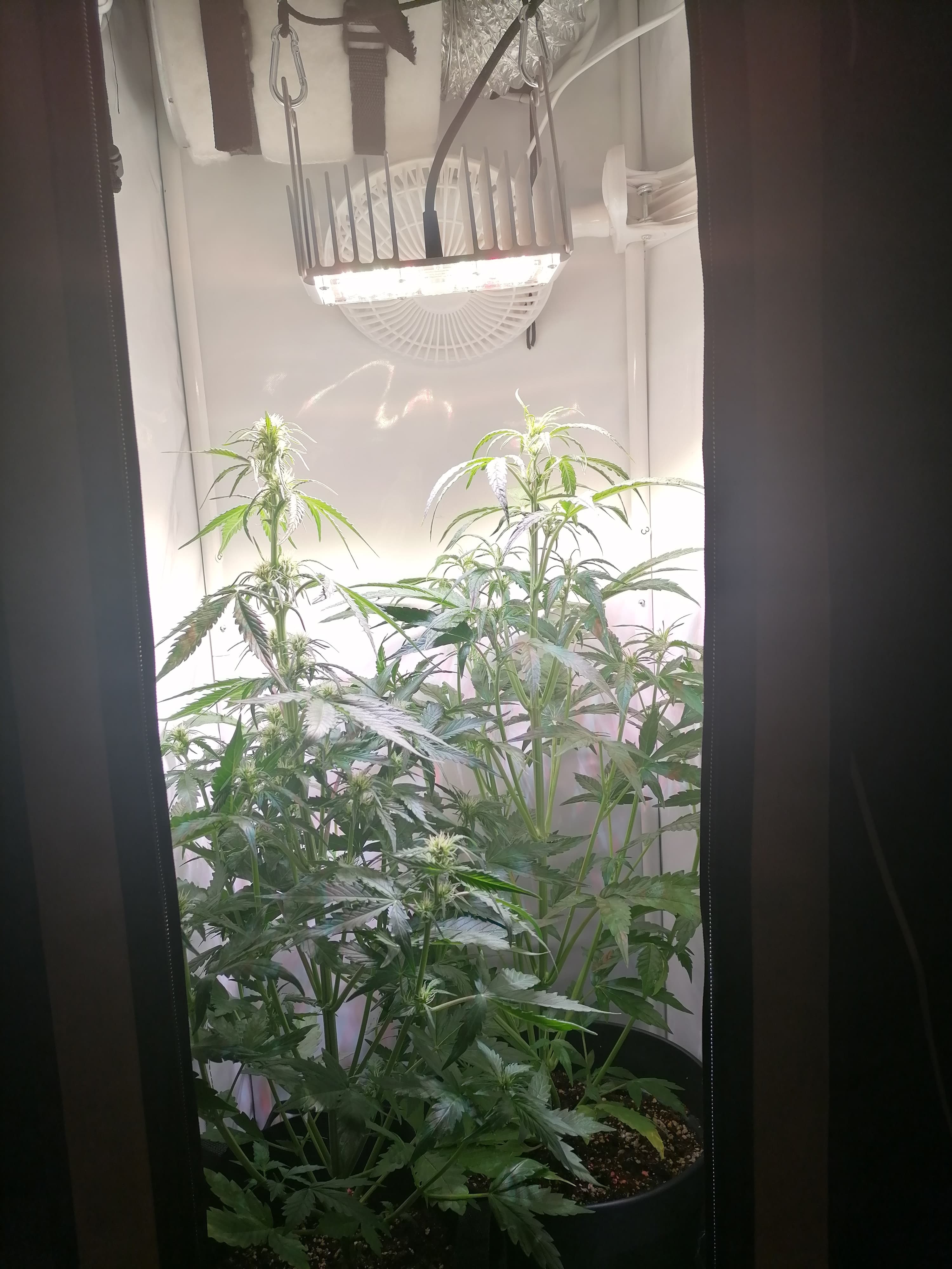 Ich konnte die LED jetzt noch 10 cmtr höher anbringen und Morgen nach dem giessen werde ich den Hauptstamm jeder Pflanze an dem Zelt Gestänge leicht anbinden, damit in den unteren Bereich mehr Licht kommt und die Höhe zur LED einigermaßen stimmt.