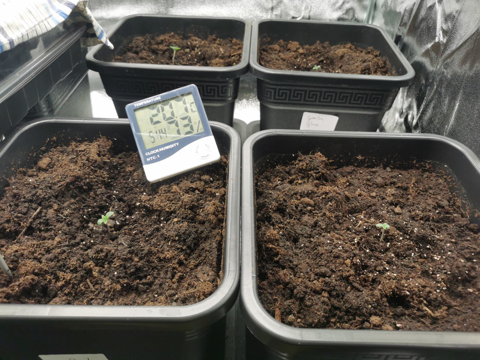 ZurErinnerung das Zelt steht im eher kühlen Keller. Wenn ich nachts die Lampe ausmache würde das Thermometer Richtung 14° heruntergehen. Auch die Heizung wird hier nachts im Haus etwas heruntergefahren. Somit muss ich gegen die Uhr arbeiten. Nachts darf die Lampe das Klima im Zelt regulieren und tagsüber je nach Außentemperatur die Umgebungsluft oder diese unterstützt mit einem Heizkörper.