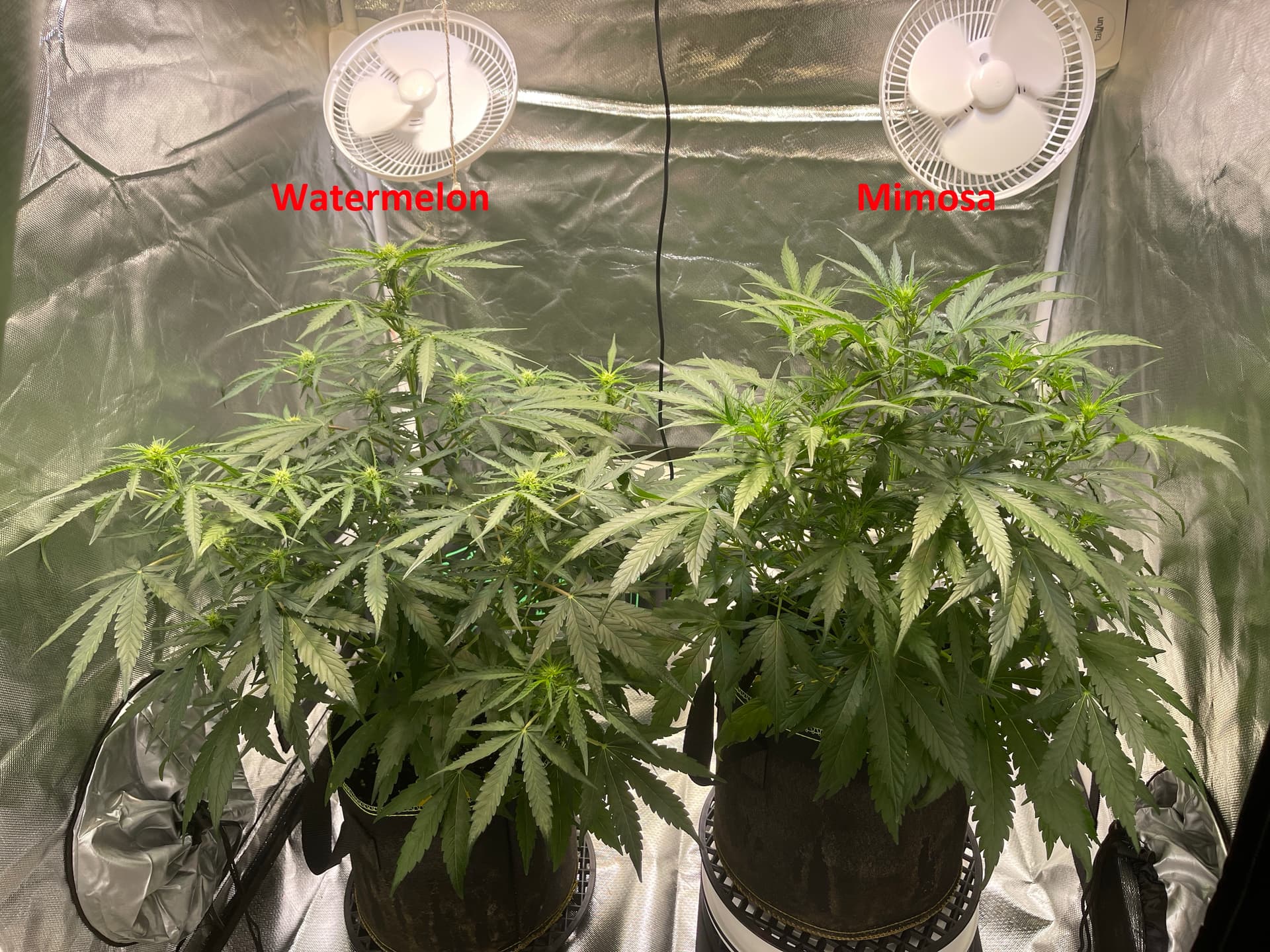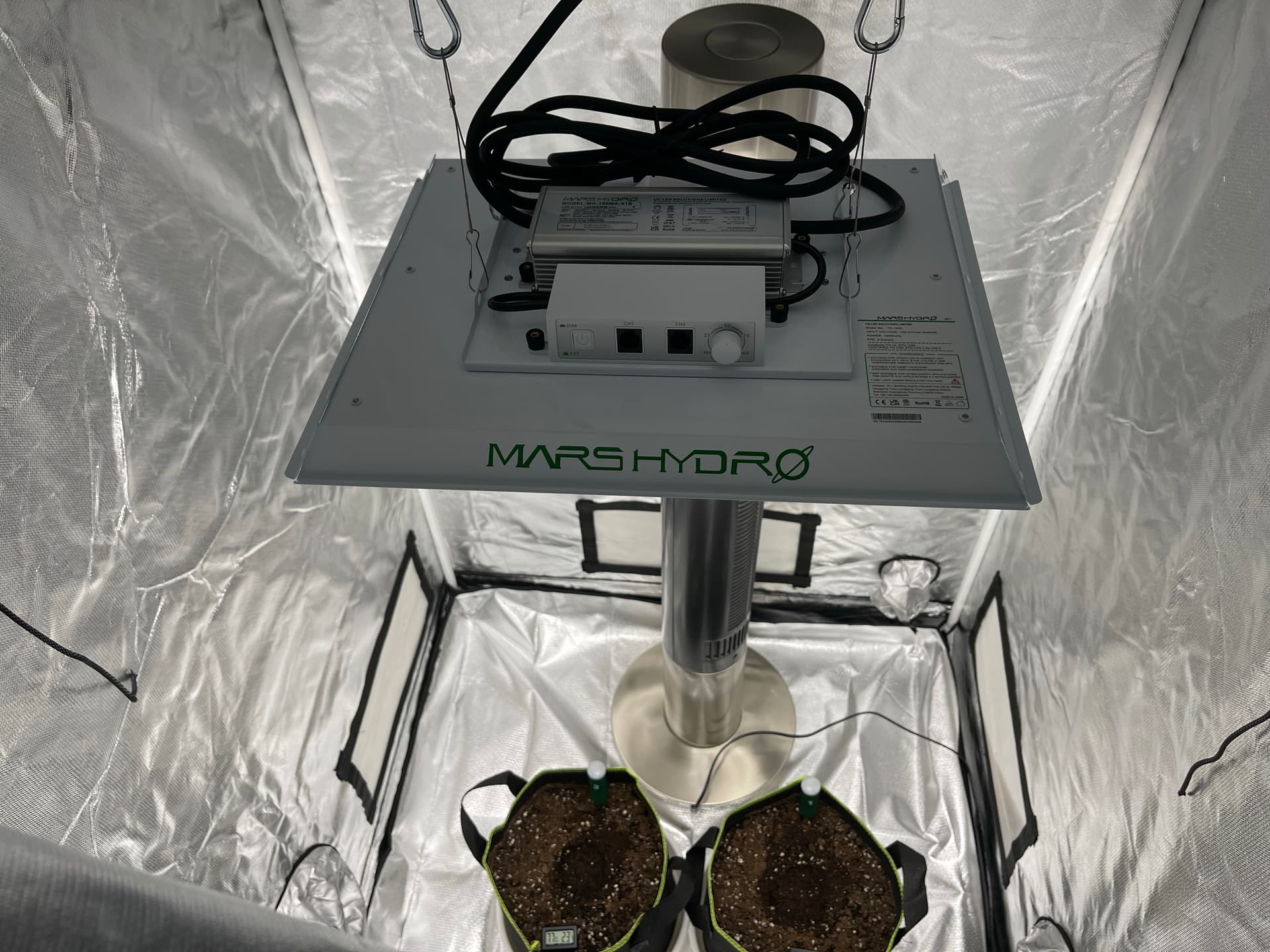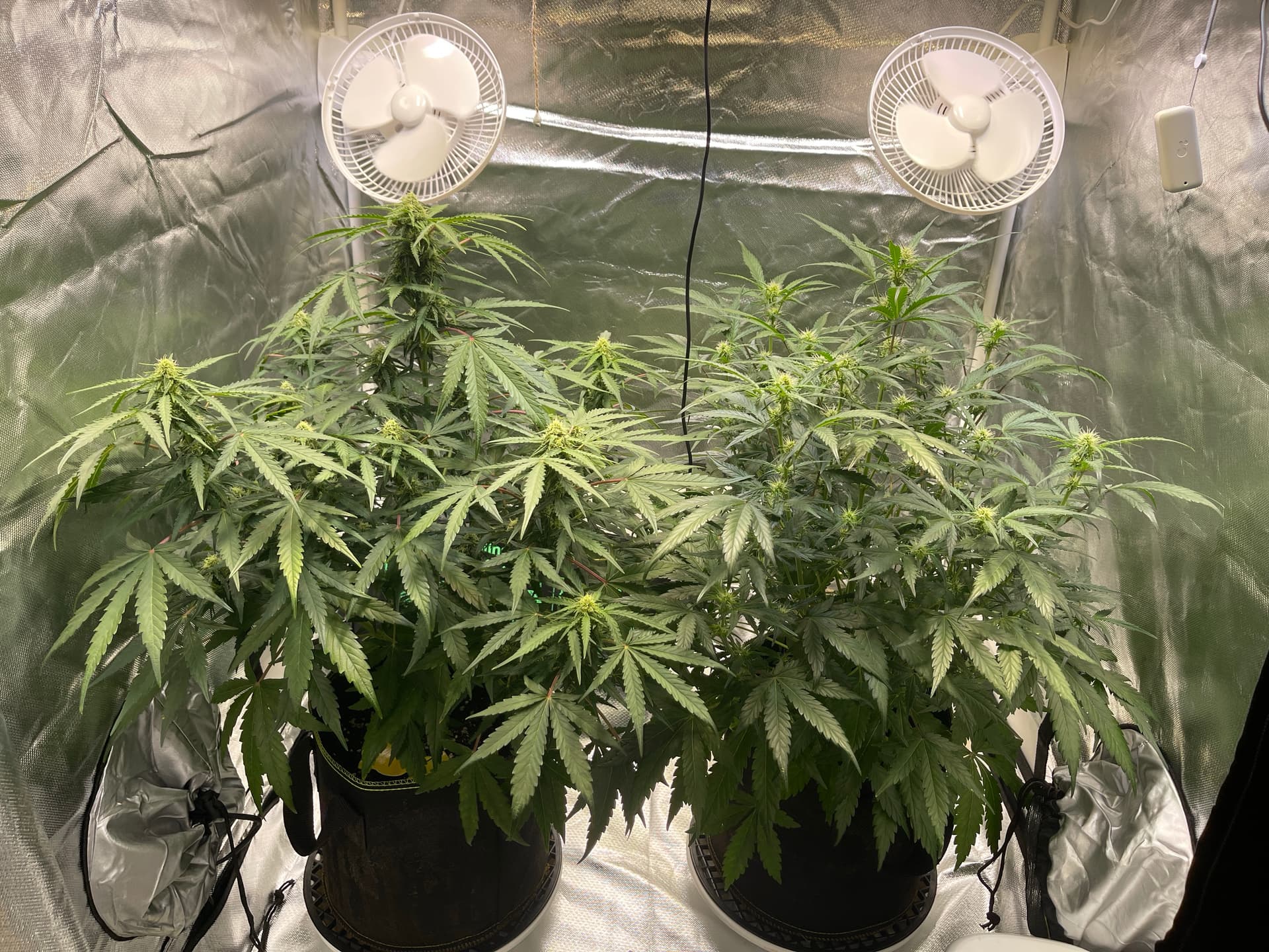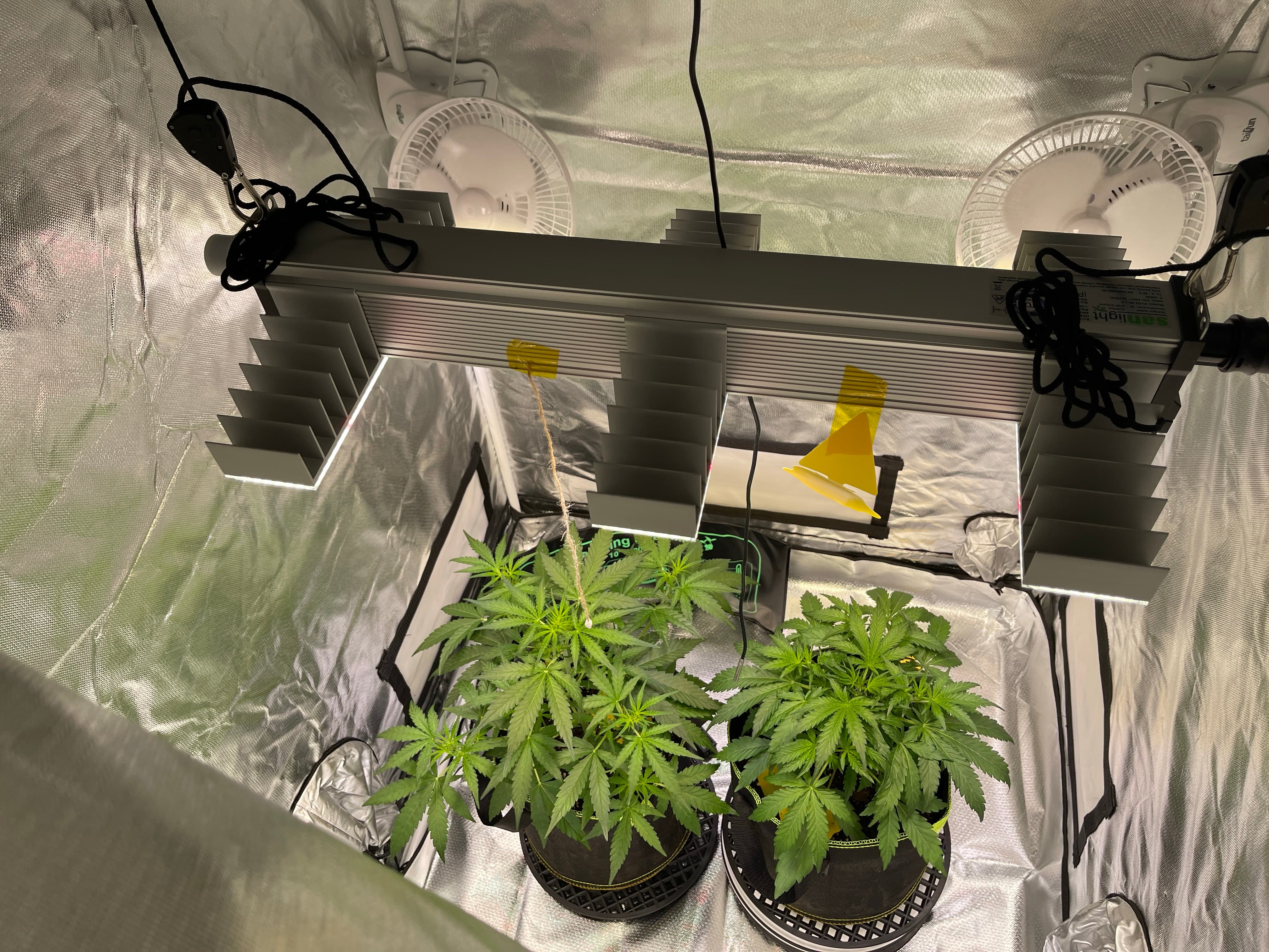 Belüftung: AC Infinity Cloudline T4 Pro (348m³/h) auf Stufe 4-6, AC Infinity Aktivkohlefilter 100mm (357m³/h), Umluft: 2x Taifun Hurrican (á 15W, Oszillierend)