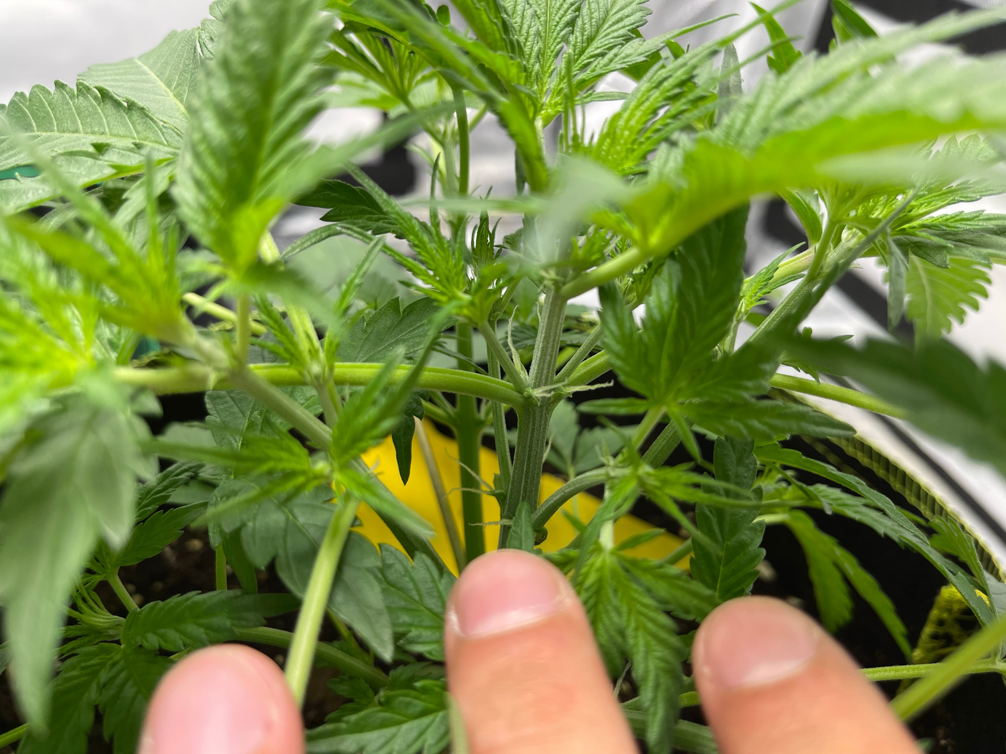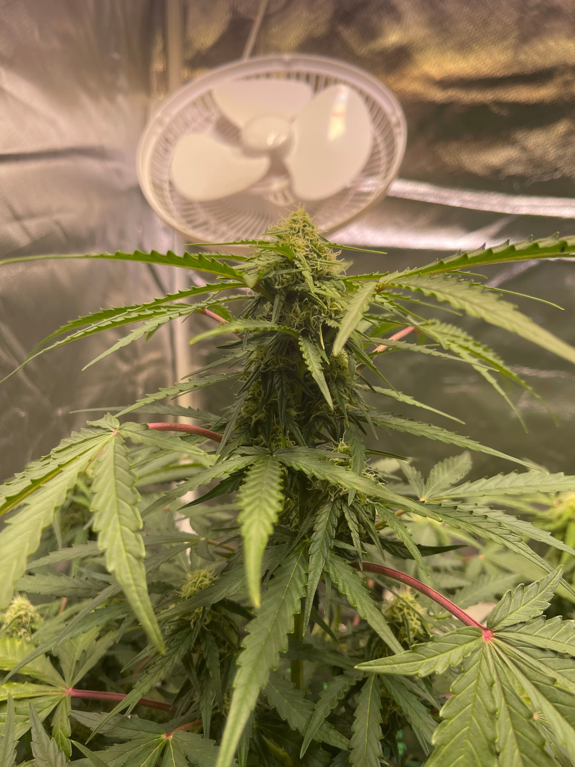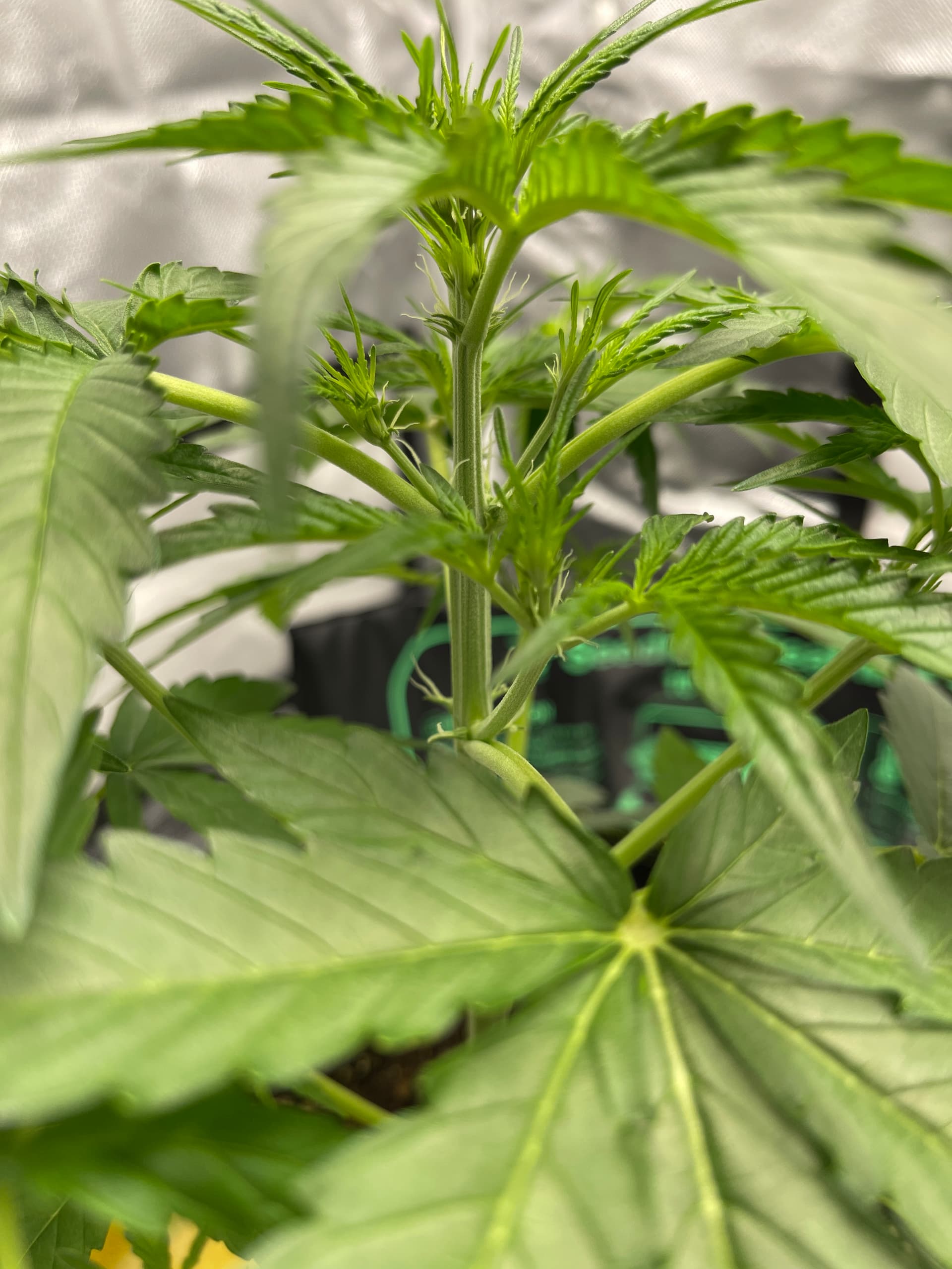 Ich habe ein paar größere Fächerblätter entfernt um mehr Licht an die unteren Triebe zu lassen und um den Airflow zu verbessern. Viele Blütenstempel sind jetzt zu sehen.