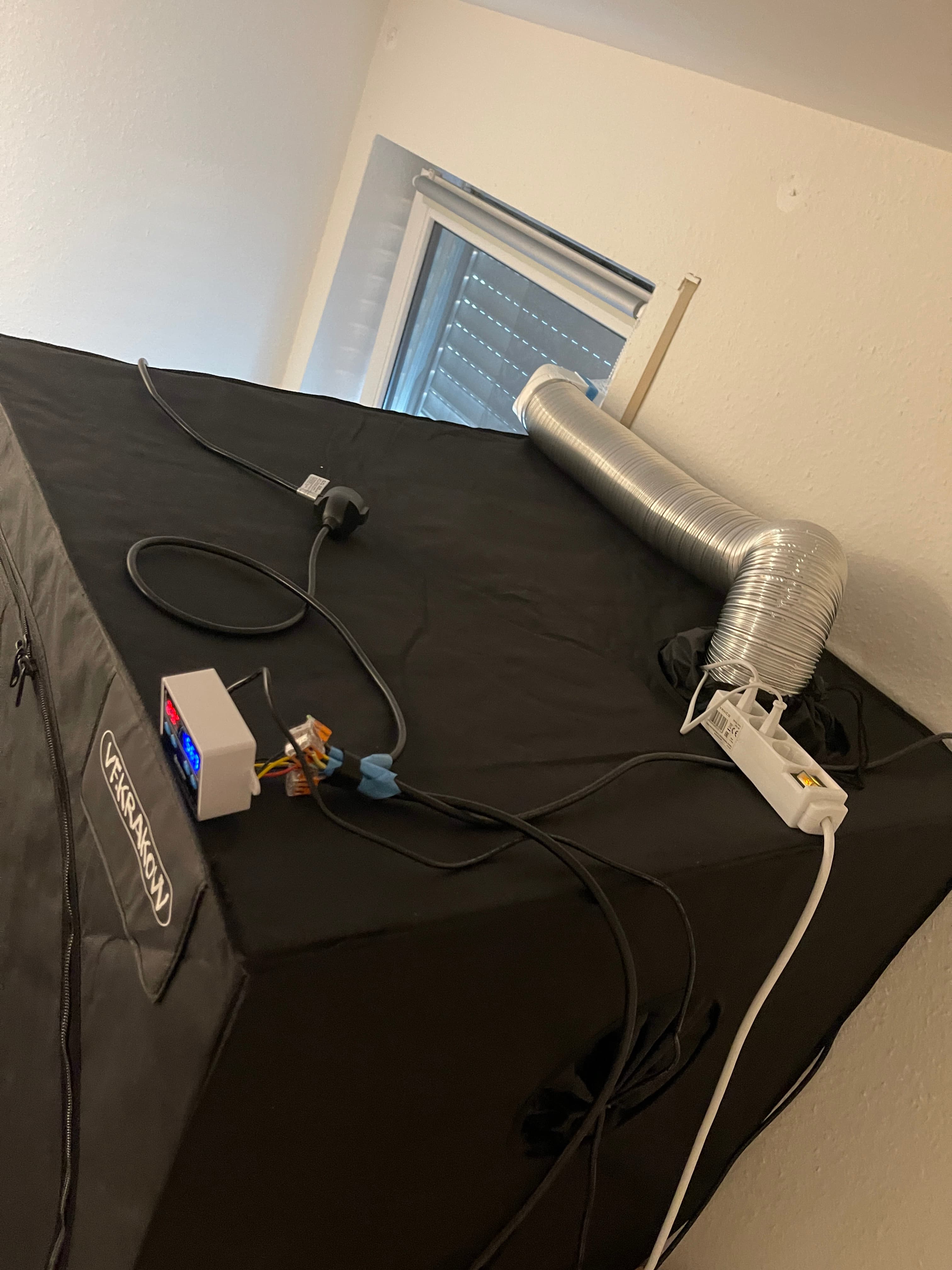 Temperatur und RLF-Regelung: Da ich meine Growbox wenigstens etwas „automatisieren“ wollte, mir aber ein GrowControl zu teuer war, habe ich mir einen Temperatur- und Luftfeuchtigkeitsregler auf Amazon besorgt, da an die Outputs für Temp+/- und RLF+/- je eine Verlängerungsdose mit Wago Klemmen dran gemacht und kann nun beliebig Verbraucher anschließen (leider jeweils nur entweder Temp. + oder - und RLF + oder -). Aktuell hängt an Temp. eine Heizmatte und an RLF ein Luftbefeuchter. Später in der Blüte, hänge ich an RLF dann einen Luftentfeuchter.