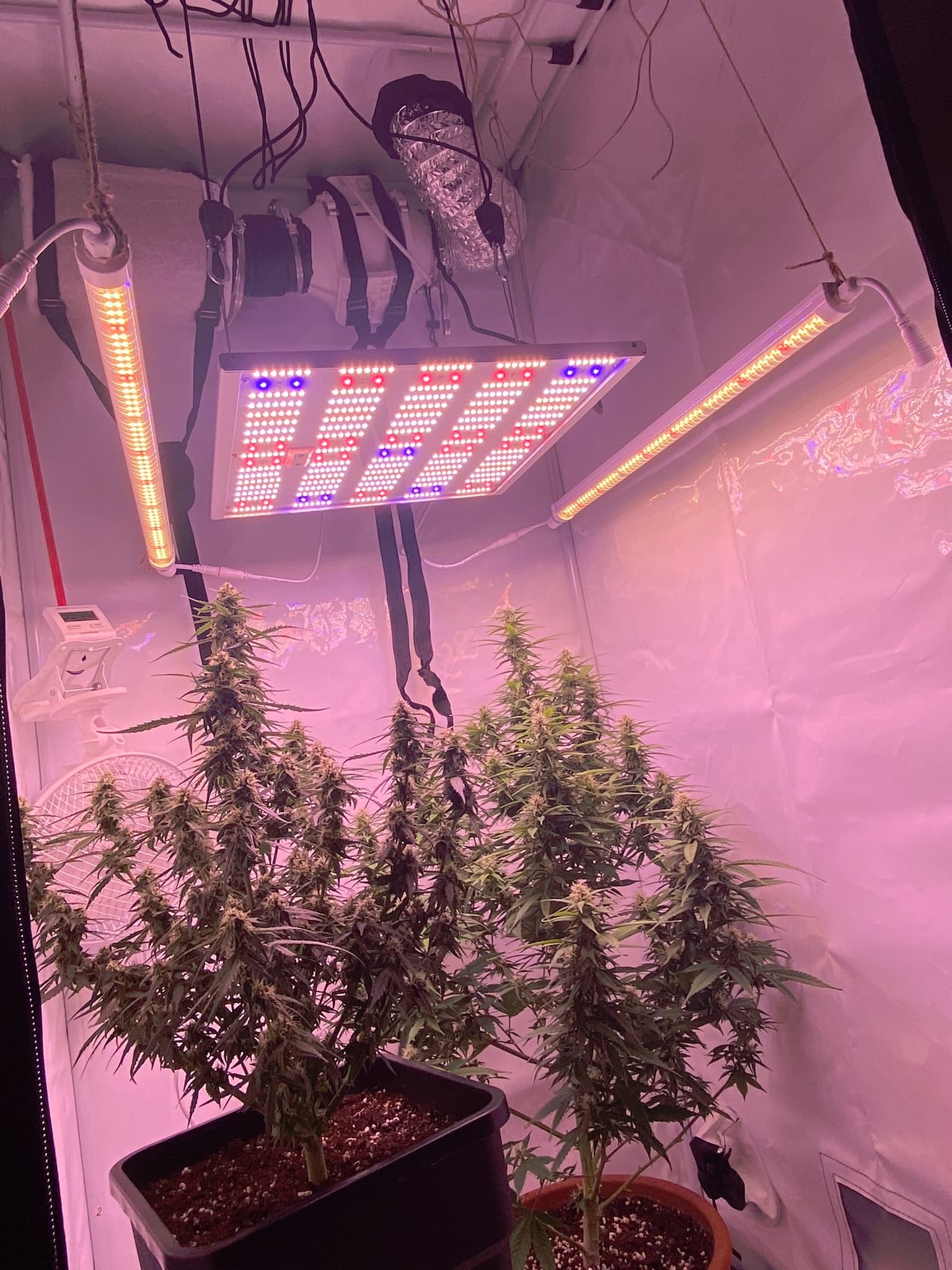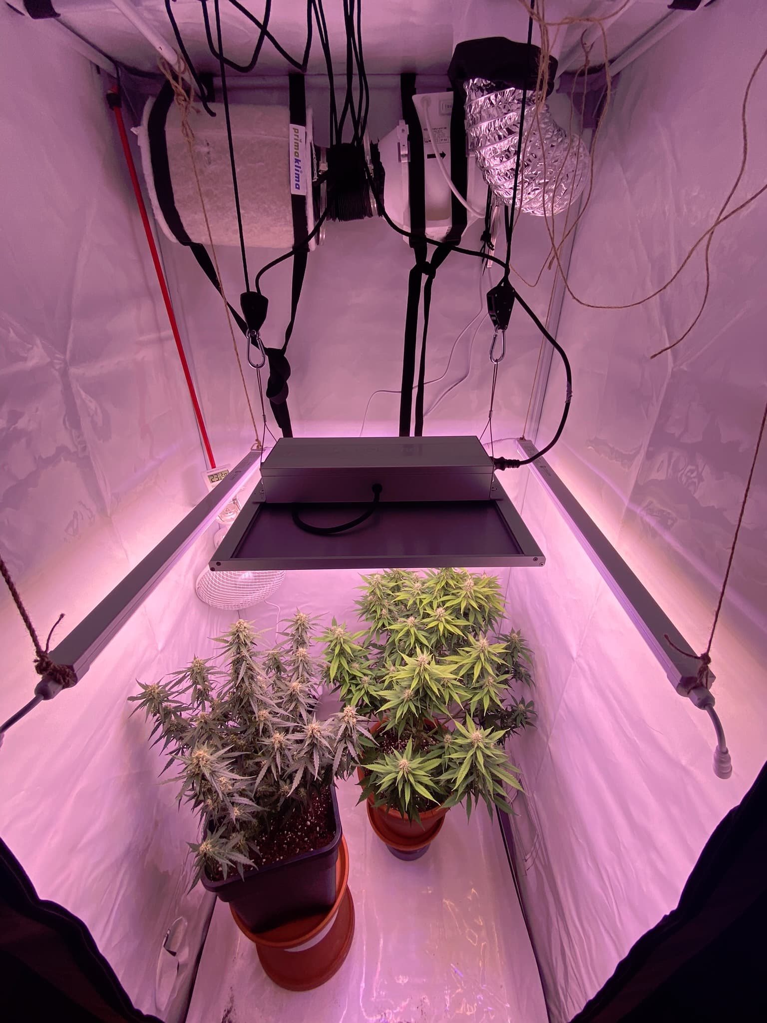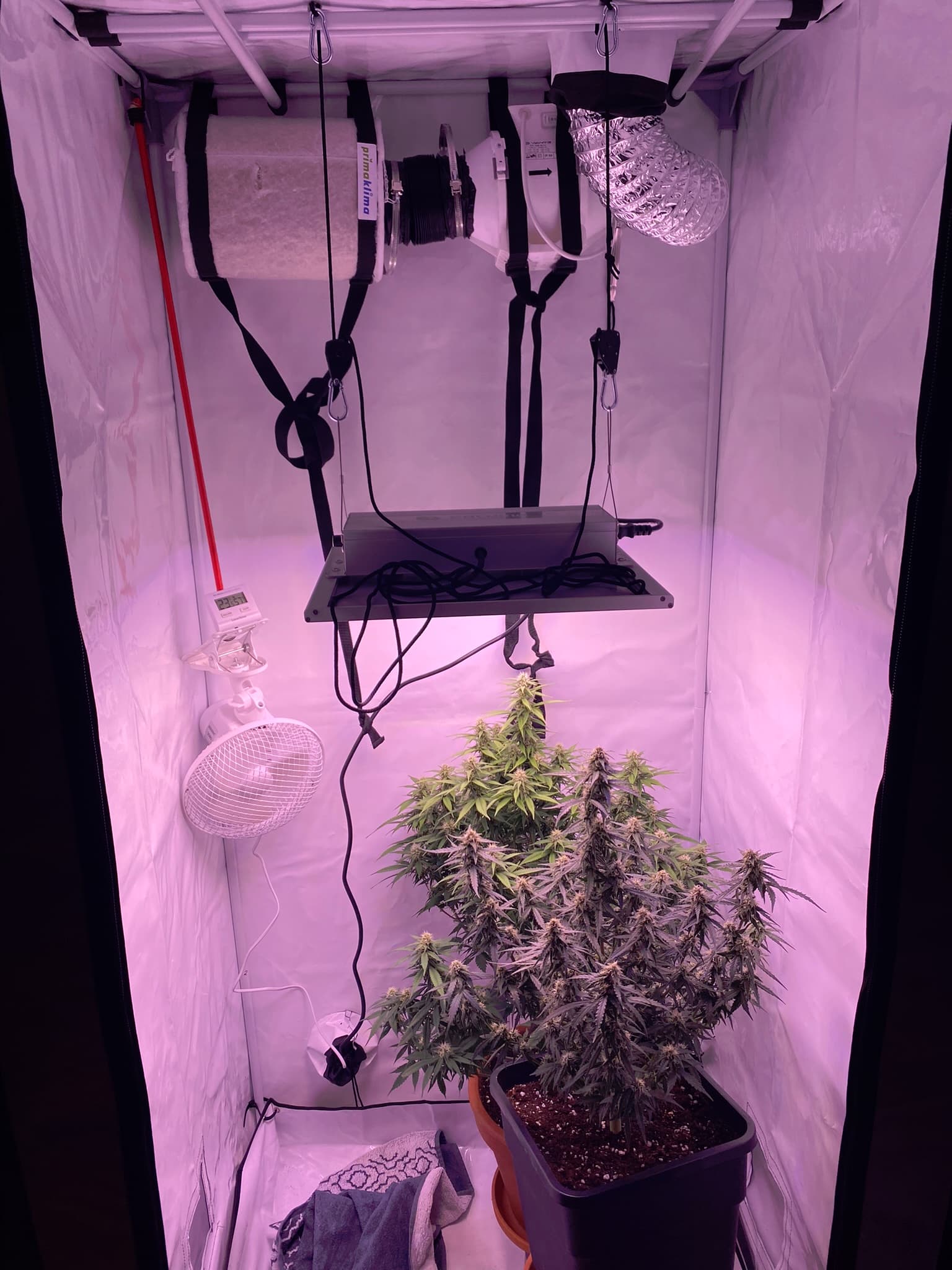 Jetzt wo ich den GrowRaum beheize und gleichzeitig die Abluft nach außen ableiten kann, habe ich im Growroom so 50% RLF gemessen, ohne dass die Heizung durchgehend läuft! Wir haben es Eisig draußen deshalb kann ich sicher sagen, dass alles isoliert ist. Auch ist es toll nicht mehr frieren zu müssen