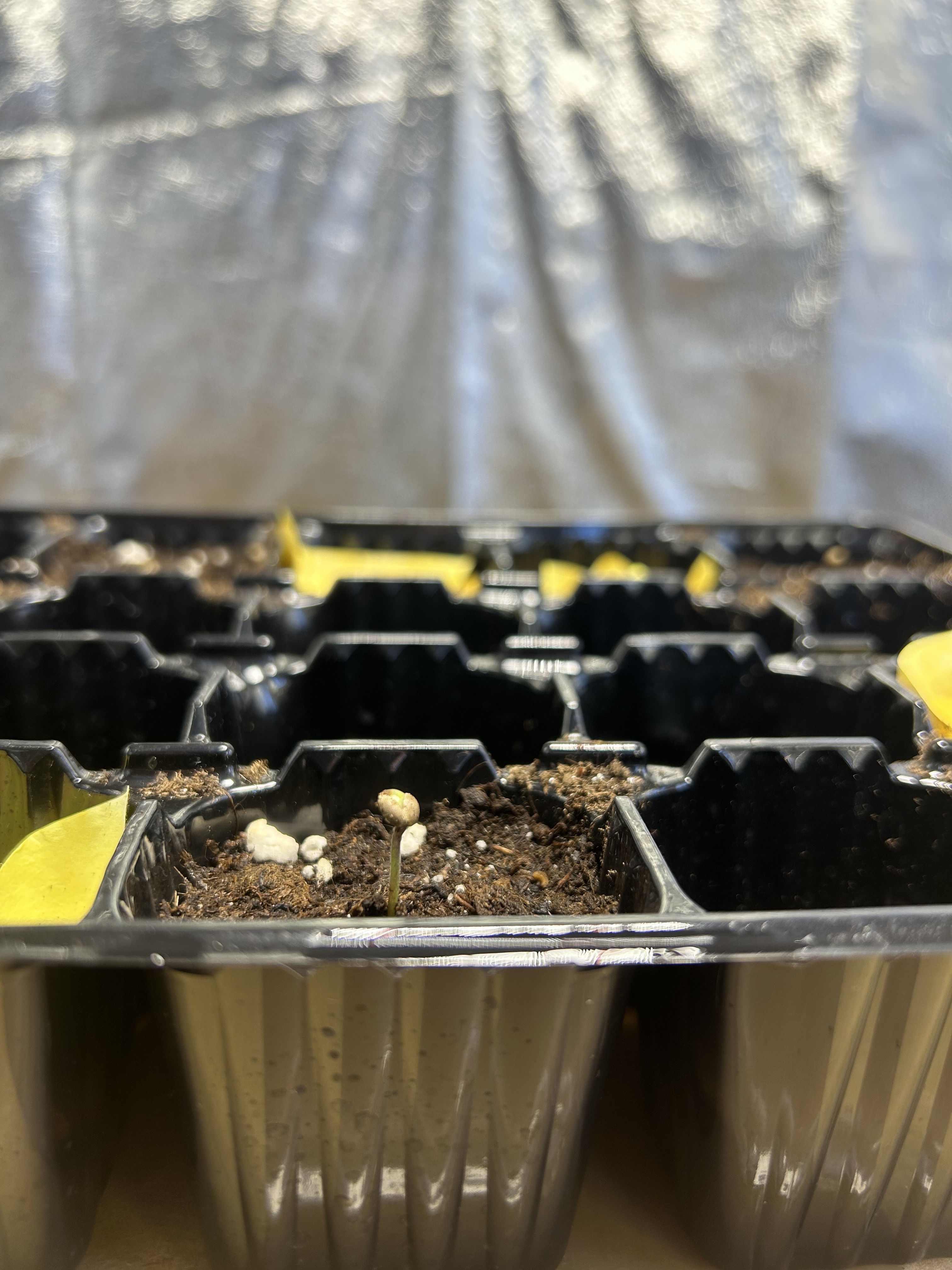 Tag 3: Samen mit Wurzel nach unten in BioBizz All-Mix in kleines Anzuchtset mit Plastikhaube („Mini-Gewächshaus“) und im Zimmer stehen lassen, ohne Lampe, ohne nix, mit Sprühflasche Erde oben etwas angefeuchtet