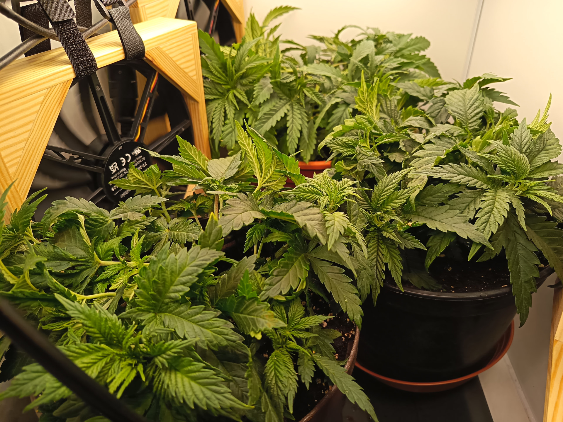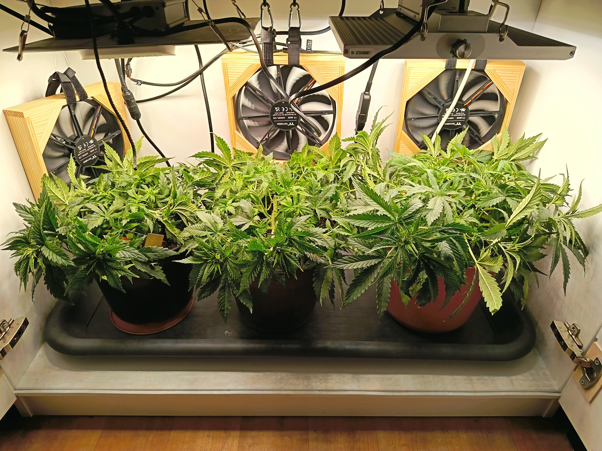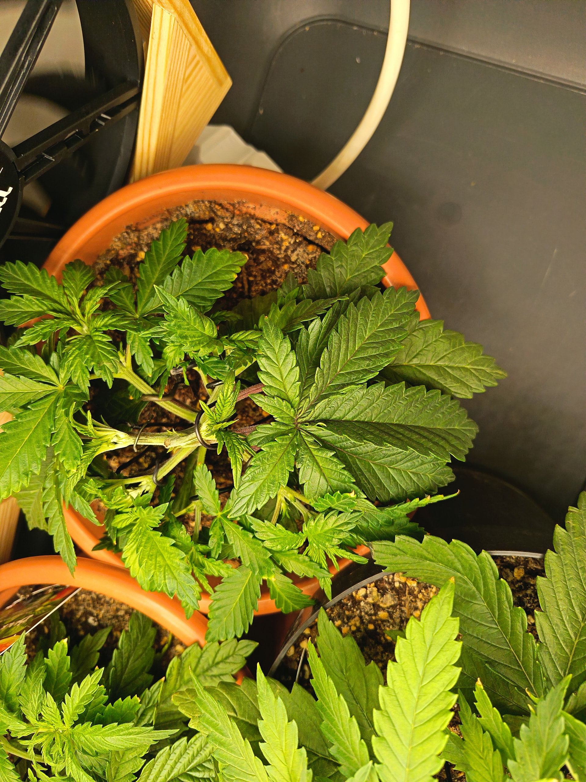 Luftfeuchtigkeit liegt permanent zwischen 60 und 65%, Temperatur zwischen 23 und 25 Grad. Ich würde also sagen, nahezu optimal. Der Wuchs gefällt mir bisher auch. Schön kompakt (fast schon zu kompakt), mit sattem grün. Nur bisschen langsam sind zwei der drei Pflanzen. Ich frag mich nun, ob ich vor oder nach der Umstellung auf 12/12 (geplant für nächstes Wochenende) umtopfen sollte? Unten schauen schon einige Wurzeln aus den Löchern.