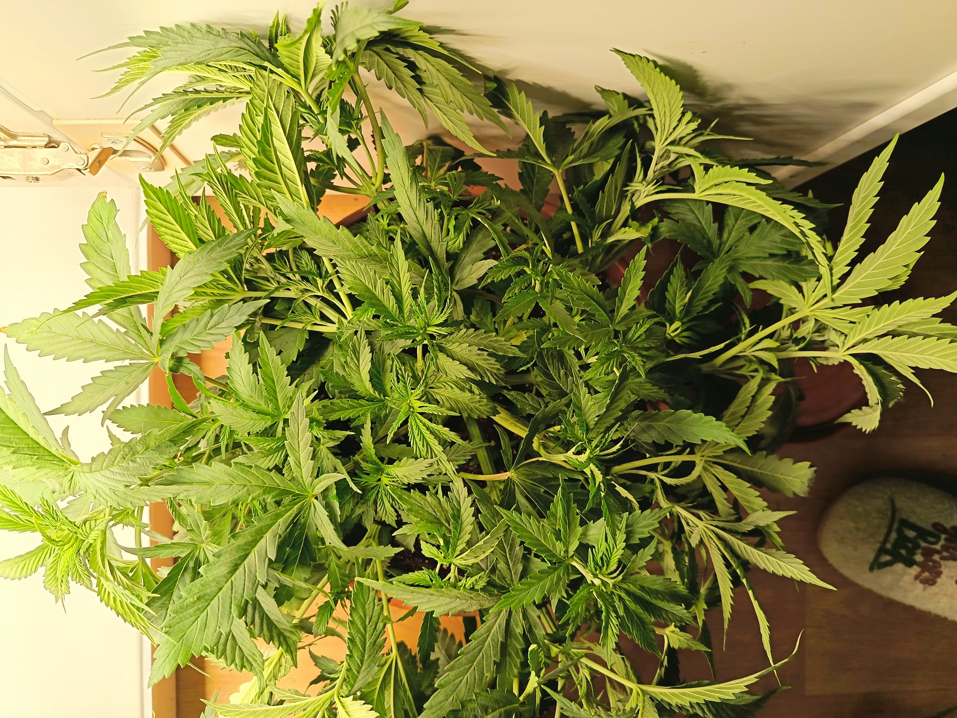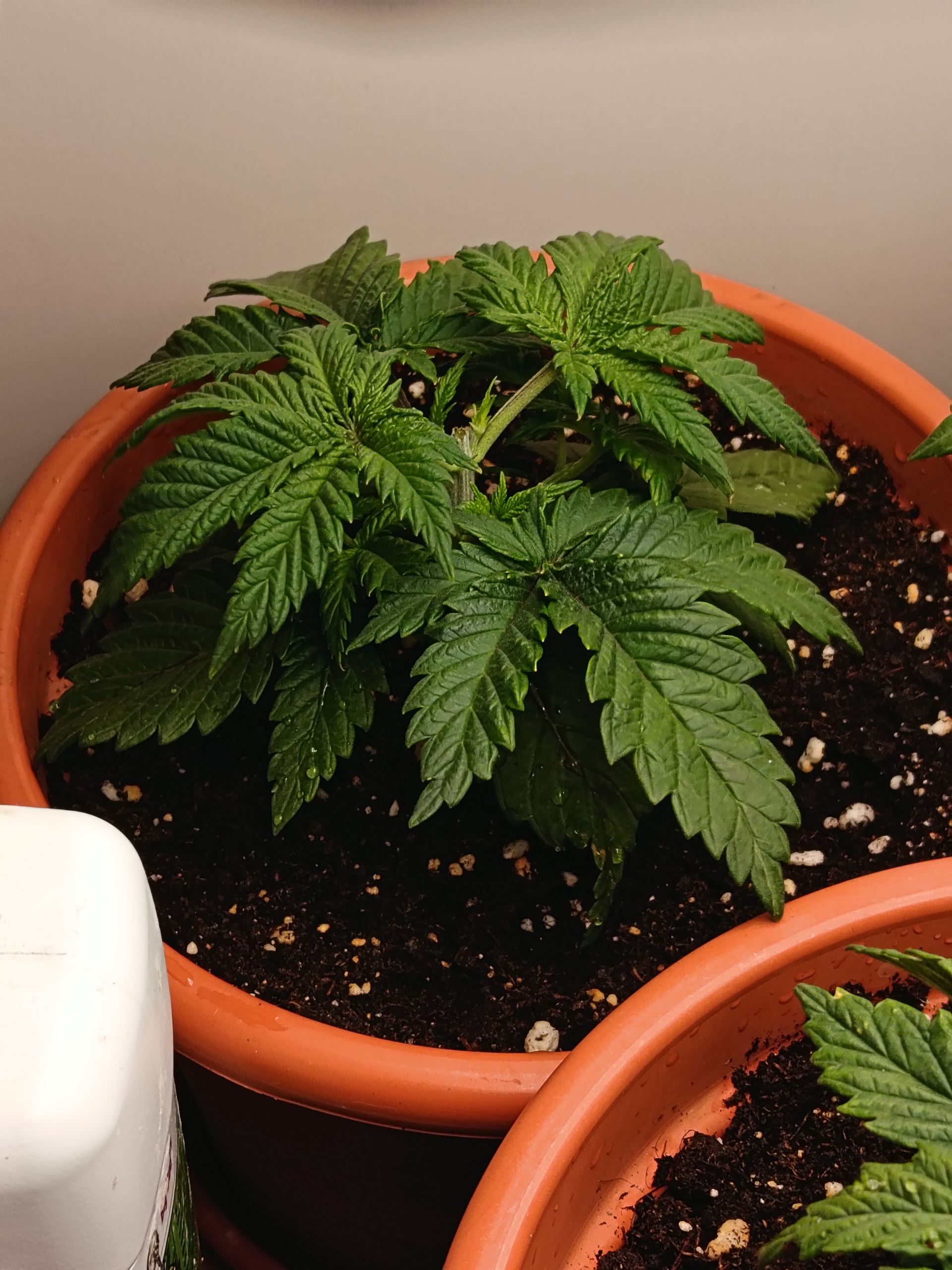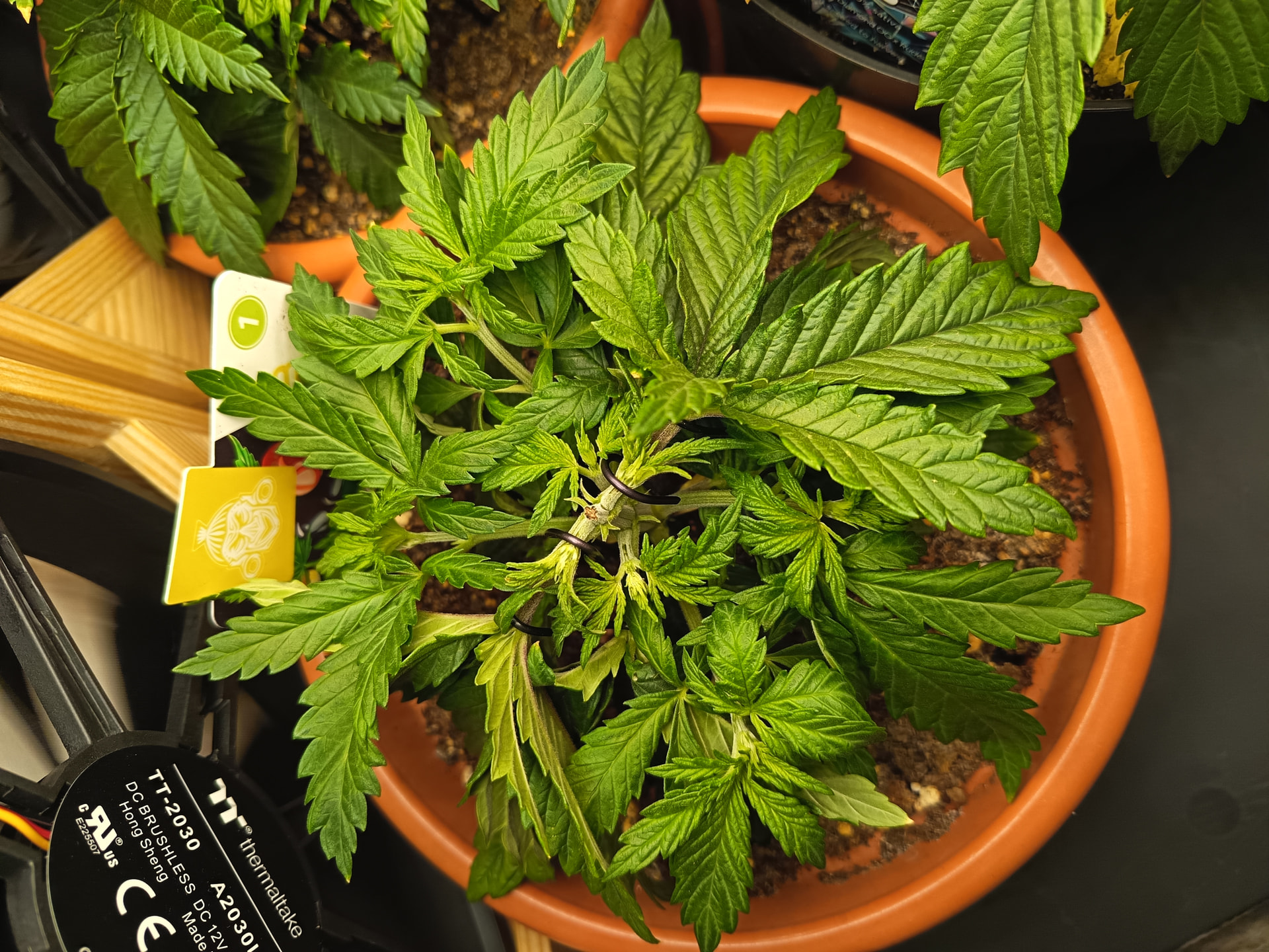 Luftfeuchtigkeit liegt permanent zwischen 60 und 65%, Temperatur zwischen 23 und 25 Grad. Ich würde also sagen, nahezu optimal. Der Wuchs gefällt mir bisher auch. Schön kompakt (fast schon zu kompakt), mit sattem grün. Nur bisschen langsam sind zwei der drei Pflanzen. Ich frag mich nun, ob ich vor oder nach der Umstellung auf 12/12 (geplant für nächstes Wochenende) umtopfen sollte? Unten schauen schon einige Wurzeln aus den Löchern.