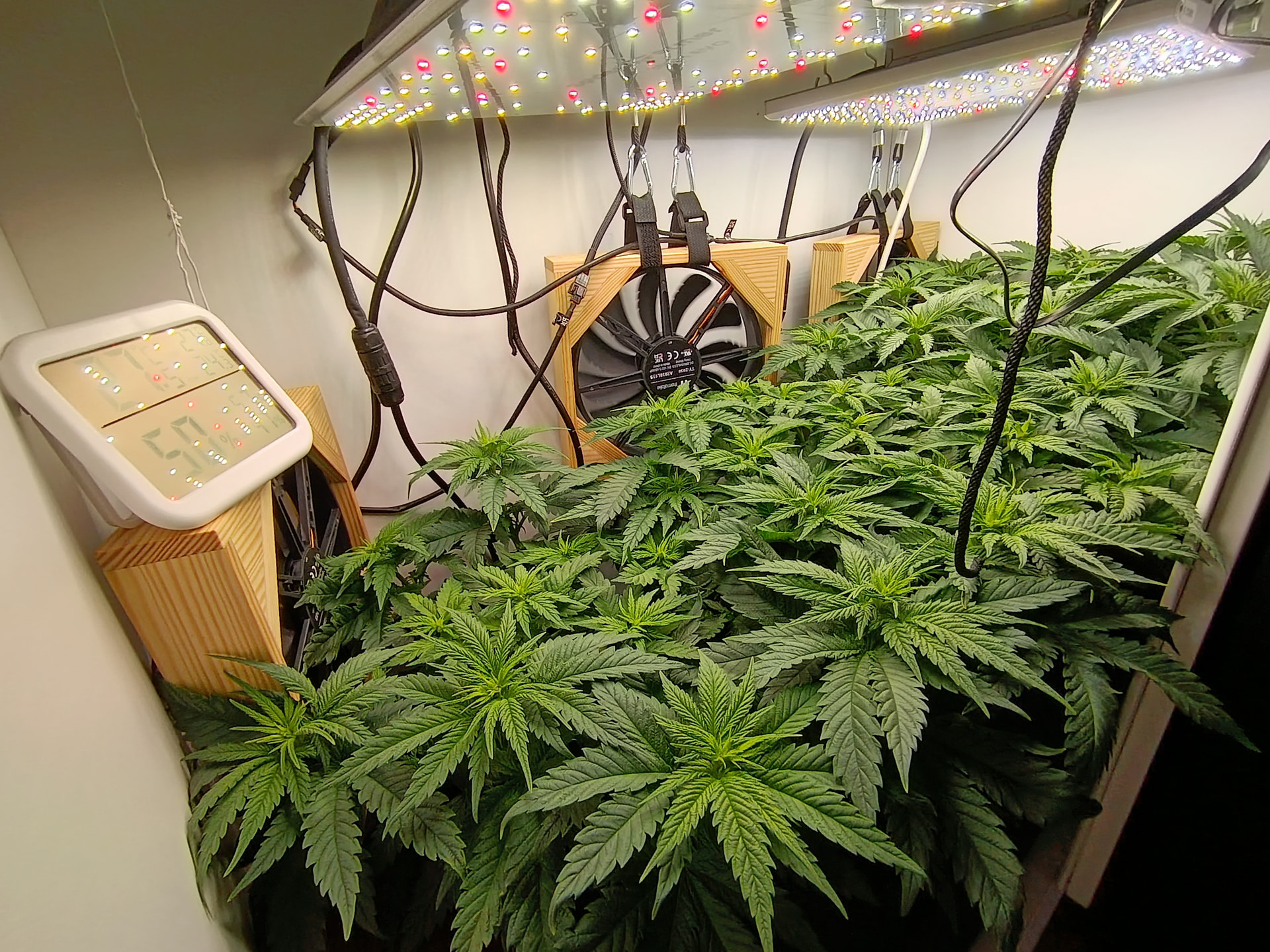 Das kommt darauf an, wo du misst. Wenn du nah an den Pflanzen misst, können 70 % schon vorkommen. Würde mir da vor allem in der vegetativen Phase keine Sorgen machen. Bevor du in die Blüte gehst, kannst du einmal Entlauben, dann wirst du sehen, dass es deutlich runter geht.