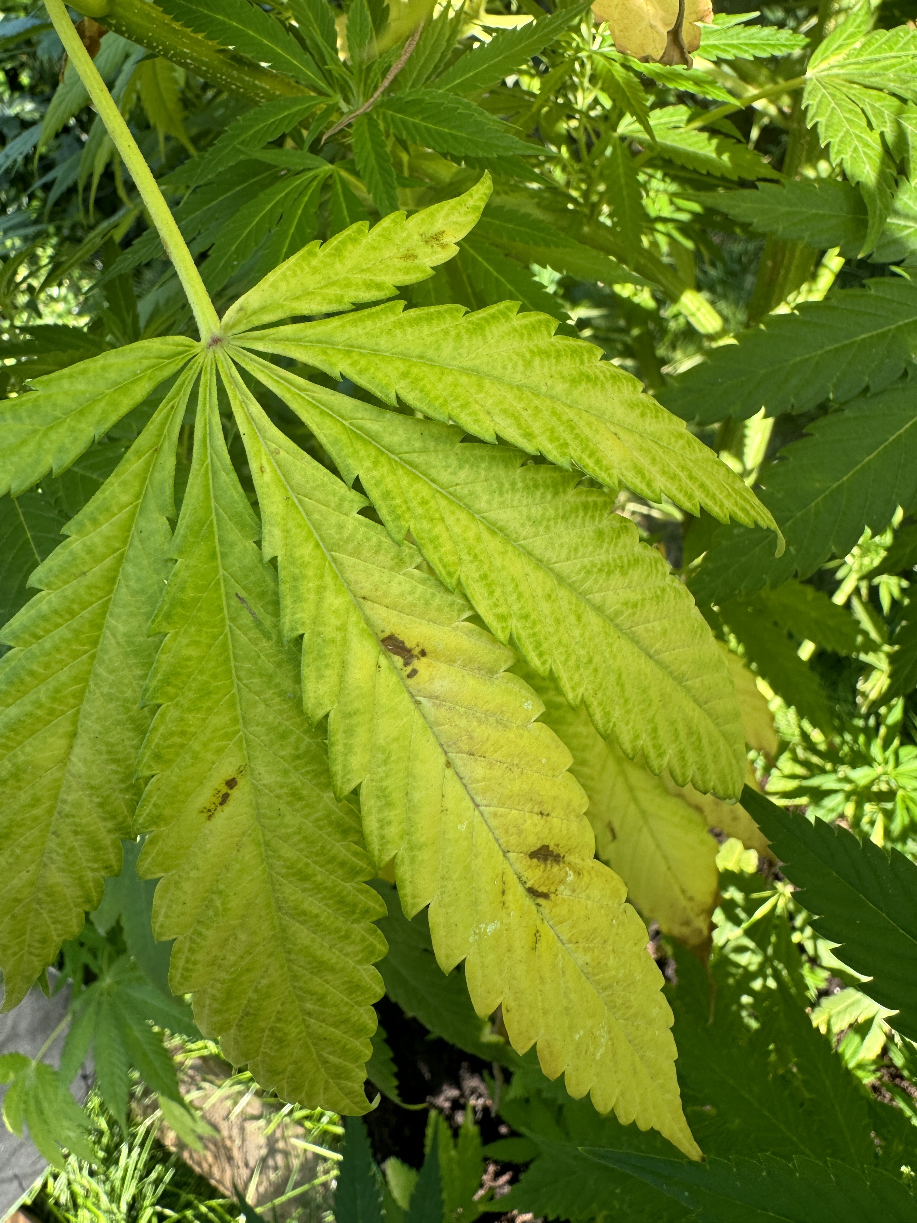 Ehrlicherweise: Das ist völlig normal, dass Blätter draußen mal so aussehen. Mach dir nicht ins Tütü, weder hast du überdüngt, noch haben die akut ein Nährstoffproblem. Lass sie einfach weiter in Ruhe in der Sonne stehen, und bestaune die Wunder der Natur.