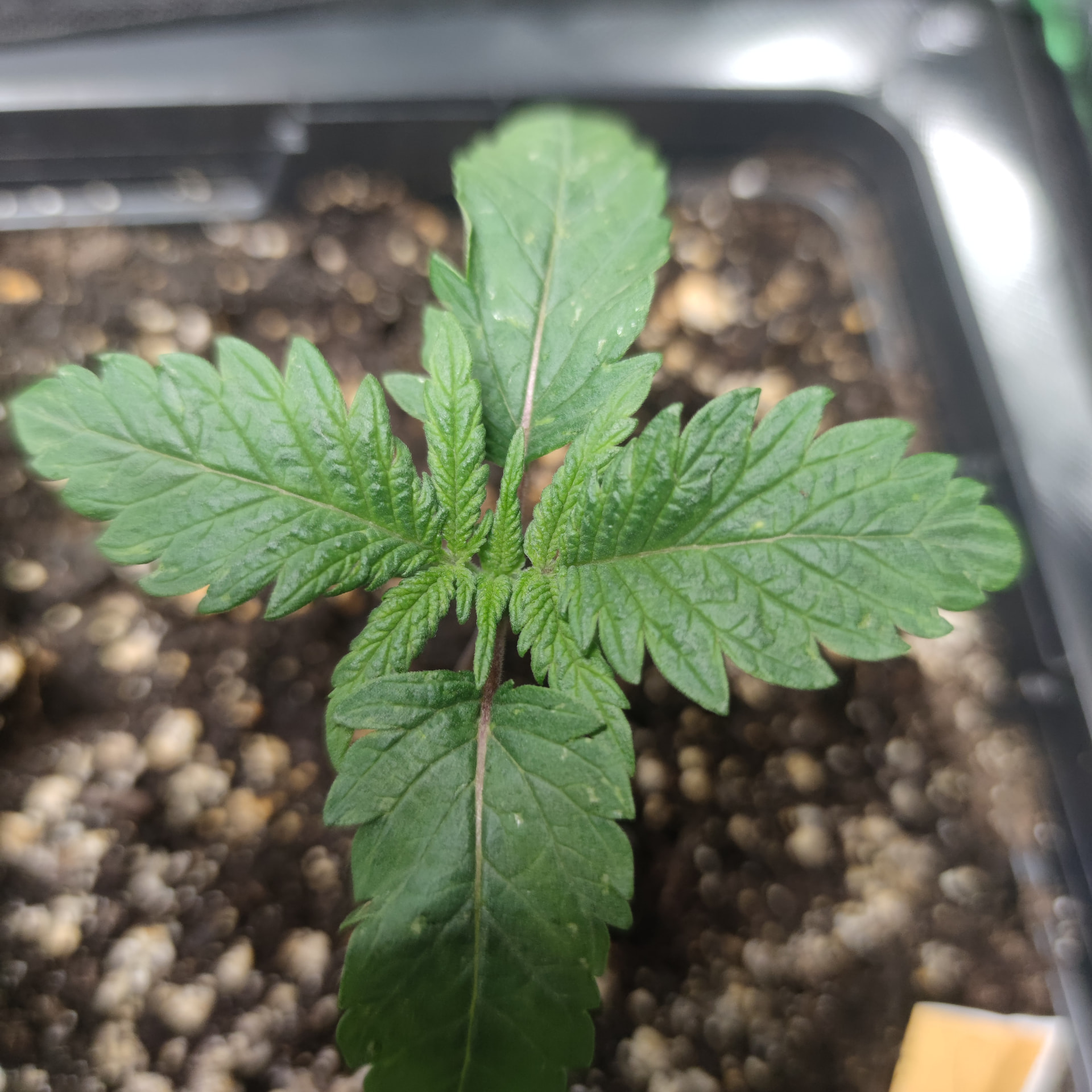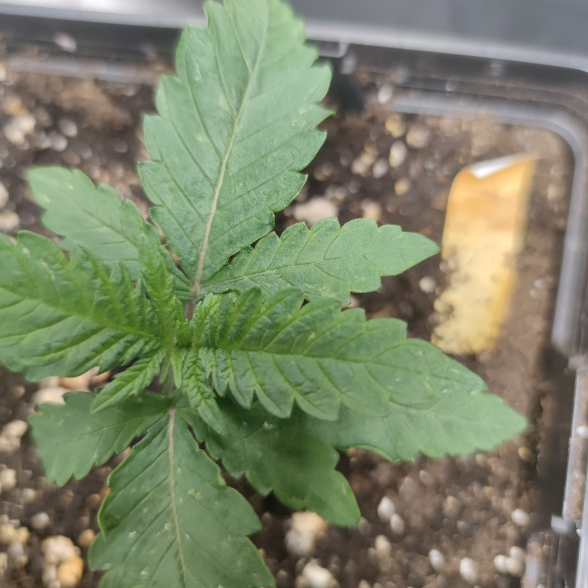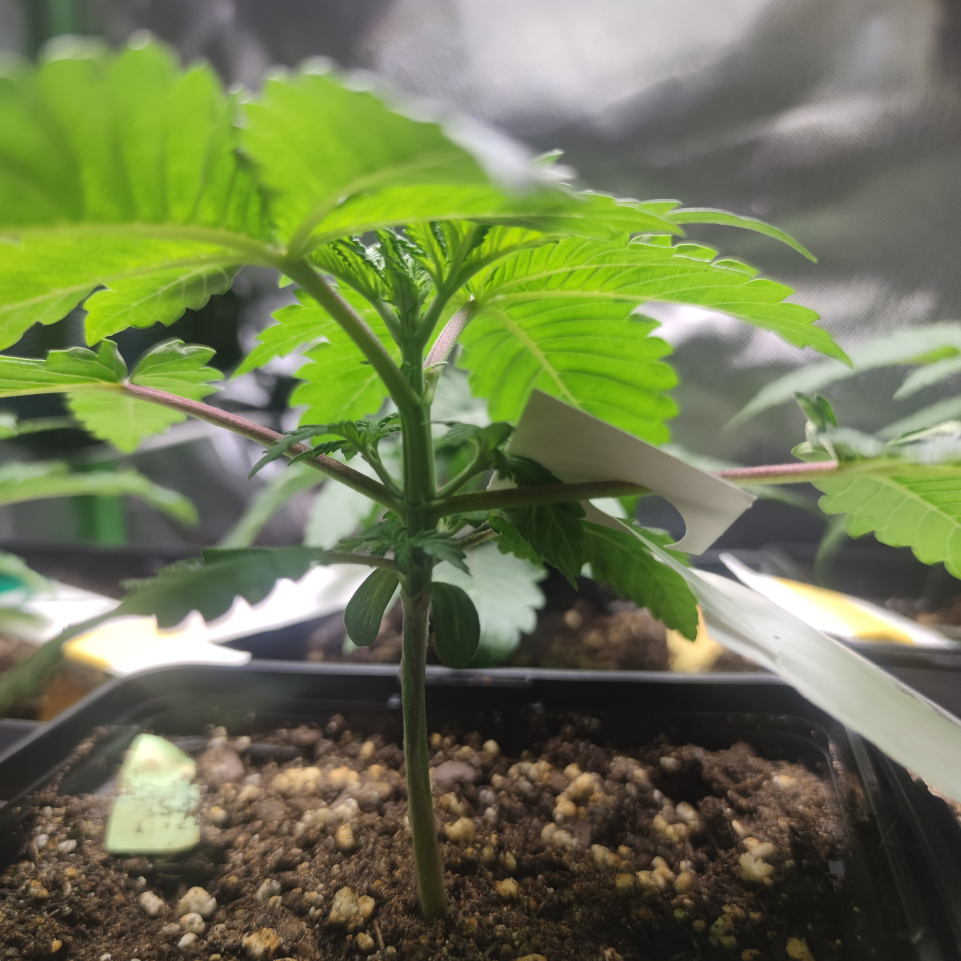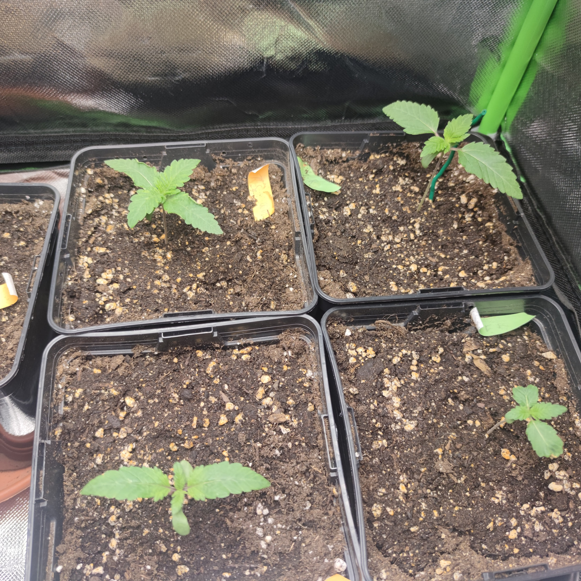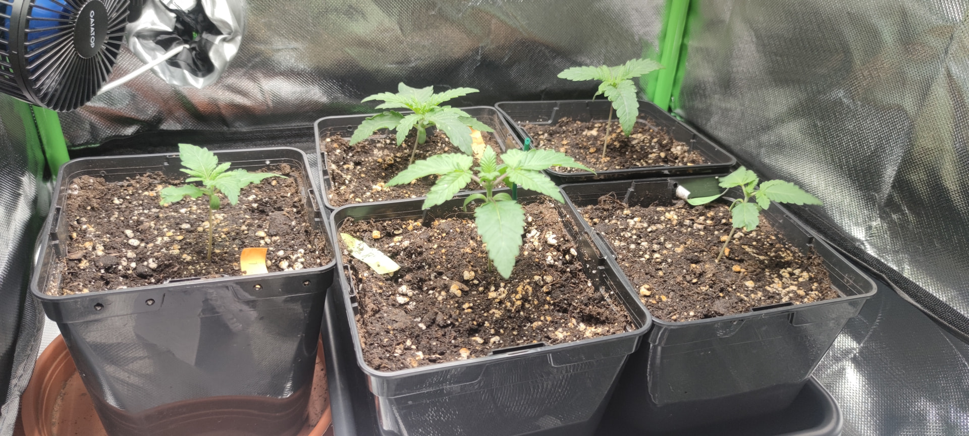 Inzwischen machen die kleinen eine echt gute Figur, wir haben 4 gesunde Nodien bei der Größten, interessanterweise sehen die Blätter bei allen typisch indica aus, obwohl die Tangerine Sugar ja Sativa hybrid ist. Die Raubmilben, Milben da so rum und fressen sich satt. Scheint auch schon weniger zu werden mit den Tripsen.