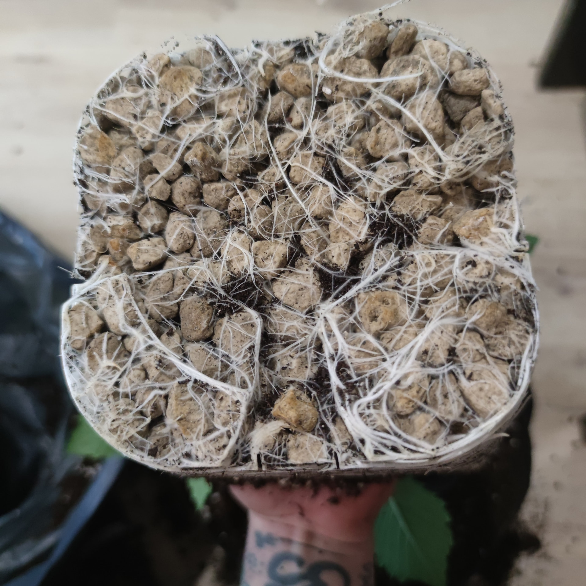 Die Steine hab fielen bereits dadurch ab, dass ich die Pflanzen nach dem kopfüber aus dem Topf entnehmen und danach umdrehen.