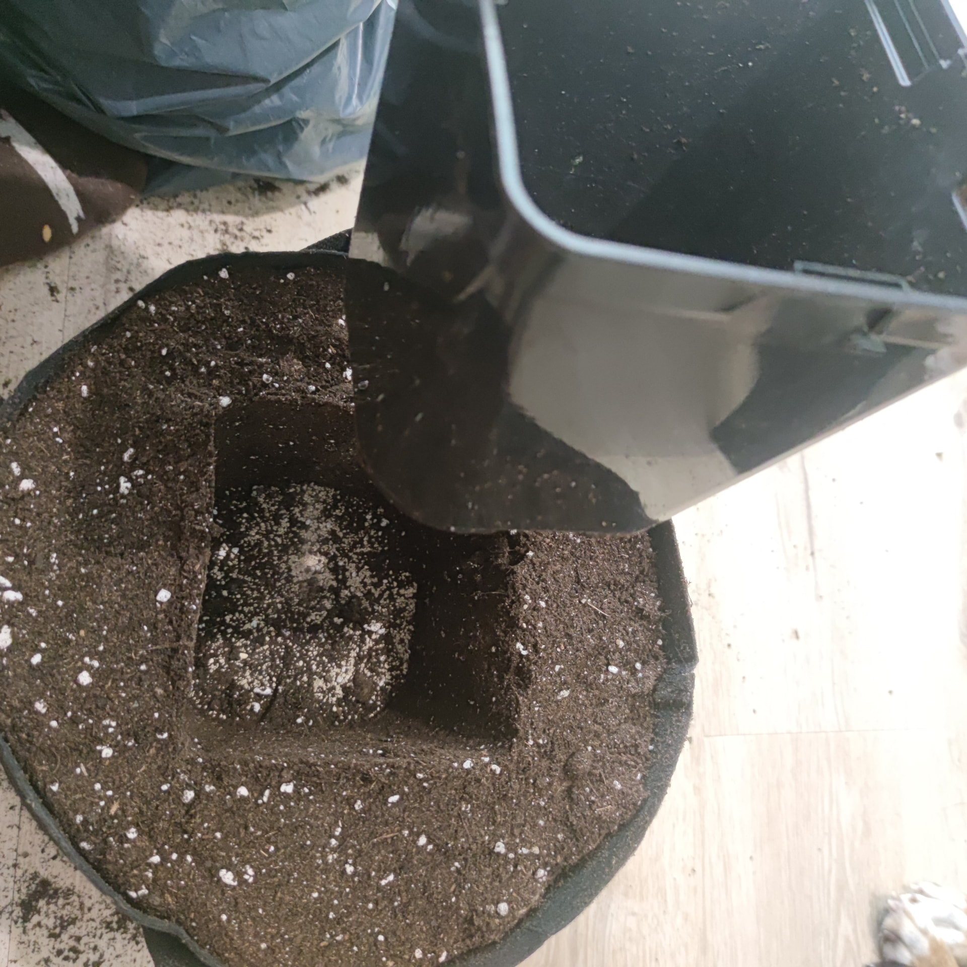 Heute war es soweit, ich hab mich ans große Umtopfen gemacht. Es waren noch Reste des letzten Bio bizz light Mix Sacks übrig, mit dem neuen 50L Sack. Also gab es heute nur eine Erde, alles Bio und organisch, so wird es nun auch beim gewohnten Set Up bleiben. Damit hab ich ja nun auch schon etwas Erfahrung sammeln dürfen, hoffe dass was ich nun in die Flecken an der Pflanze interpretiere, richtig ist.