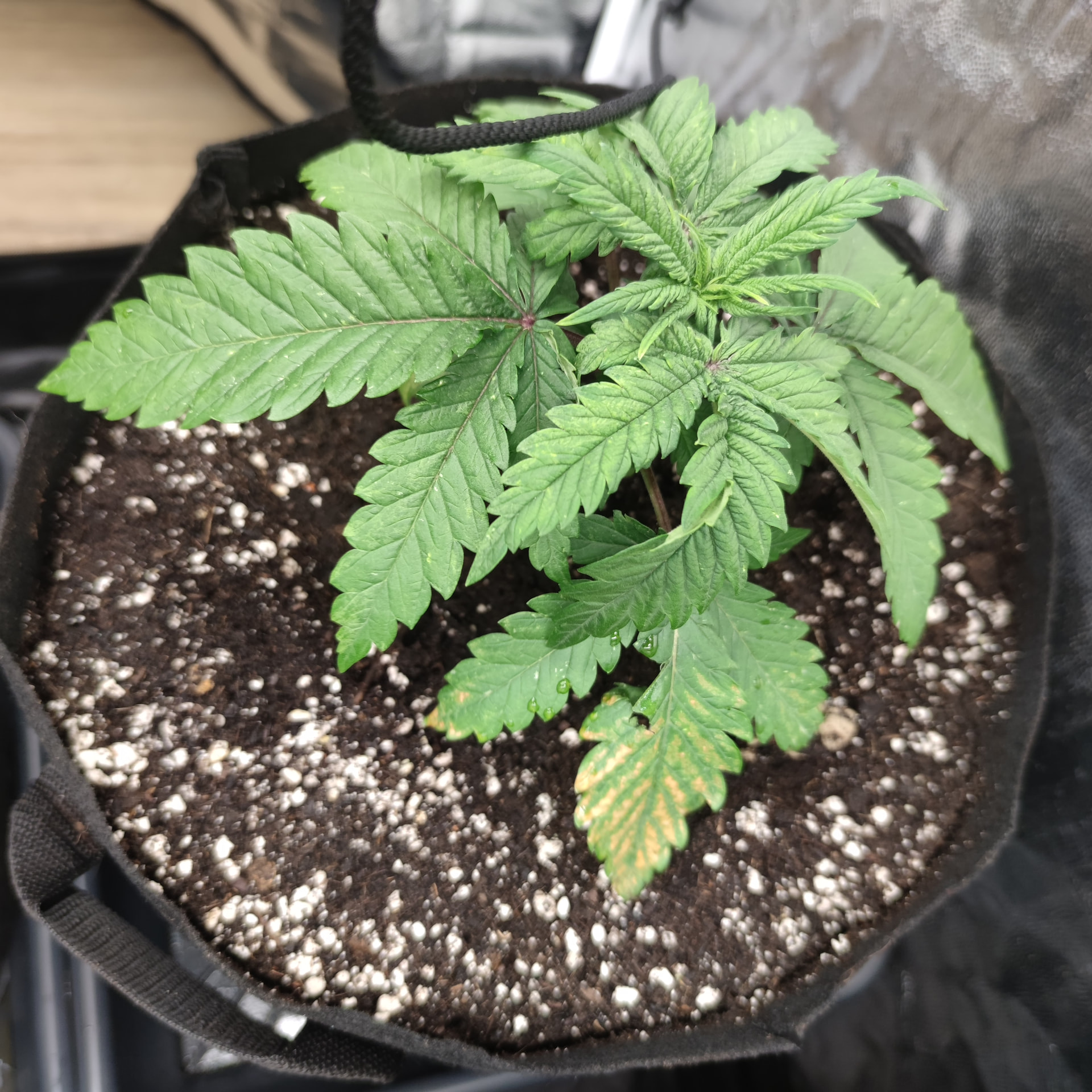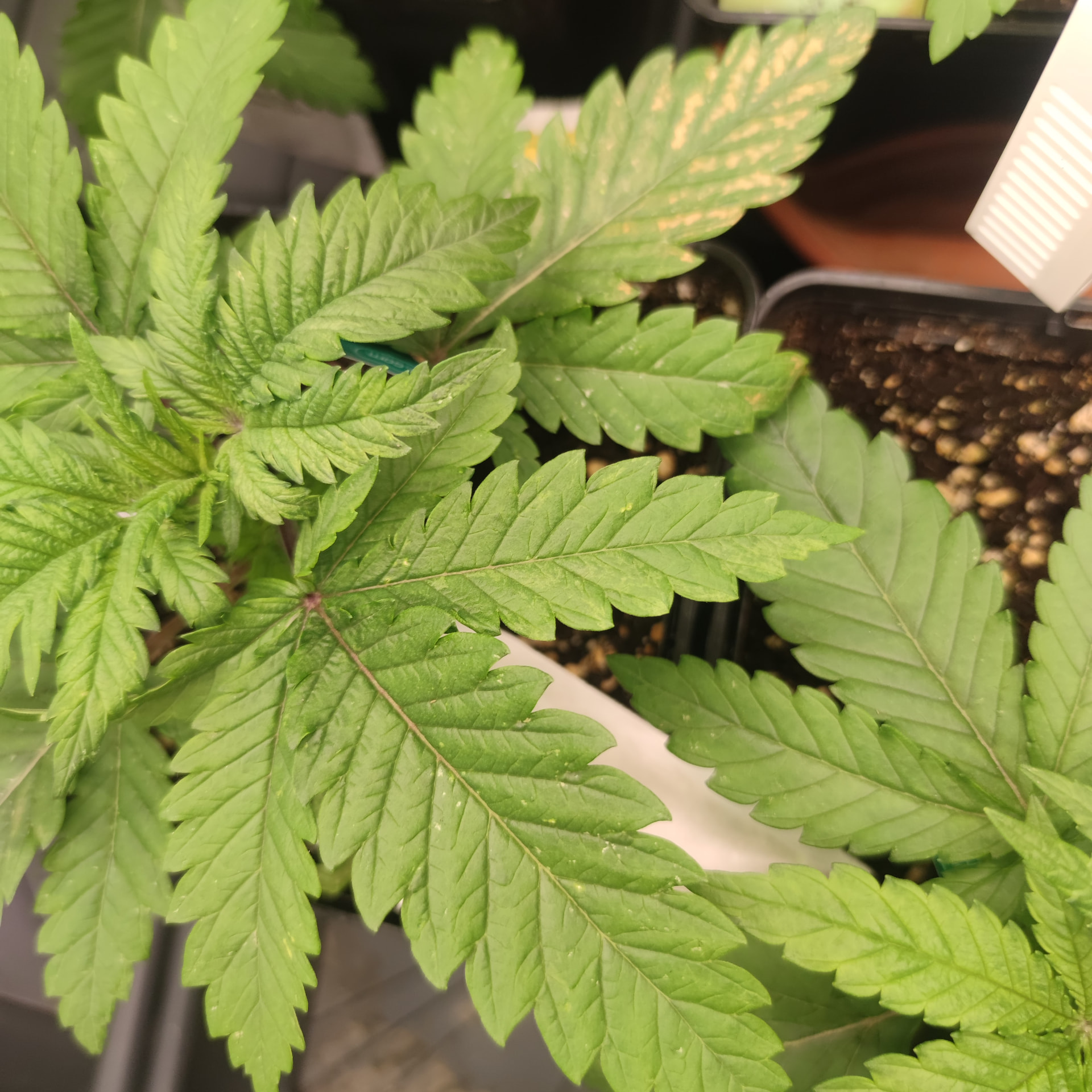 Ich hab die Pflanzen vor 2 Tagen ins große Zelt gesetzt und die Leistung der großen Lampe tut den kleinen richtig gut. Die sind explodiert.in den letzten 48 Stunden. Die Tripse Flecken haben sich nicht weiter ausgebreitet nachdem ich die Raubmilben mit ins Spiel gebracht habe. Heute morgen sahen die Pflanzen auch noch Recht vital aus. Nun hab ich an einer der Tangerine sugar gelbe Flecken entdeckt.